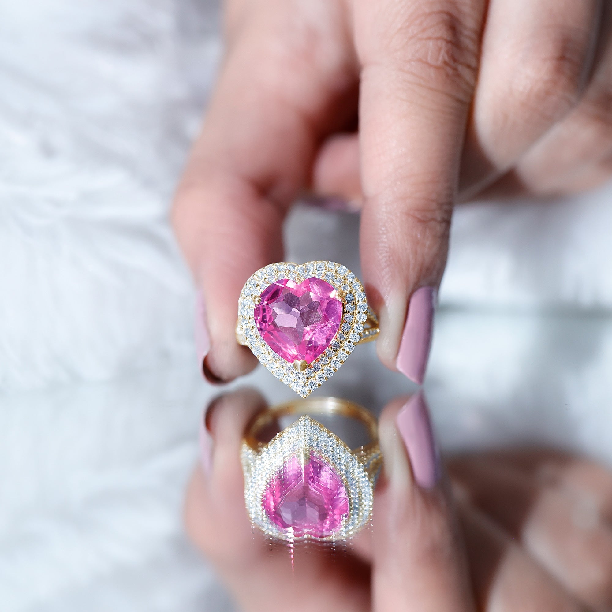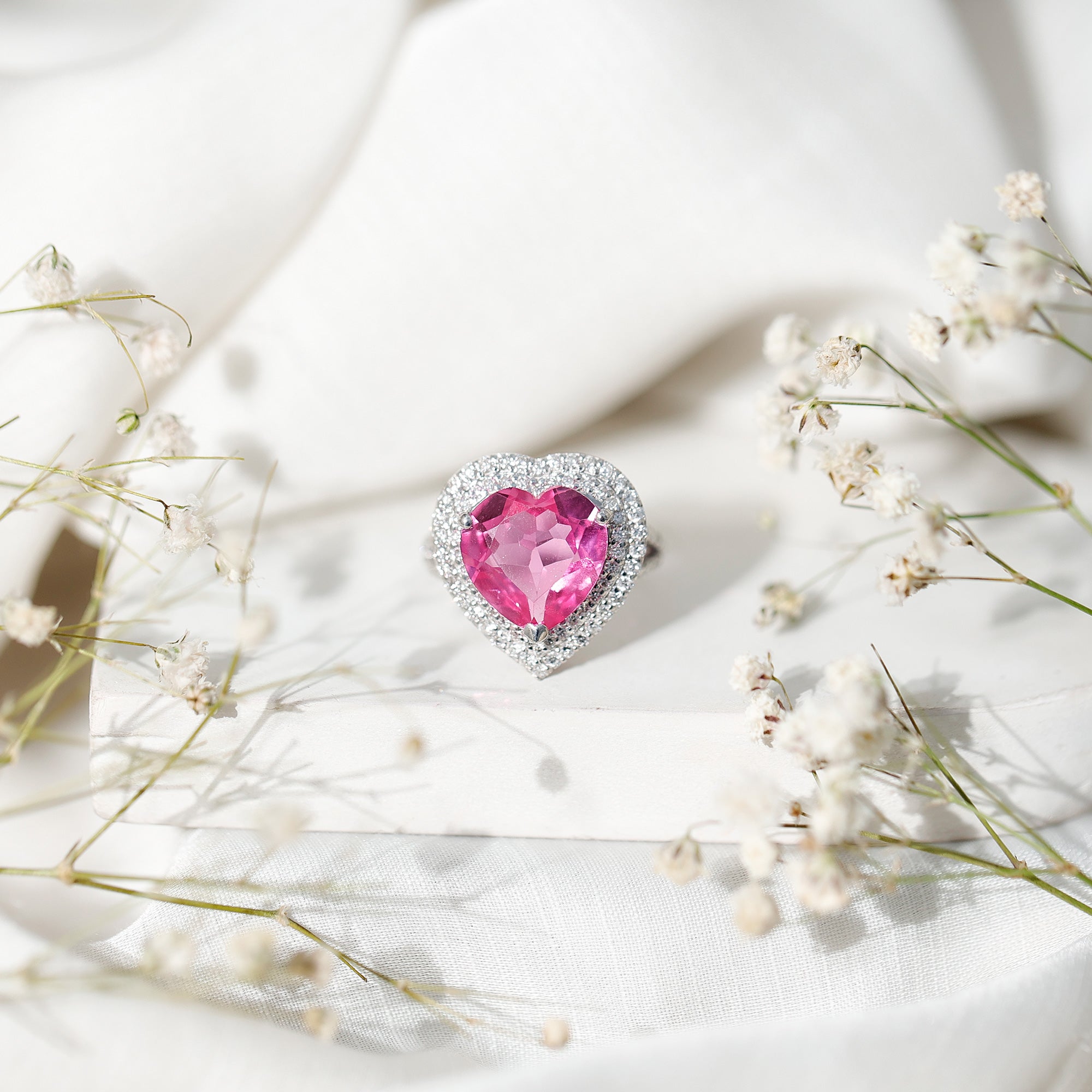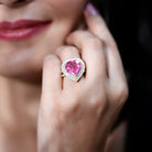 Designed to turn heads, this Huge Engagement Ring makes a strong and unforgettable statement. At its center is a striking 12 MM heart shaped lab created pink sapphire, set securely in a prong setting. The bright pink color instantly draws attention and gives the Statement Ring a glamorous and luxurious look. Encircling the center stone is a double halo of lab grown diamonds that adds extra shine and enhances the beauty of the sapphire. The split shank band is also accented with more round cut lab grown diamonds, bringing added sparkle and a modern touch to the overall design. Every detail is thoughtfully crafted to highlight the large center stone while keeping the Pink Sapphire and Diamond Engagement Ring balanced and elegant. Perfect for many occasions, the Double Halo Ring can be worn as an engagement ring, a cocktail ring, or a special statement piece. Its bold design makes it ideal for women who love standout jewelry with personality. Comfortable enough for long hours wear and dramatic enough for evening events, this Pink Sapphire Heart Ring adds confidence, charm, and elegance to any look.