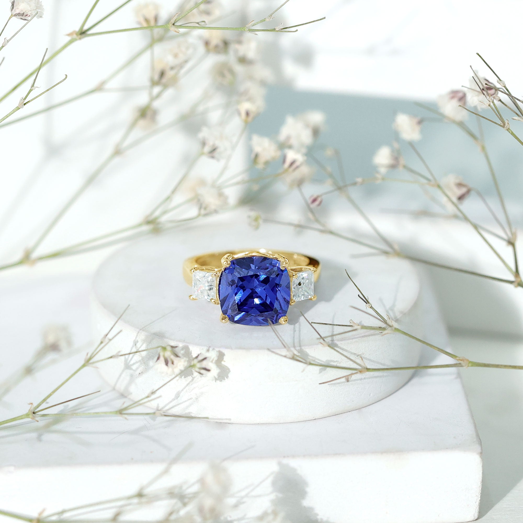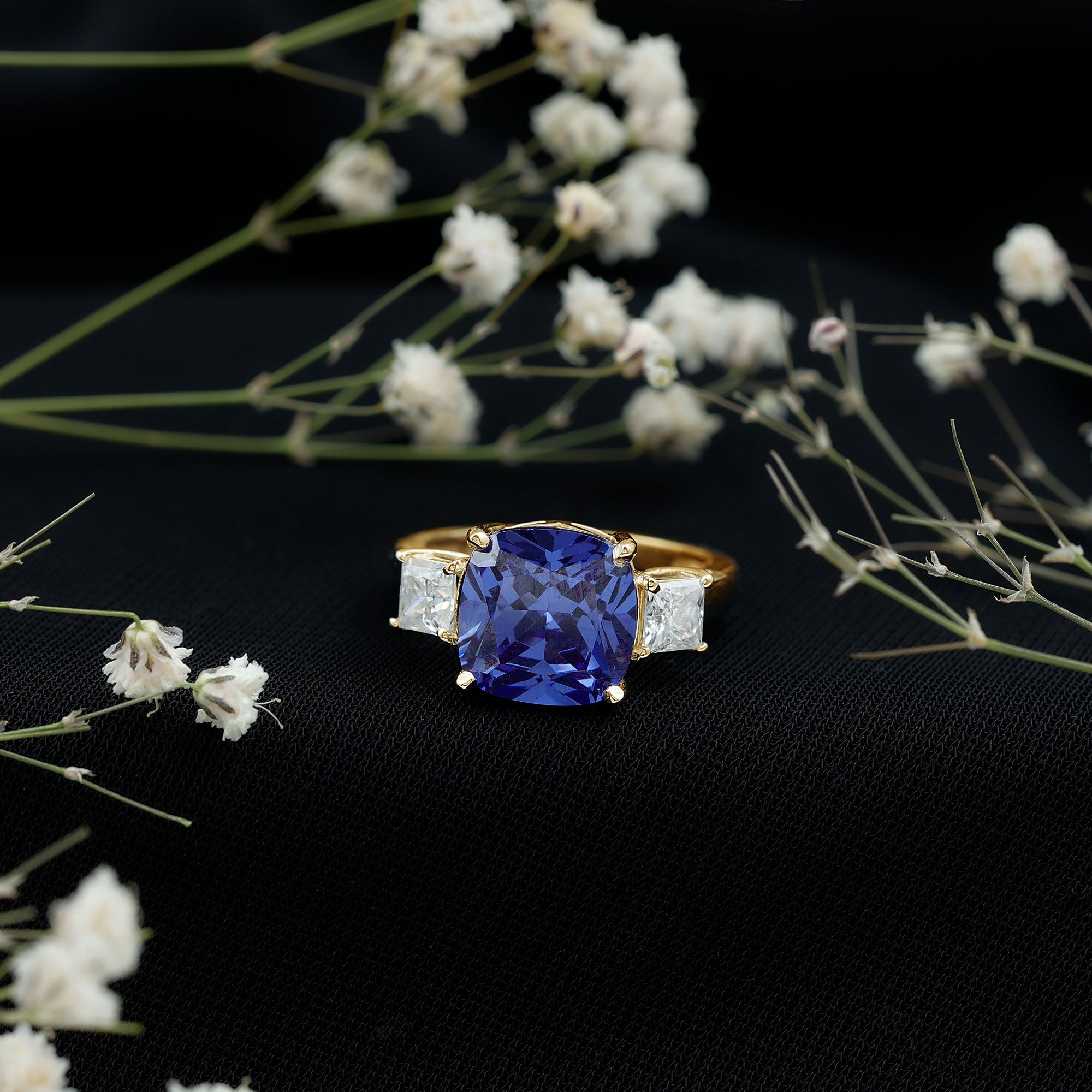 Embrace royal charm with this stunning Lab Grown Blue Sapphire Engagement Ring, a piece that combines modern brilliance with timeless elegance. At its center rests a 10 mm Cushion Cut Lab Created Blue Sapphire set in Claw Setting, radiating a deep, captivating hue that evokes loyalty, wisdom and everlasting devotion. Placed alongside it are four 4 mm Princess Cut Moissanite stones, adding a sparkling contrast that catches the light with every subtle movement, creating a mesmerizing dance of shimmer and color. The 3 Stone design is bold yet graceful, with each gemstone carefully set to highlight the rich AAAA Quality Lab Blue Sapphire, while the Moissanite stones of D-VS1 Quality enhance its majestic beauty. Perfect for a proposal or a milestone celebration, this 3 Stone Engagement Ring transforms a simple moment into a cherished memory, symbolizing a love that is both strong and luminous. This Big Engagement Ring comes presented in a signature jewelry box, adding a touch of sophistication and surprise to your special occasion. Available in a range of ring sizes, this Lab Blue Sapphire Ring for Women ensures a flawless fit, letting your partner wear it comfortably. A harmonious blend of modern sparkle and regal elegance, it is a declaration of a love story that is as extraordinary as the bond it celebrates.
