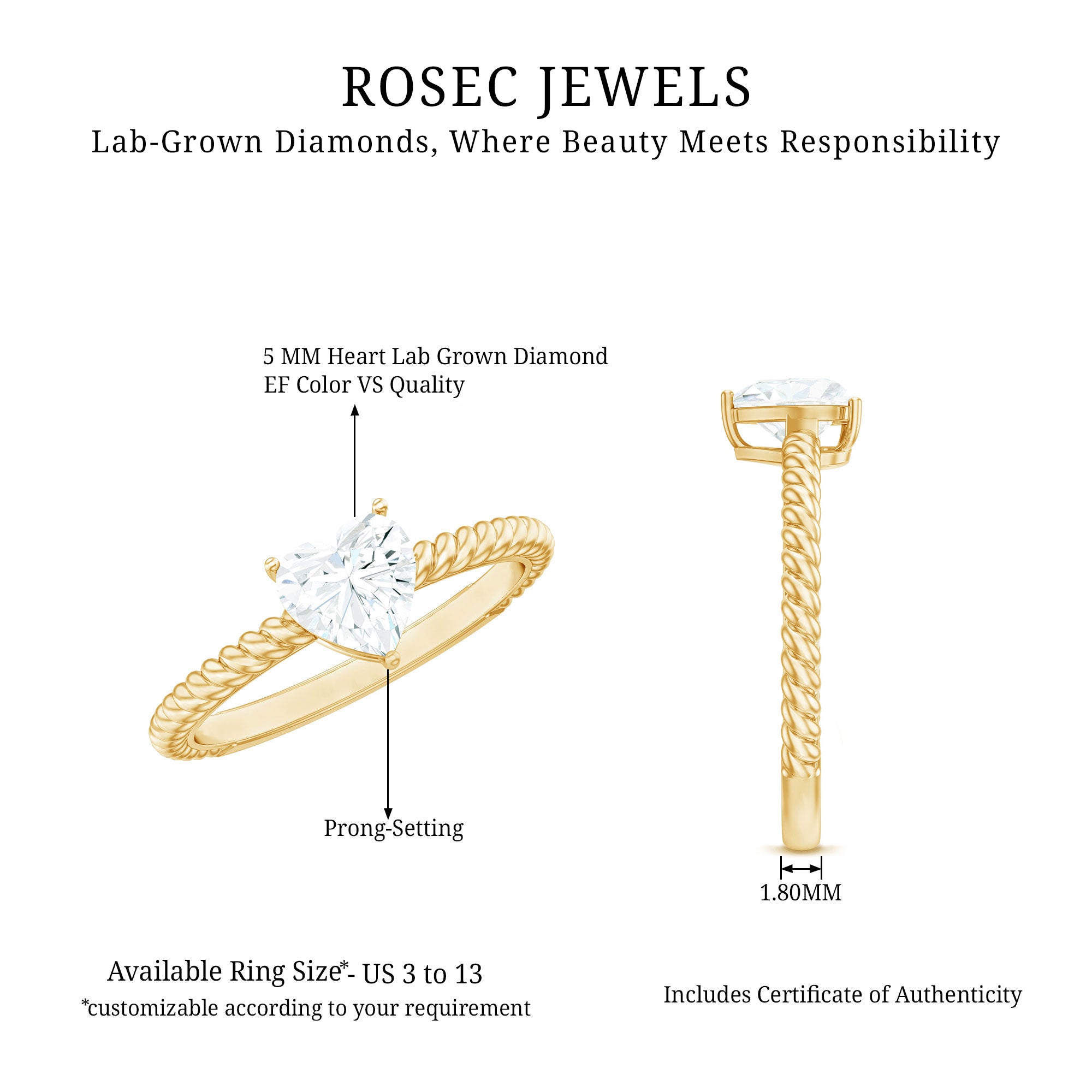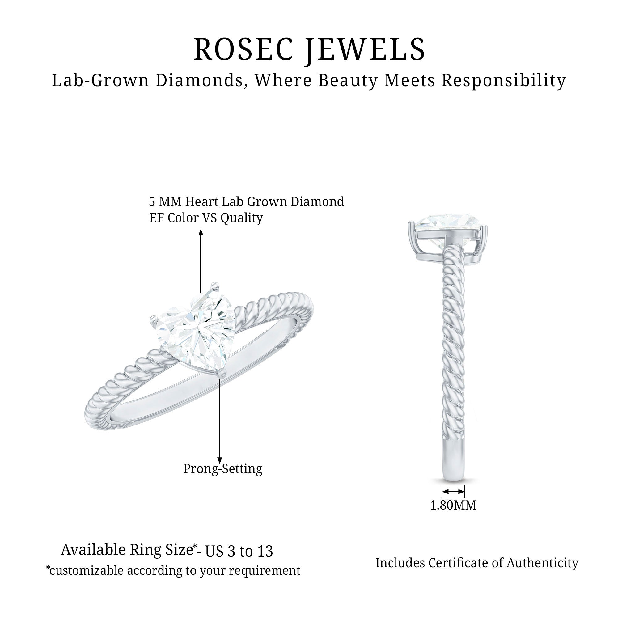Embrace a love that speaks from the heart with this stunning Lab Grown Diamond Ring as a timeless token of love and affection. Having a classic appeal that truly focuses on the beauty of the 5 MM Heart Shape Lab Grown Diamond in Prong Setting as Solitaire. The twisted rope seamlessly merges elegance and simplicity, this Solitaire Diamond Ring is perfect for those who desire a meaningful gesture. As a pre-engagement symbol or reaffirming the promise of love and commitment. This Diamond Heart Ring represents a heartfelt vow which is ideal for marking special moments or simply expressing your love as a daily reminder of the promises made and the love that will always bloom.