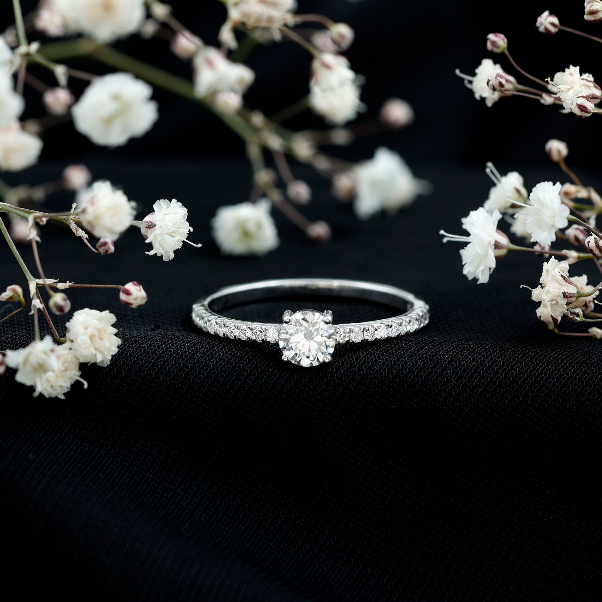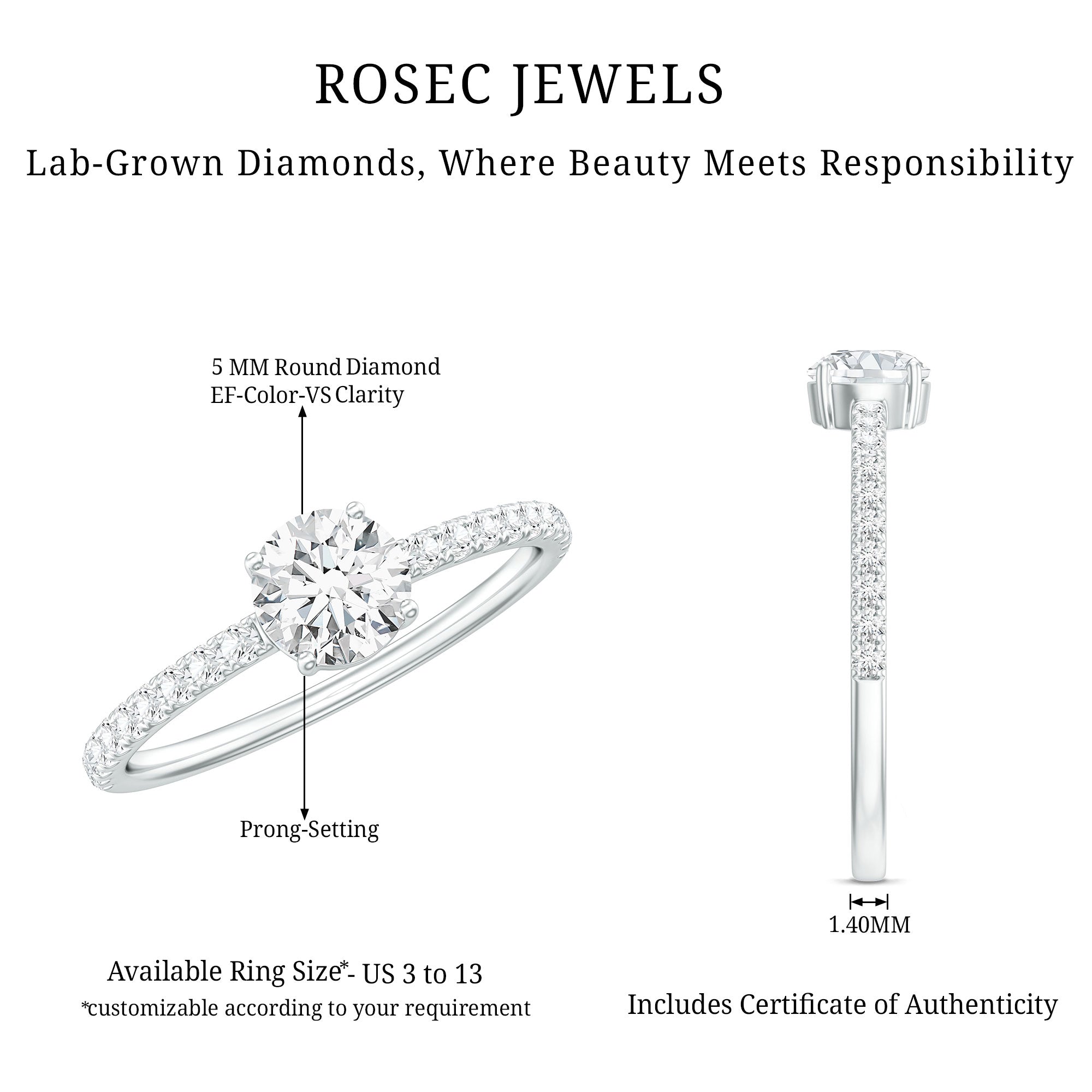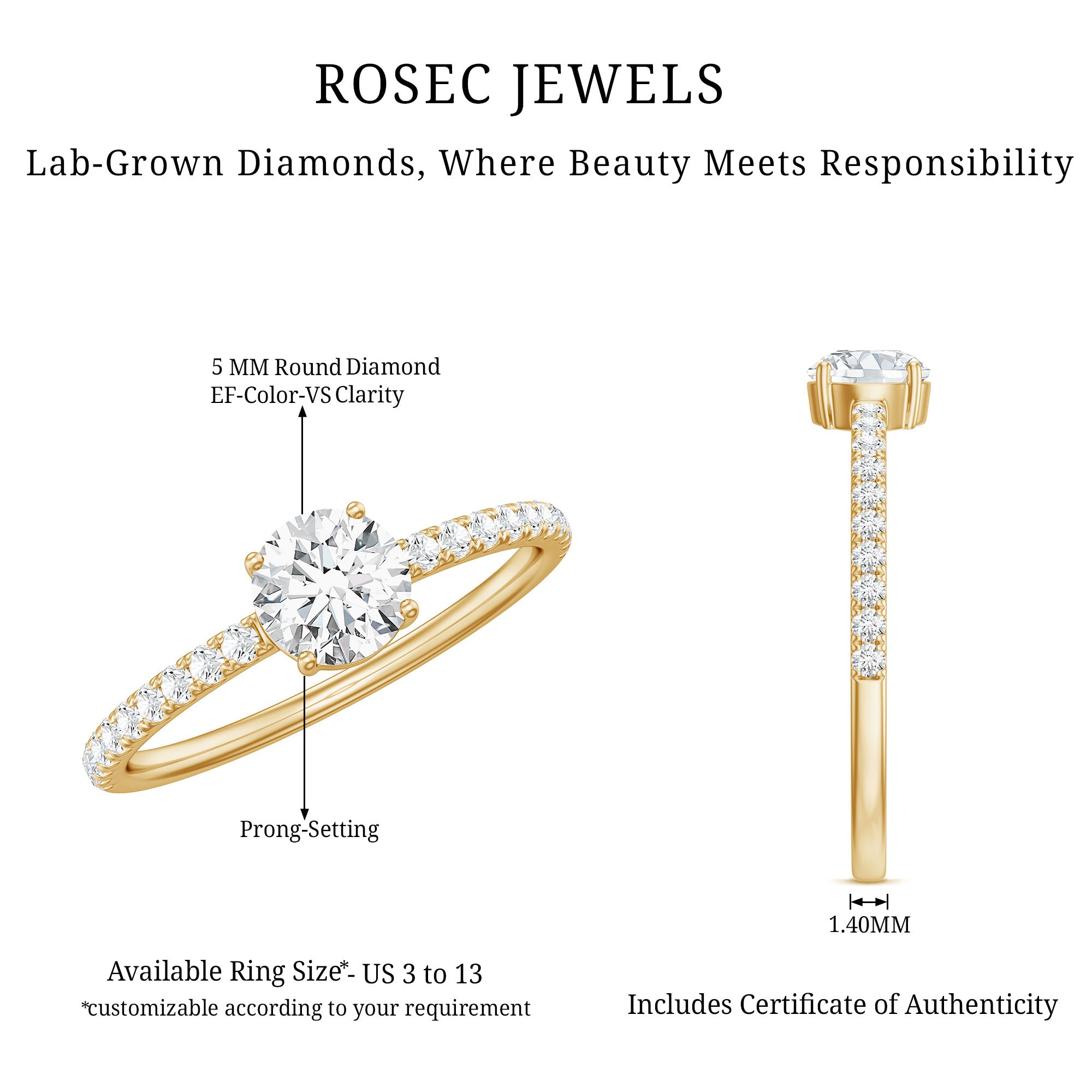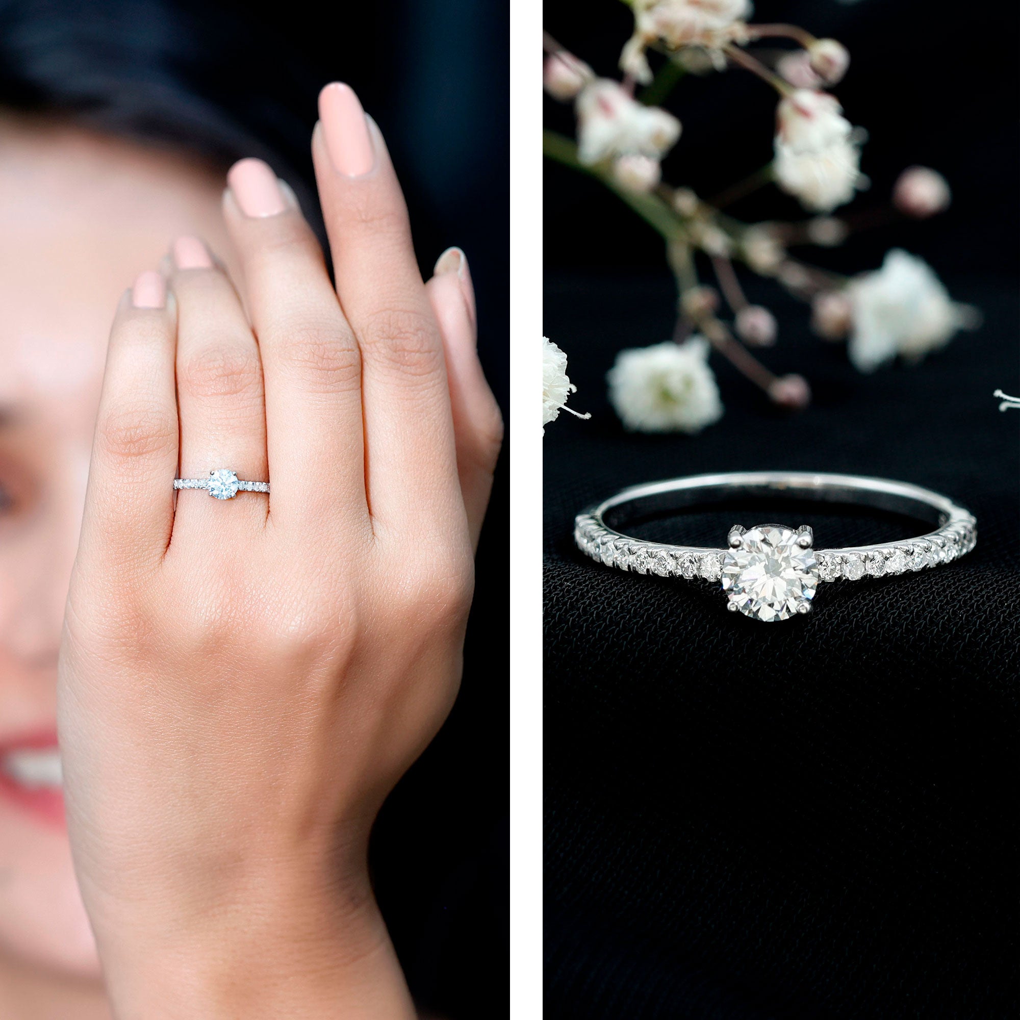 Looking for a minimalist engagement ring, this Lab Grown Diamond Ring is something truly unique. Having understated design and elegance this ring is adorned with 5 MM Round Shaped Lab Grown Diamond in a Classic Prong Setting as Solitaire. The Lab Diamond side stones, enhance the brilliance without overpowering the focal stone. With the minimalist aesthetic, this Minimalist Engagement Ring will surely never go out of style. As a proposal, a commitment or an April birthday gift, a Diamond Ring is sure to be her immediate favorite. If you are looking for something different yet classic it is the perfect choice.