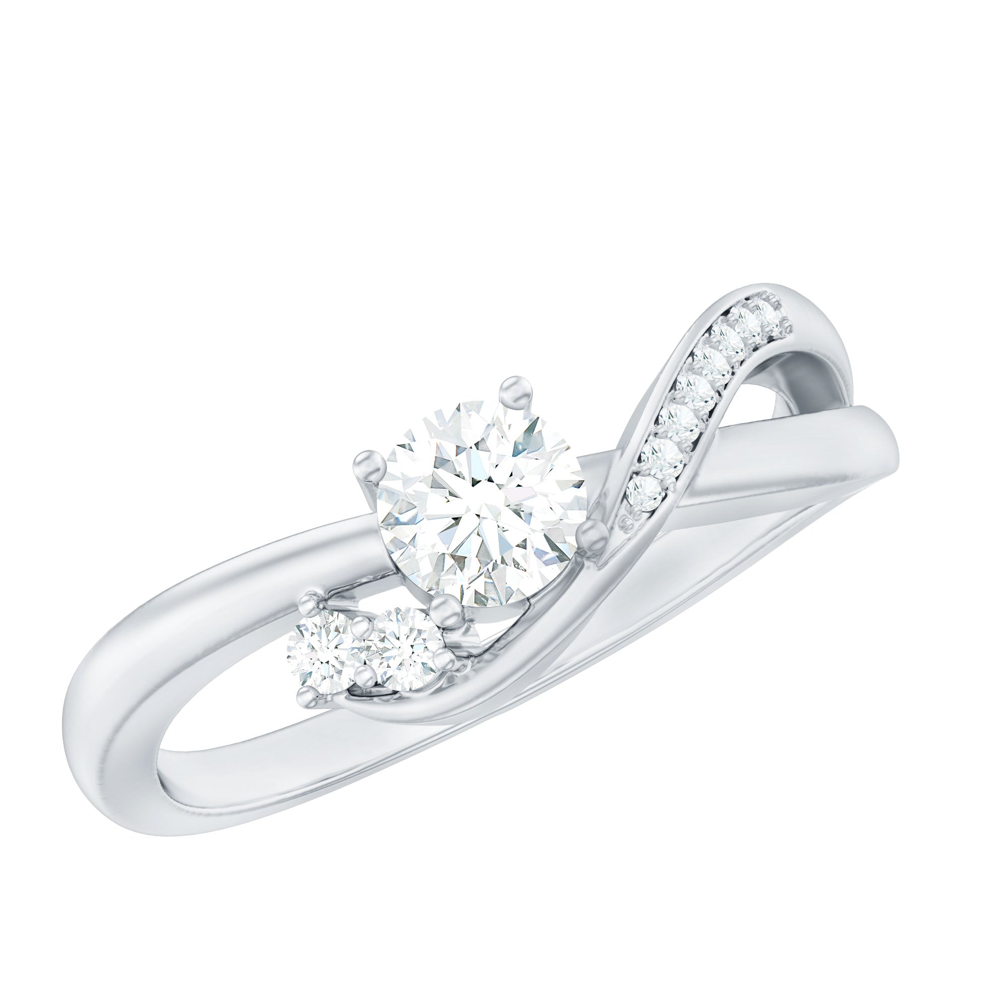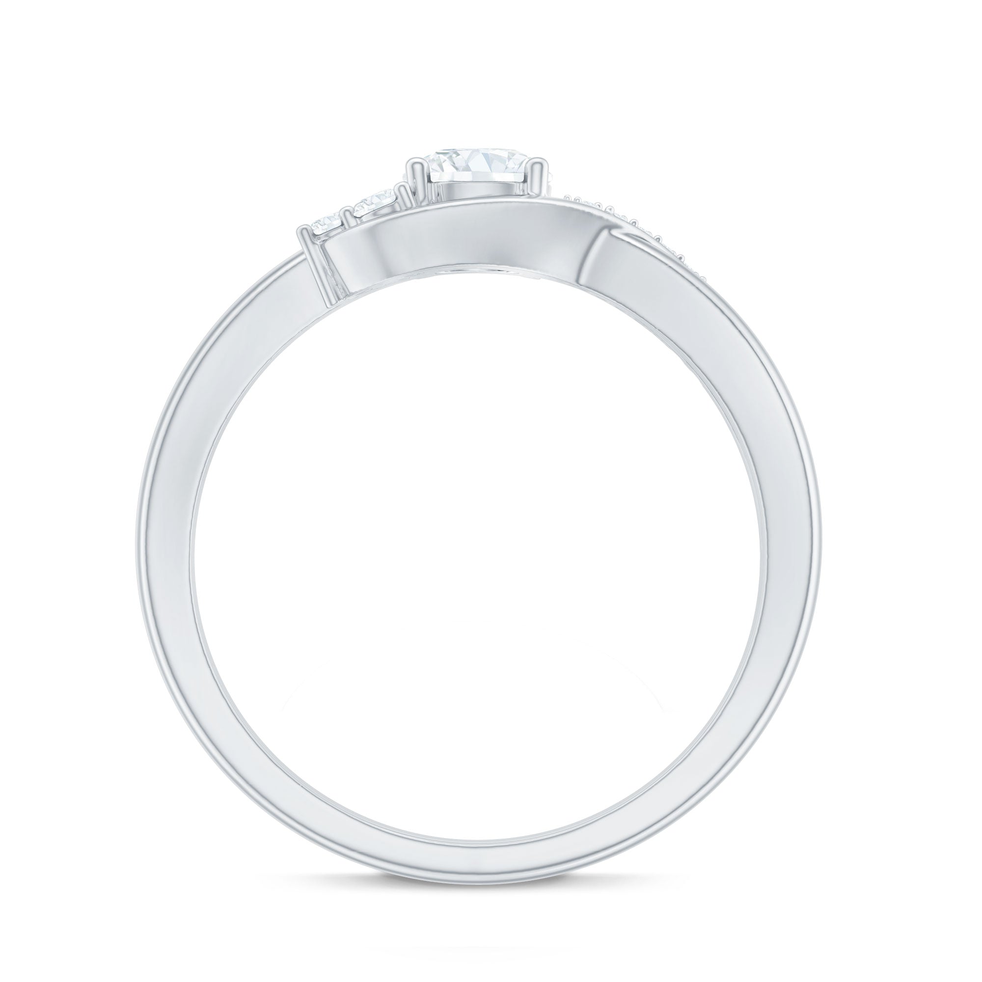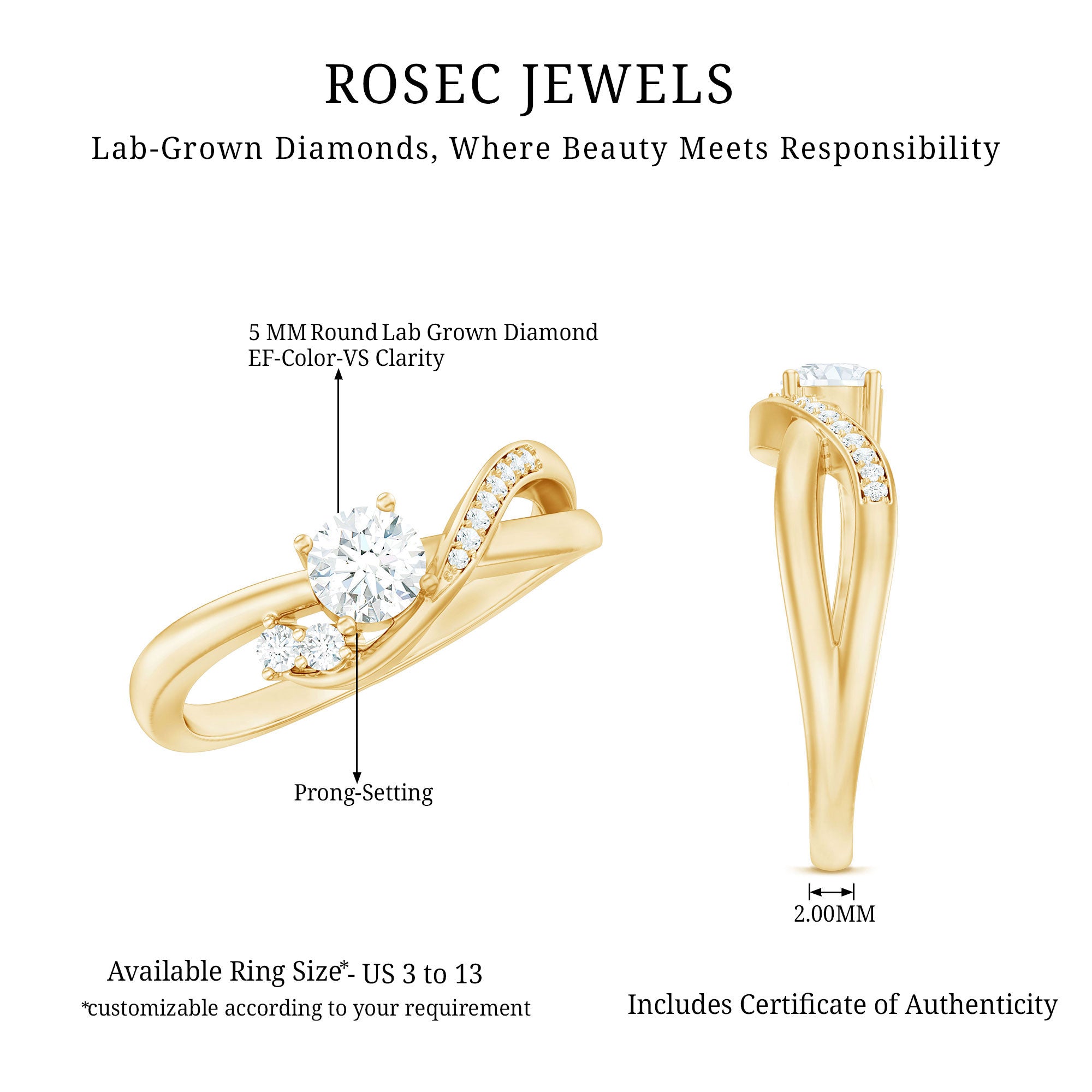 Show your love with this stunning Lab Grown Diamond Ring, perfect for your special someone. This unique Commitment Ring features a stunning 5 MM round shaped lab made diamond of EF-VS quality in the center in prong setting. The infinity inspired promise knot band gracefully weaves around the central stone, symbolizing eternal love and commitment. Two smaller diamonds are set on one side of the band while the other side is decorated with a row of sparkling stones, adding brilliance and sophistication. The intricate craftsmanship and flowing design make this Diamond Proposal Ring a perfect representation of an unbreakable bond. The Diamond Infinity Ring is designed to shine effortlessly on her finger, adding a touch of luxury to her look. It can be custom ordered in any finger size and comes in a variety of metal color options.