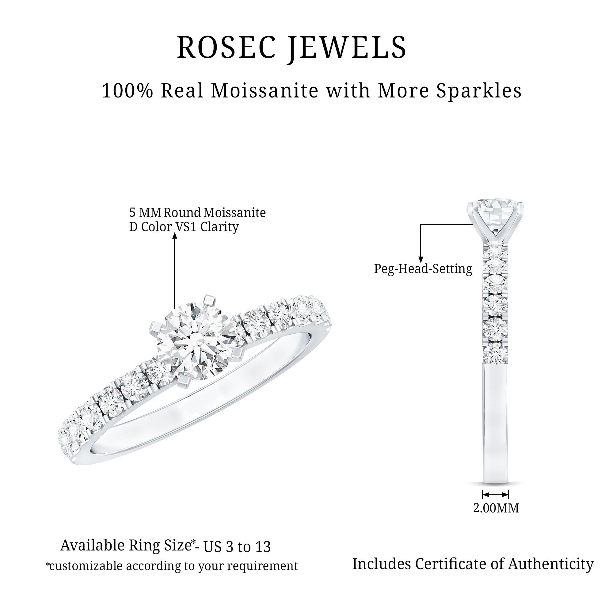 Discover sophistication in this Moissanite Solitaire Ring. It is adorned with 5 MM Round Shape Moissanite securely placed in Prong Setting at the center of the ring. This Moissanite Traditional Engagement Ring not only exudes opulence but also depicts the timeless elegance that remains eternally in Style with the D-VS1 quality which gives a luxurious look to the ring. The band of the ring is adorned with petite Moissanites that add an extra layer of shine to the ring. This Classic Engagement Ring will be delivered to you in the premium quality jewelry box for storage.