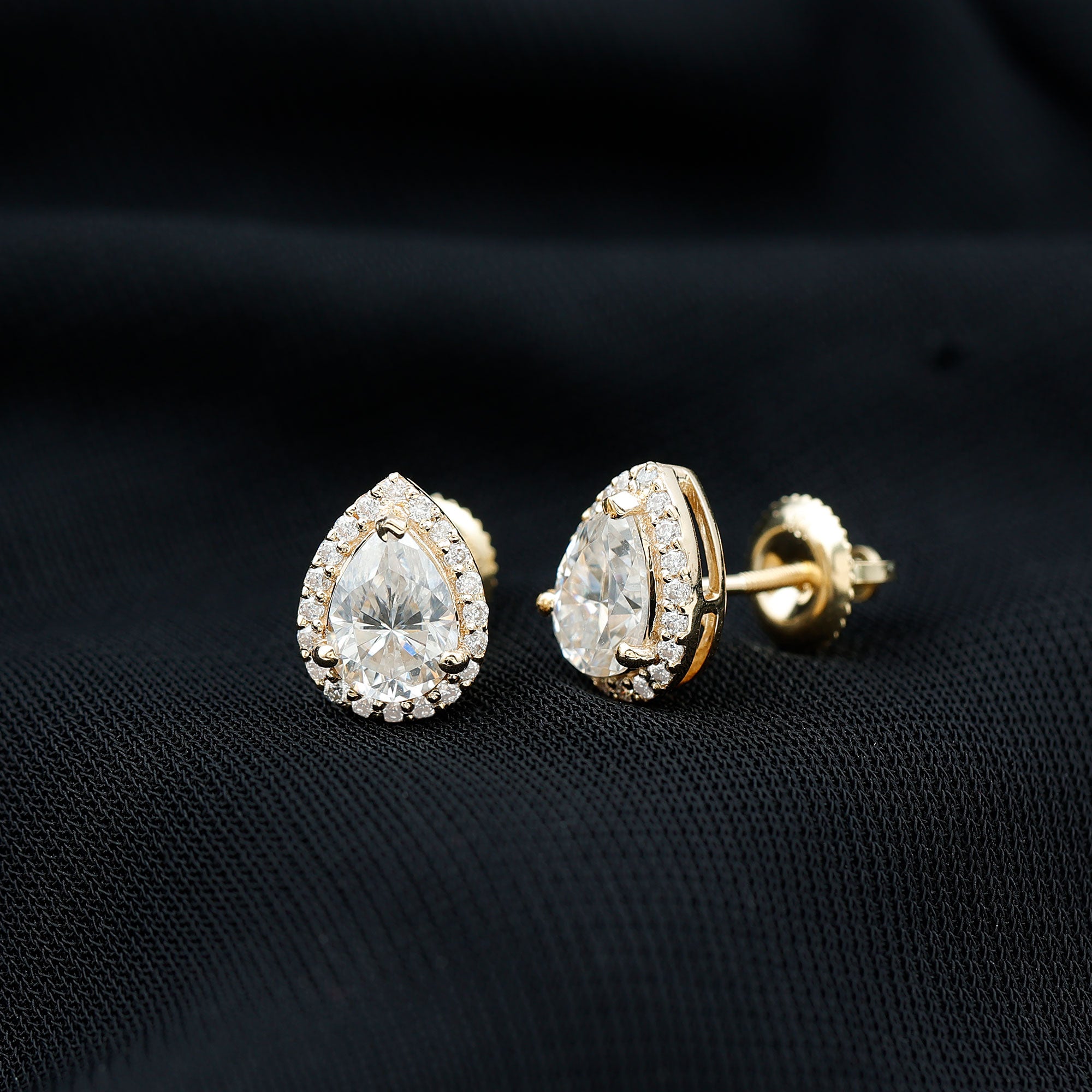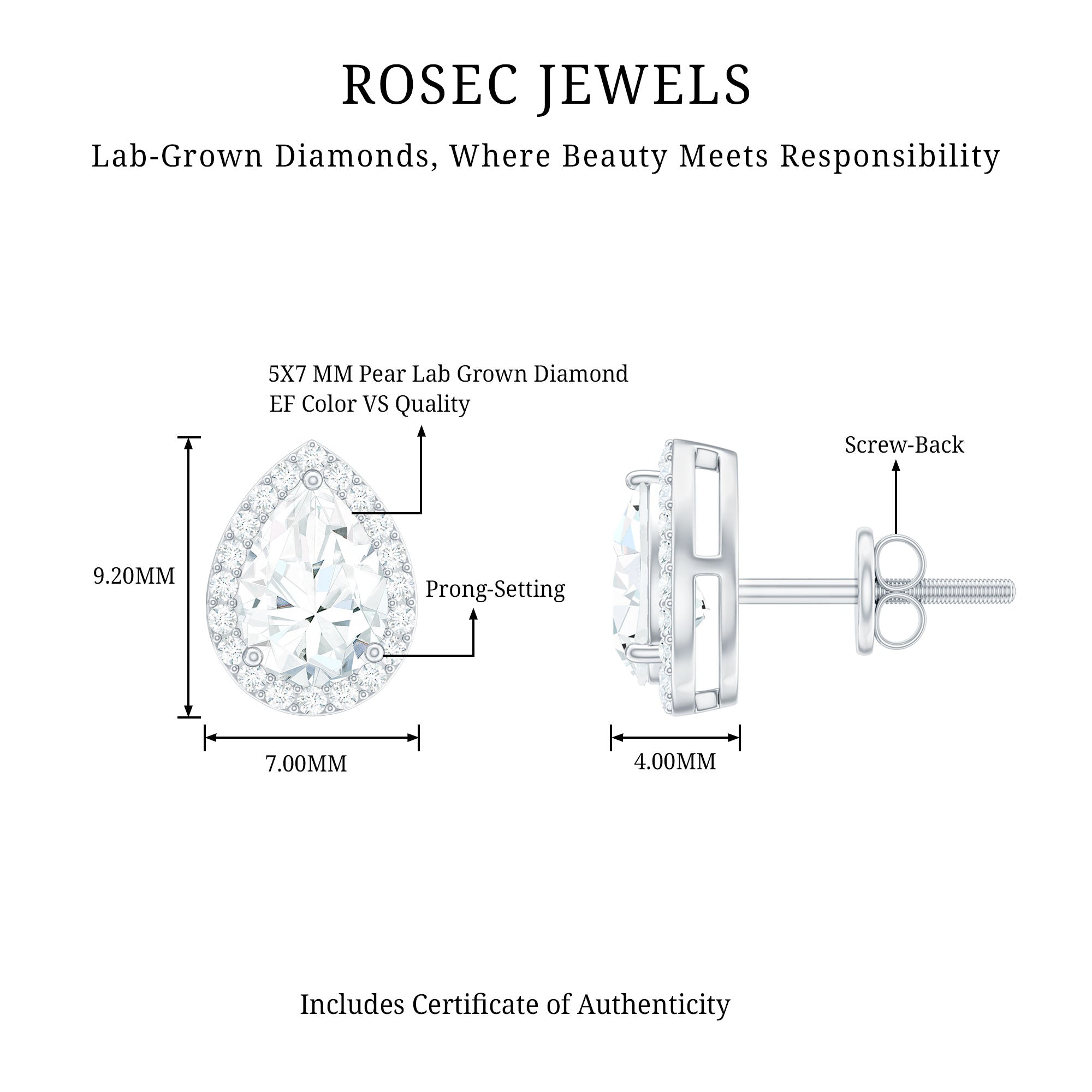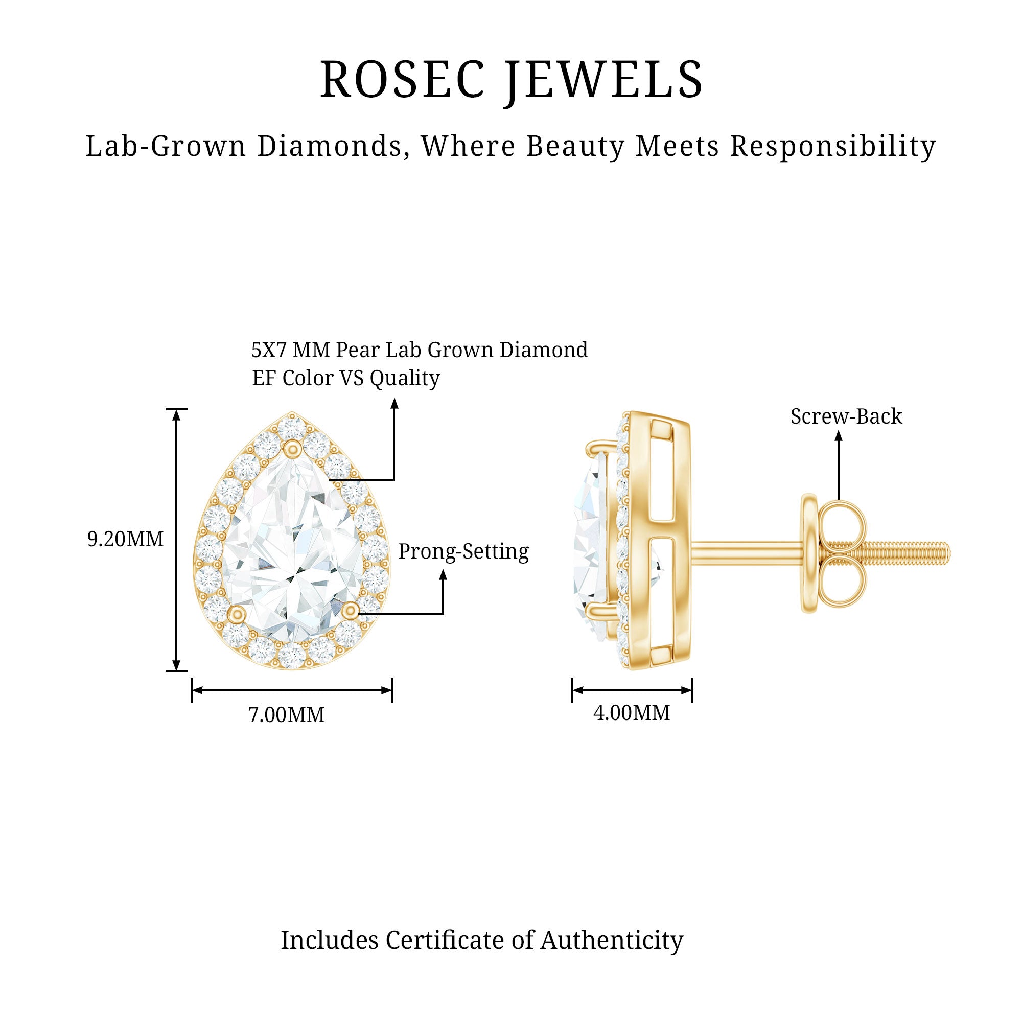 Add some sparkle to D-Day with this Teardrop Stud Earrings. These Classic Earrings are handcrafted with a 5X7MM Pear Shaped Lab Grown Diamond secured with 3 Prong Setting with the Round Shape Diamonds Accent. These Halo Studs will add grace to the statement look of women. This Diamond Stud earring comes with the Screw Back Closure which keeps it on place for a long time. Rosec Jewels is committed in providing you with the best quality products with certified gemstones, likewise, these Halo Diamond Earrings are embedded with EF-VS Quality Diamonds. To ensure that your emotions behind gifting these Pear studs can be conveyed in a proper manner, we ship them in secured Premium Jewelry Storage Box.