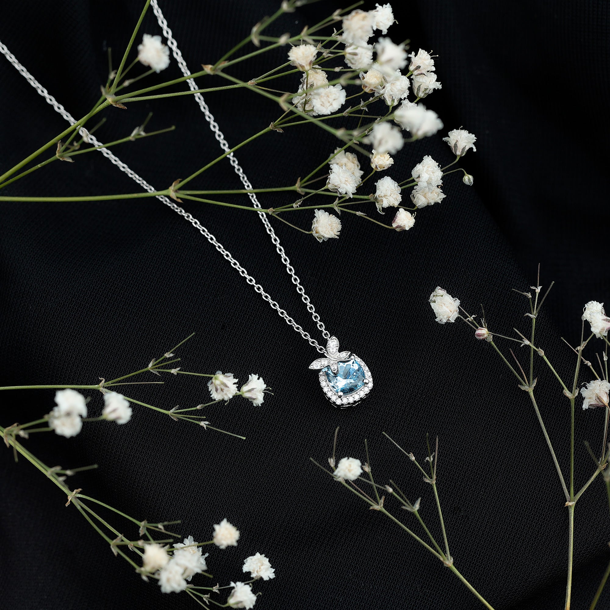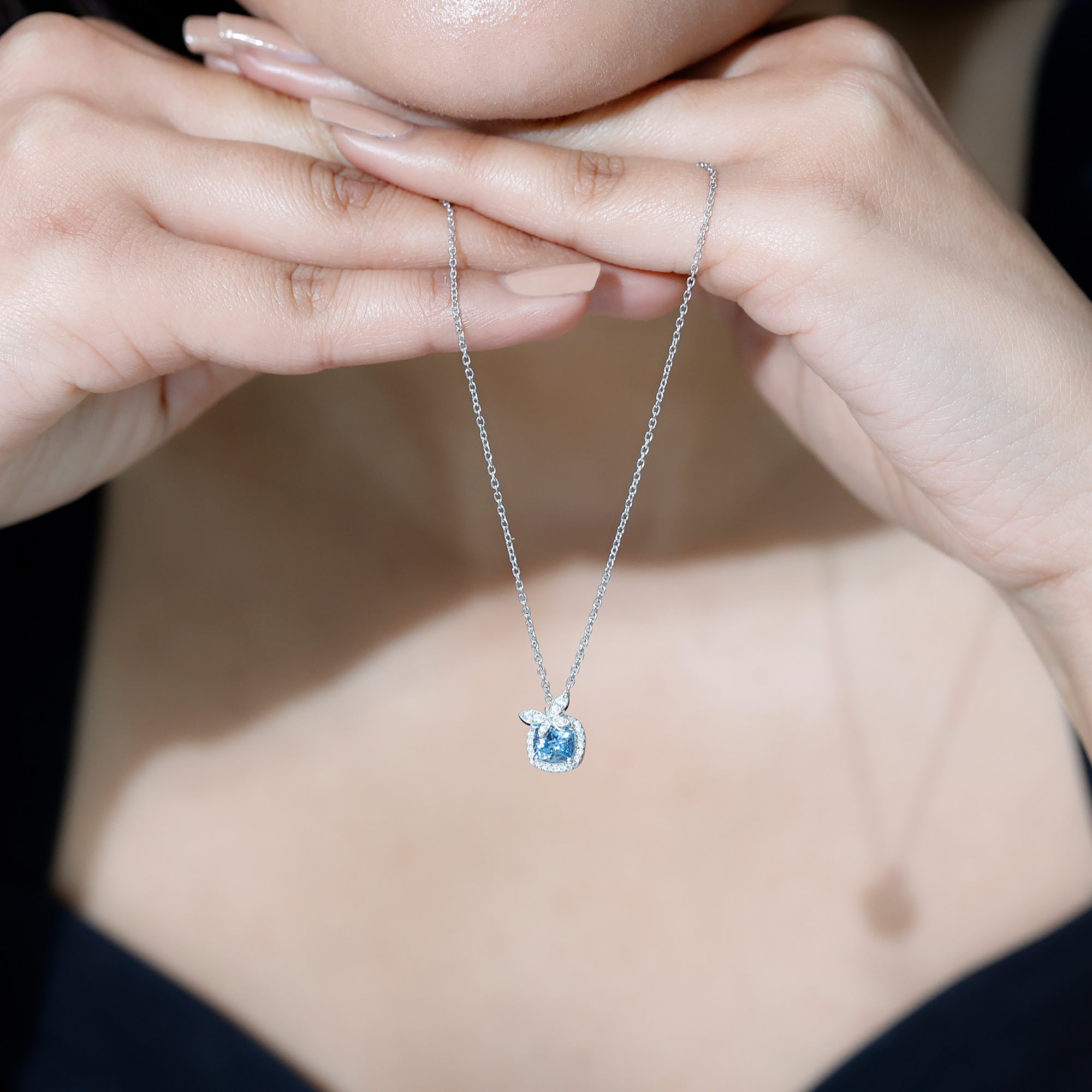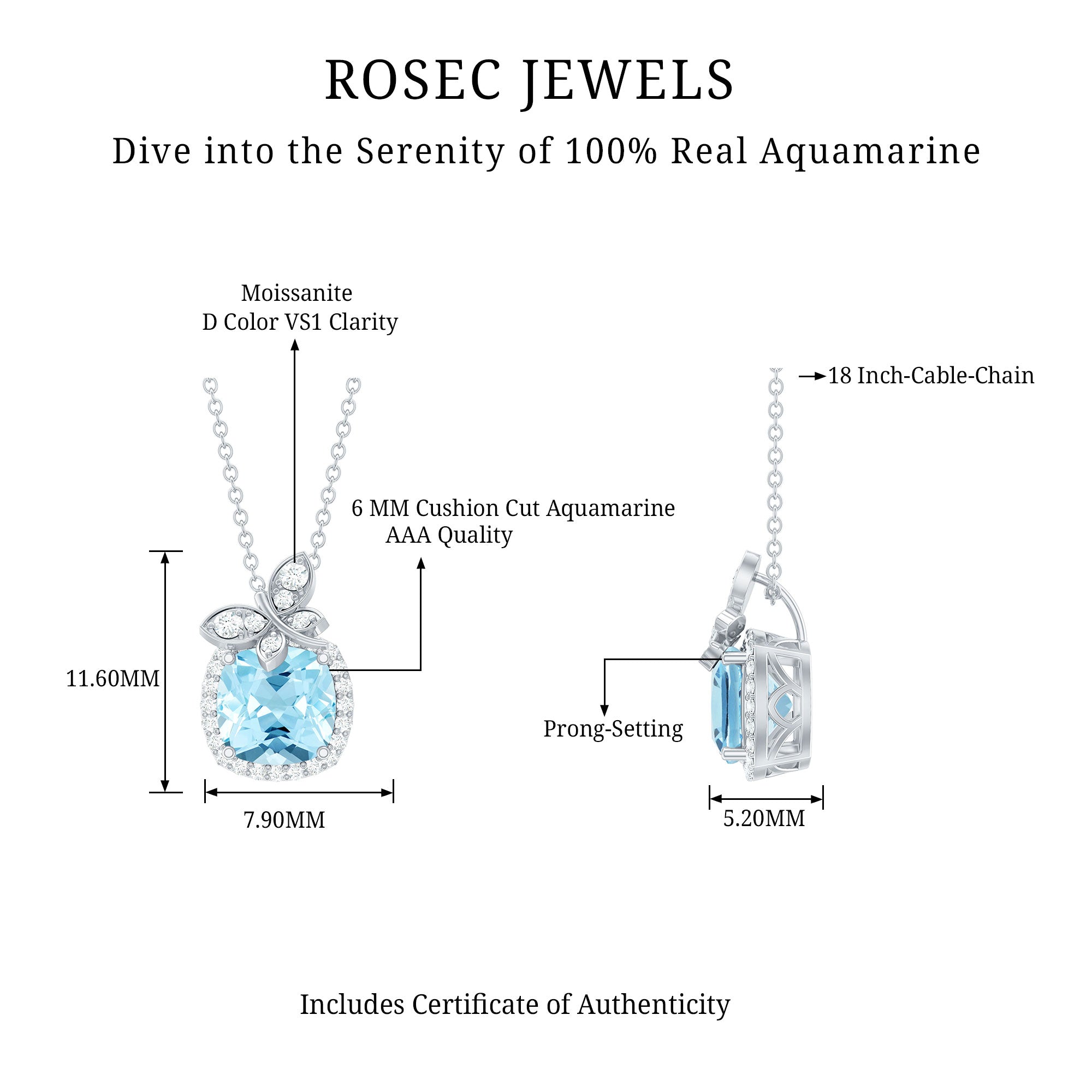 The most beautiful and enchanting Aquamarine Pendant Necklace has mesmerizing blue hues reminiscent of the tranquil sea. Its unique charm and mesmerizing color make it the perfect piece of jewelry that is a feast for the eyes. This Butterfly Pendant is crafted from White Gold Plated Silver and is embellished with 6 MM Cushion Shape Aquamarine in Prong Setting with Moissanite as a Halo. The Butterfly on the top is graced with a Round brilliant cut Moissanite. The stunning combination of AAA Quality Aquamarine gemstone and the butterfly design holds a special meaning that serves as a reminder of an enduring spirit and a bond that transcends time and space. Crafted meticulously, this exquisite Silver Butterfly Necklace reflects the essence of the delicate creature, with an aesthetic interpretation of its journey. So, complement your style by adding a touch of elegance and whimsy.