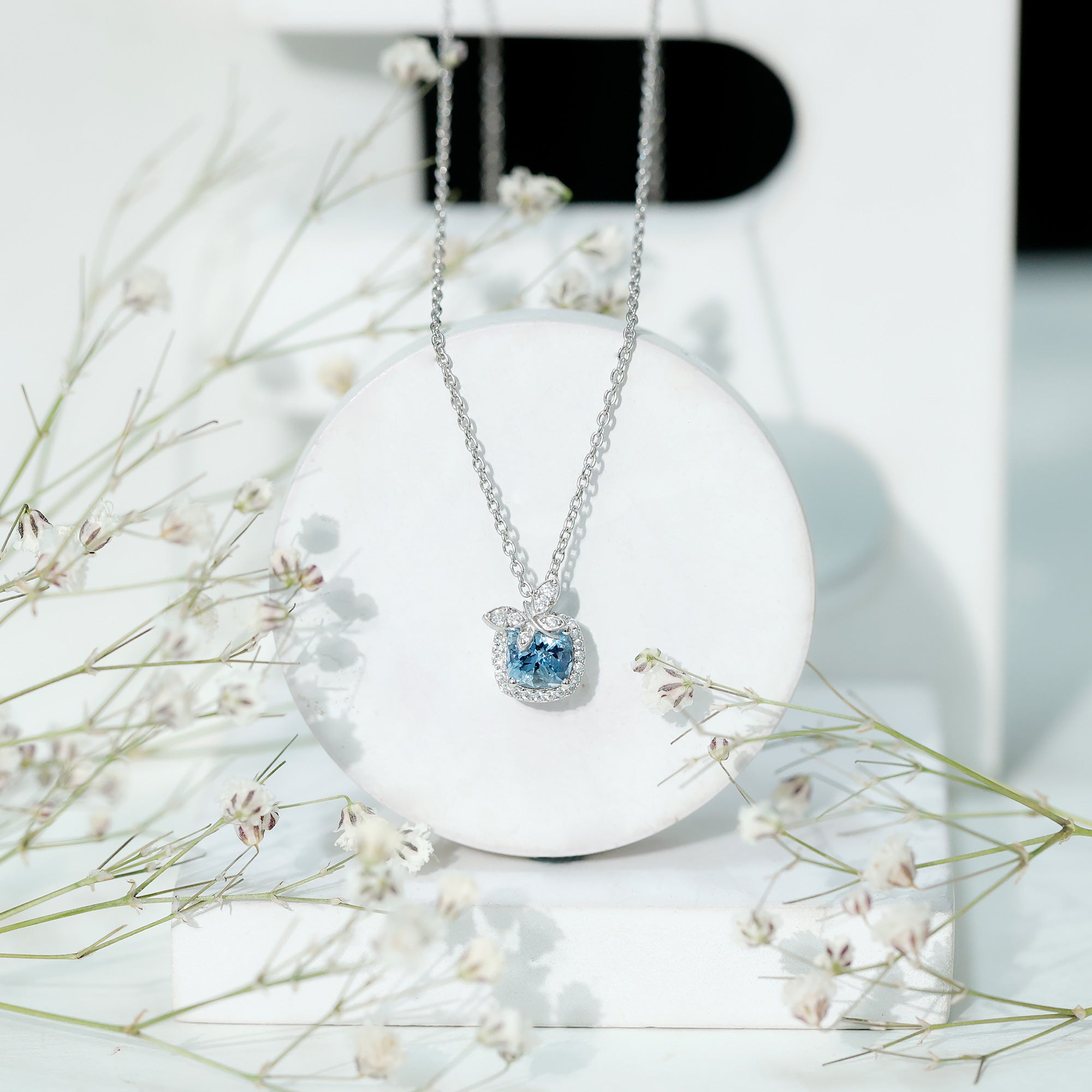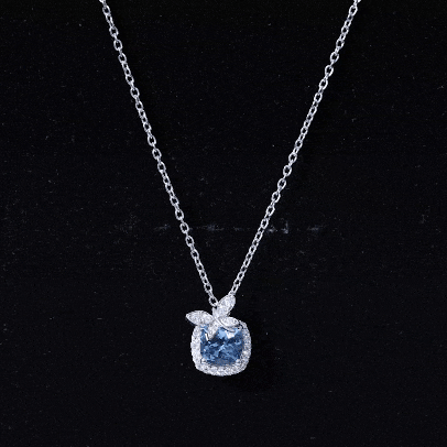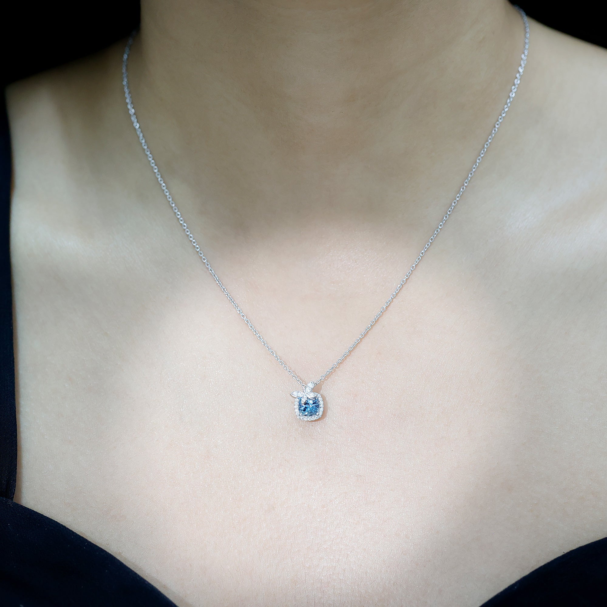 Certified 6 MM Cushion Aquamarine Halo Pendant with Butterfly Motif