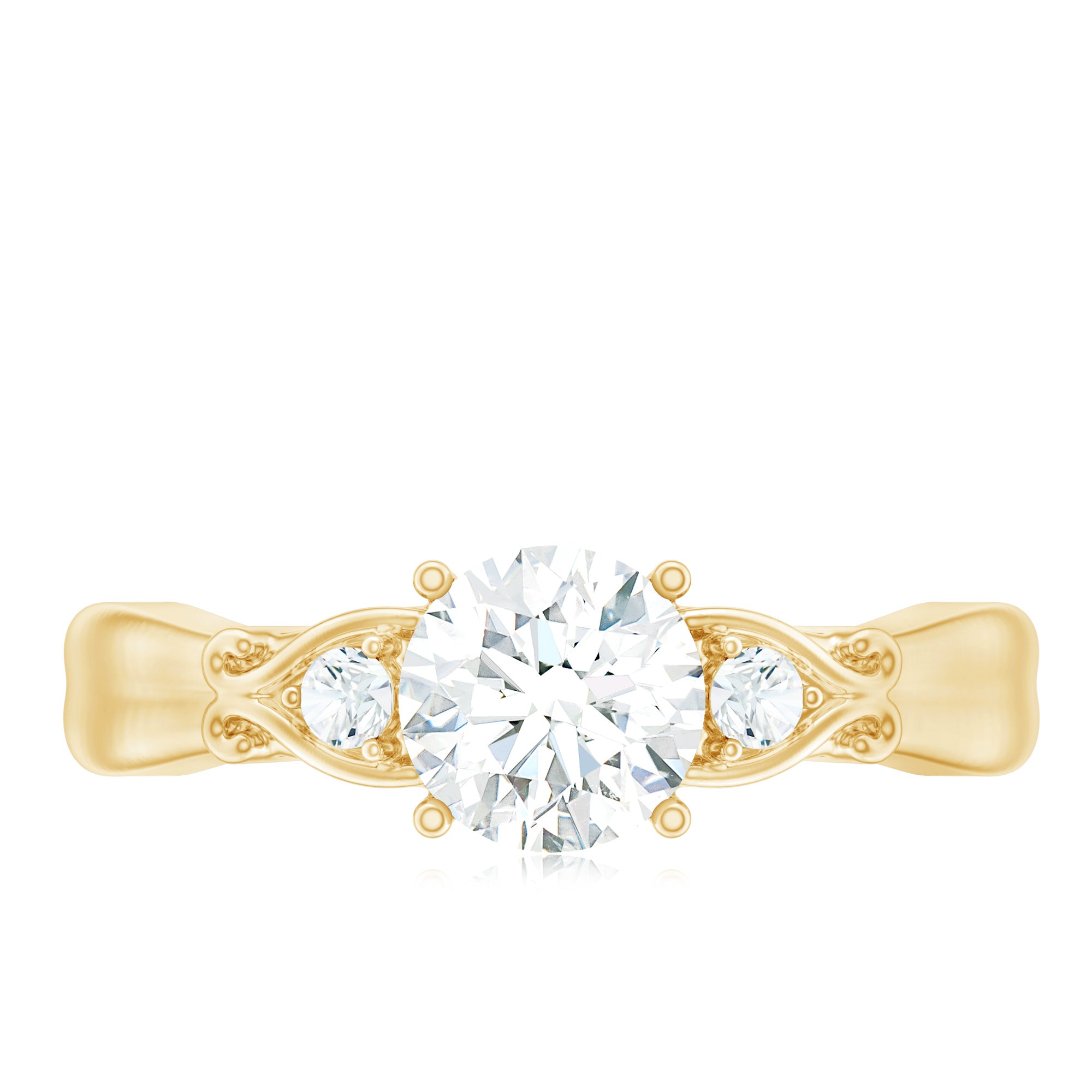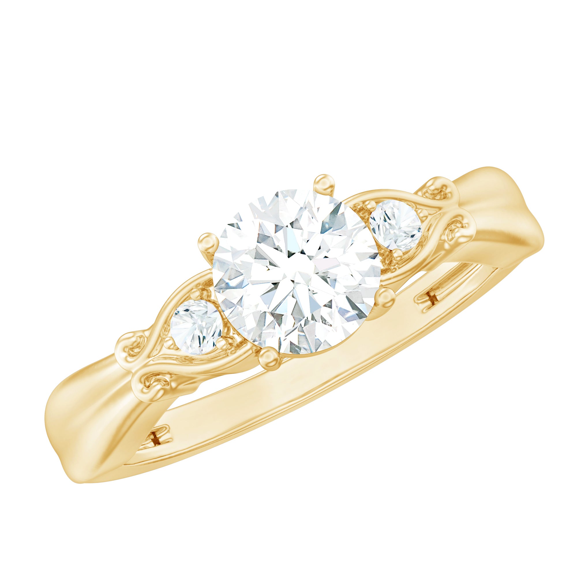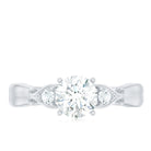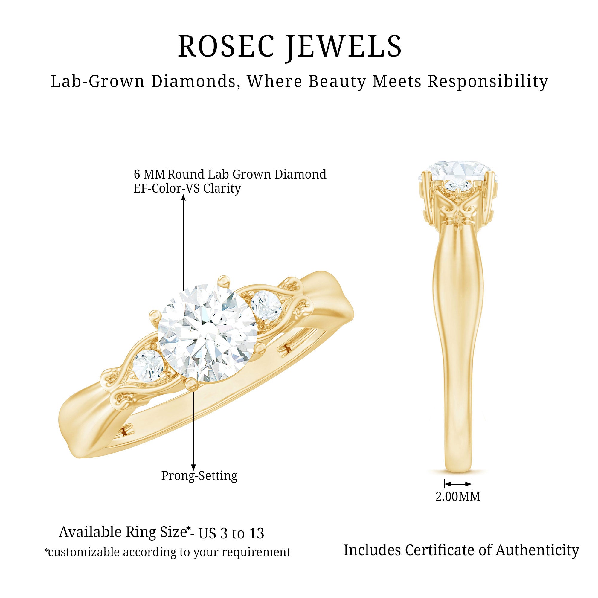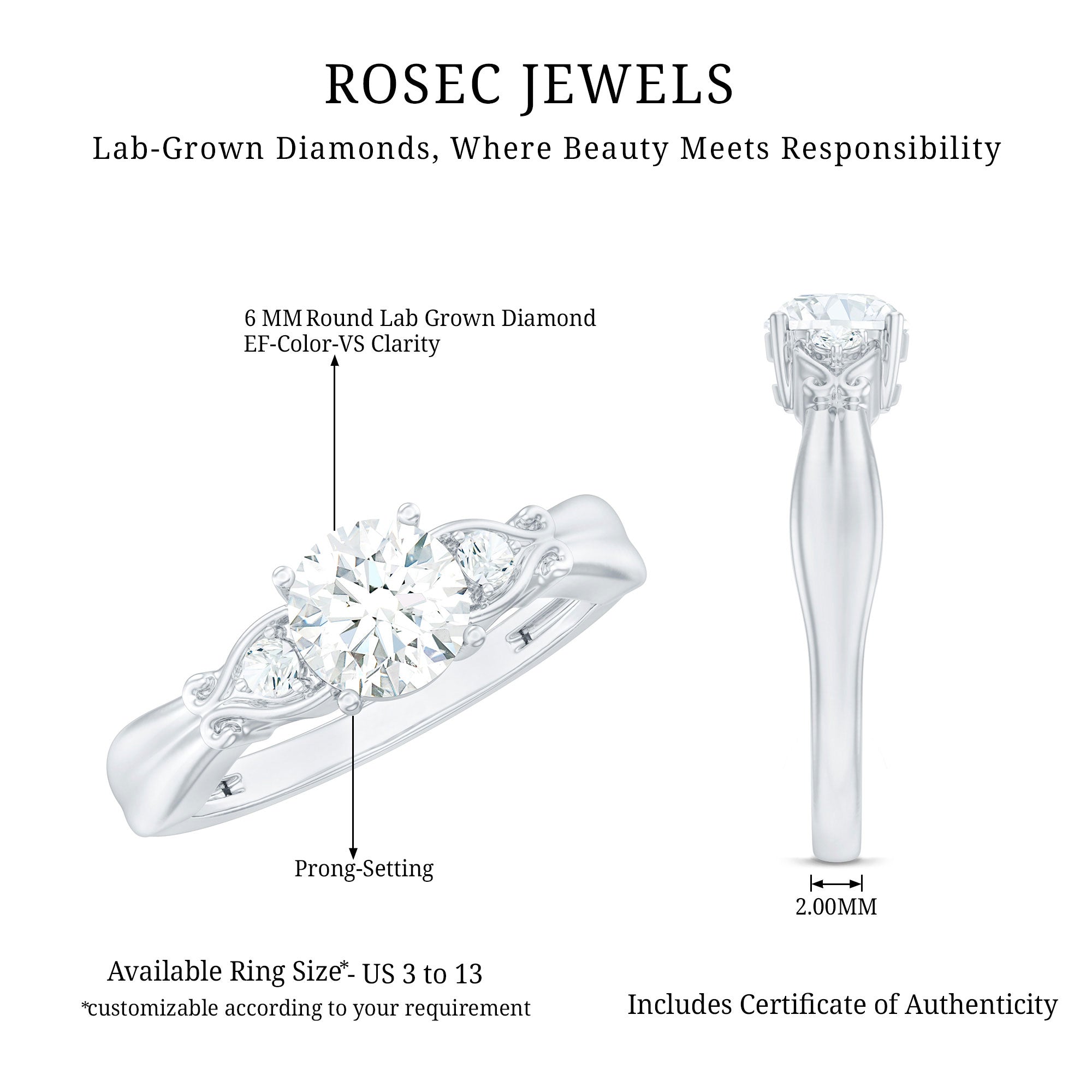 This approximately 1 carat Diamond Engagement Ring is perfect for someone who appreciates a bold yet refined look. At its heart lies a 6 MM round cut lab-grown diamond of EF-VS quality, elegantly set in prong setting. Enhancing this central gem are two delicate gemstones, beautifully arranged in an intricate vintage design. This exquisite Promise Engagement Ring adds a touch of sophistication to any outfit, enhancing your style with its radiant shine. Whether youre marking a birthday, anniversary, Womens Day, or simply searching for a thoughtful gift for your girlfriend, this Proposal Ring comes elegantly packaged in a premium jewelry box, ready for that special moment. Plus, to guarantee its quality, the Diamond Solitaire Ring includes a certificate of authenticity for your peace of mind.