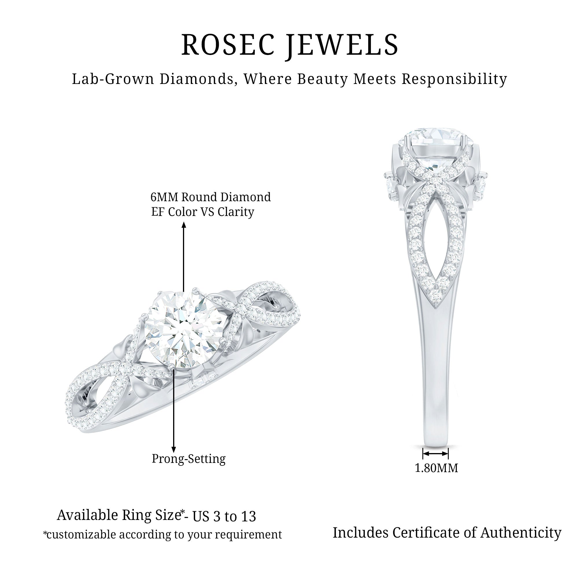 This Lab Grown Diamond Ring is a perfect mix of contemporary design and timeless romance, that makes it an absolute showstopper. Featuring 6 MM Round Shaped Lab Grown Diamond in Prong Setting with a unique crossover design studded with lab diamond gemstones sparkling from every angle. This Diamond Crossover Ring has a true beauty that symbolizes your intertwined lives by adding unique elegance. Crafted with meticulous attention to detail, this Diamond Designer Ring embraces an extraordinary design with its brilliance and beauty that shines by adding grace to your unique flair. Flaunt the extravagant style of this EF-VS Quality Lab Diamond that matches your charisma beautifully by saying yes to forever.