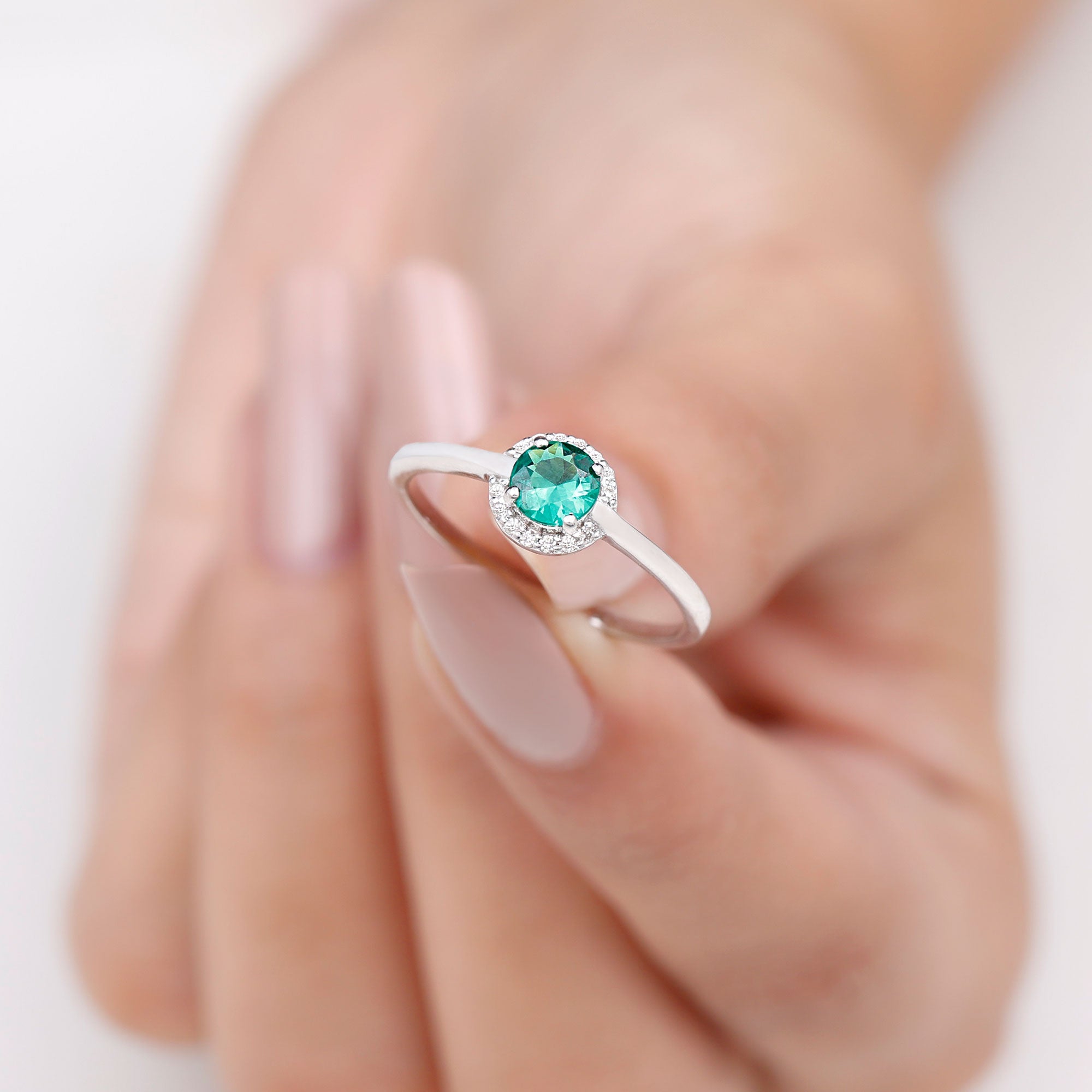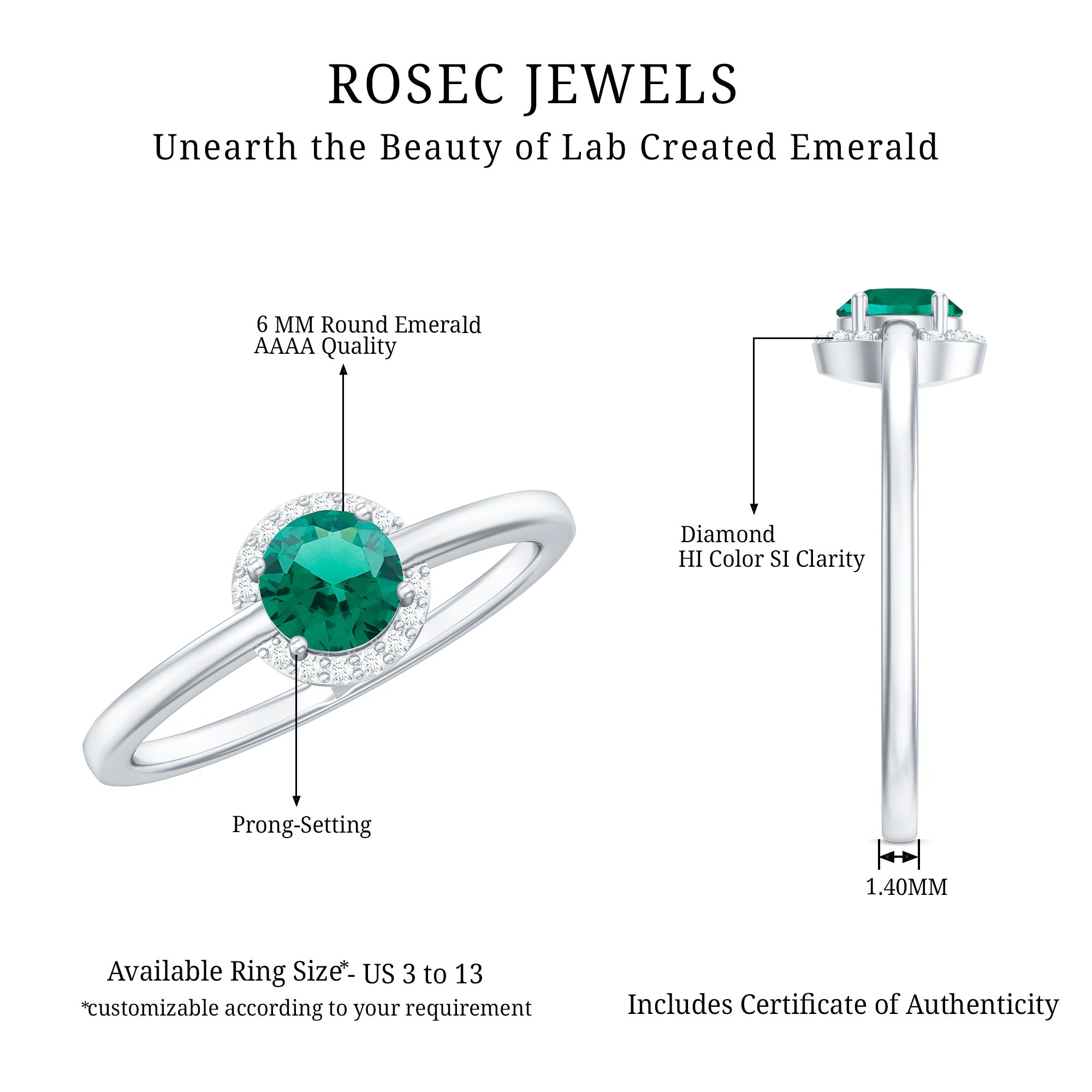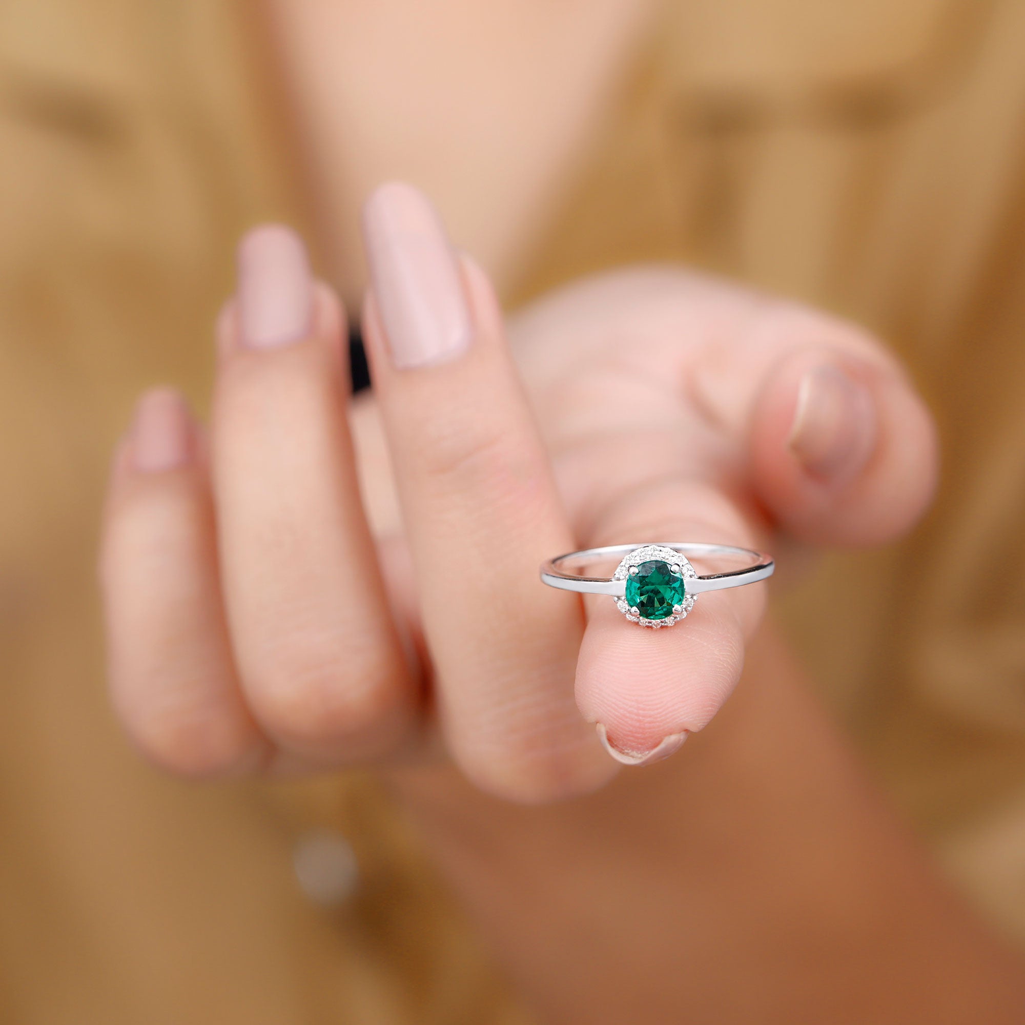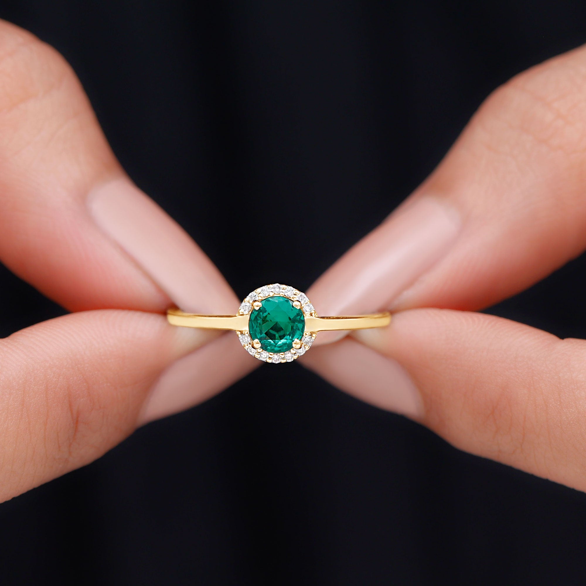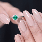 A promise is a beautiful way to express your love and this Commitment Ring for her is designed to do just that. At its center is a 6 mm Round Shape Lab Created Emerald, well known for its vibrant green color. Surrounding the AAAA Quality Lab Emerald is a delicate halo of sparkling HI-SI Diamond that adds extra brilliance and draws attention to the center stone. The slim band keeps the overall design elegant and modern, that makes this Lab Emerald Promise Ring easy to wear every day while still standing out as a special piece. The combination of the rich green Lab Emerald and the shining Diamond Halo creates a stunning contrast that symbolizes your unique bond, full of life and strength. The slim band ensures a comfortable fit, that makes this Lab Emerald Diamond Halo Ring perfect for someone who prefers simple yet elegant jewelry. Presented in a beautiful jewelry box and available in various ring sizes, this Proposal Ring is ideal for expressing a heartfelt commitment, whether for anniversaries, birthdays or simply as a special gesture to show your love. It is a timeless piece she will treasure forever.