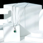 - The Halo Pendant Necklace shines with the luxurious glow of emerald, effortlessly capturing attention, while the sparkling Moissanite beautifully enhances the vibrant green shade.