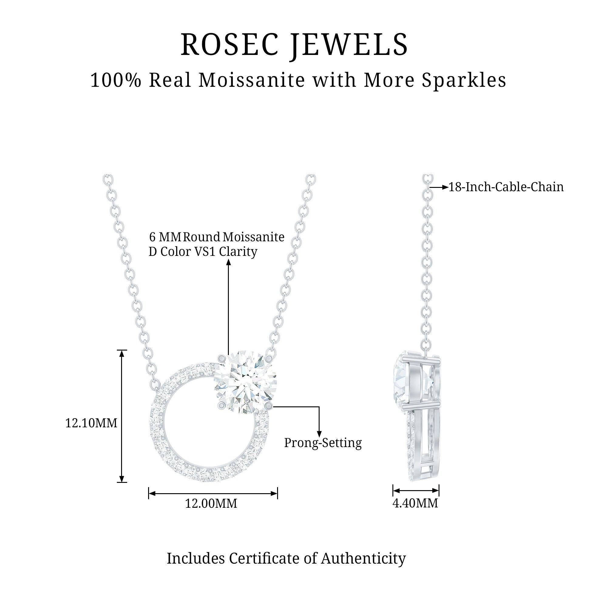 Rosec Jewels Moissanite Circle of Love Necklace is cherished not just for its elegant design but also for its representation of everlasting love. Just like the circle has no beginning or end, love is whole and infinite. Gifting this Round Moissanite Necklace to someone special beautifully expresses your feelings for them. This Circle Pendant Necklace is a sophisticated piece of jewelry, showcasing 20 meticulously hand-set small round cut Moissanite stones alongside a 6 MM Moissanite, all securely held in prong setting. This sophisticated and impressive necklace features a sleek and minimalist design. Wear this pendant on its own or layer it with additional necklace for a contemporary look, this versatile accessory can effortlessly elevate both casual and formal outfits. Whether youre looking for an eye-catching accessory for special occasions or a sophisticated addition to your everyday ensemble, this Eternity Necklace makes an excellent choice. It also serves as a thoughtful gift for anniversaries, birthdays, or just because you want to show your loved one how special they are.