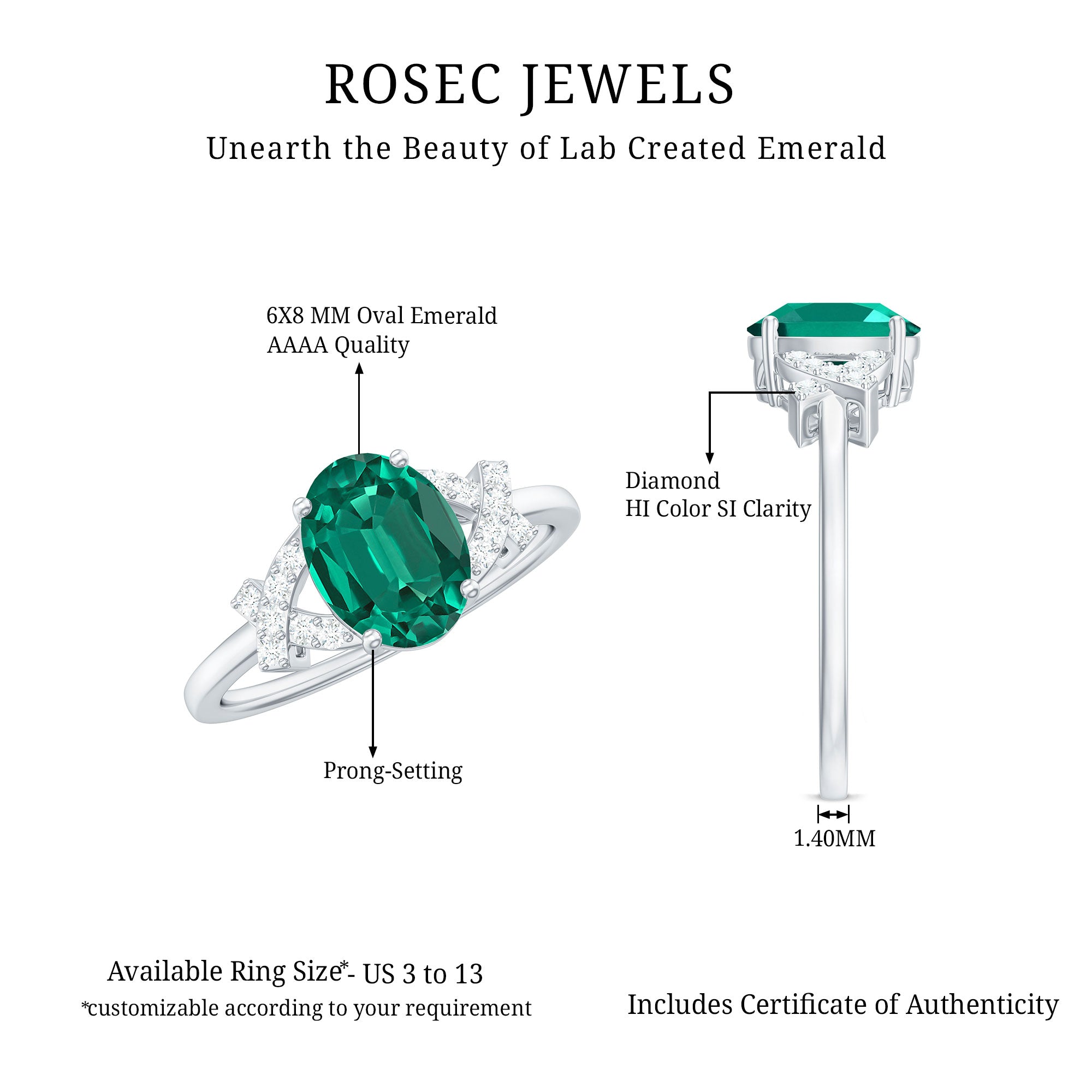 Command attention with the captivating beauty of this Oval Engagement Ring, a piece of jewelry that redefines timeless elegance with a modern edge. At its center is a vibrant 6X8 mm Oval Shape Lab Created Emerald set in Prong Setting, radiating a rich glow that instantly draws the eye. The Split Shank design adds sophistication and creates a graceful frame for the centerpiece. Meticulously crafted, the Split Shank Band is adorned with sparkling Diamond stones that enhance the brilliance of the ring and lend a luxurious touch that sparkles with every movement. The harmony between the bold AAAA Quality Lab Emerald and the glittering HI-SI Diamond creates a perfect balance of color and fire, that makes this Lab Emerald Diamond Engagement Ring a striking choice for women who embrace both elegance and individuality. Crafted with perfection and care, this Split Shank Engagement Ring is a testament to love, devotion and style that lasts a lifetime. Whether it marks the beginning of forever or celebrates a special promise, this Lab Grown Emerald Engagement Ring ensures your love story shines in unforgettable brilliance.