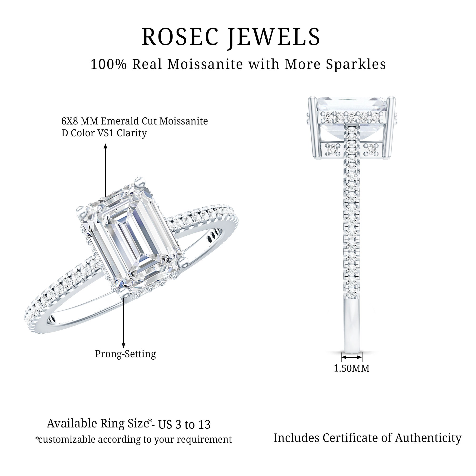 Introducing this stunning Moissanite Engagement Ring, a beautiful combination of classic elegance and simple aesthetic. The band of this Solitaire Ring is adorned with glittering round-cut moissanite stones. This simple design draws the eye to a central 6X8 MM emerald cut moissanite of D-VS1 quality, cradled in a secure prong setting. Charming and stylish, this Womens Moissanite Ring symbolizes enduring love and showcases refined taste. The Solitaire Engagement Ring is a thoughtful and affordable present for your loved one. It offers a wide range of metal color options and is also available in various ring sizes, comes with a certificate of authenticity for gemstones, and is packaged in a premium storage box.