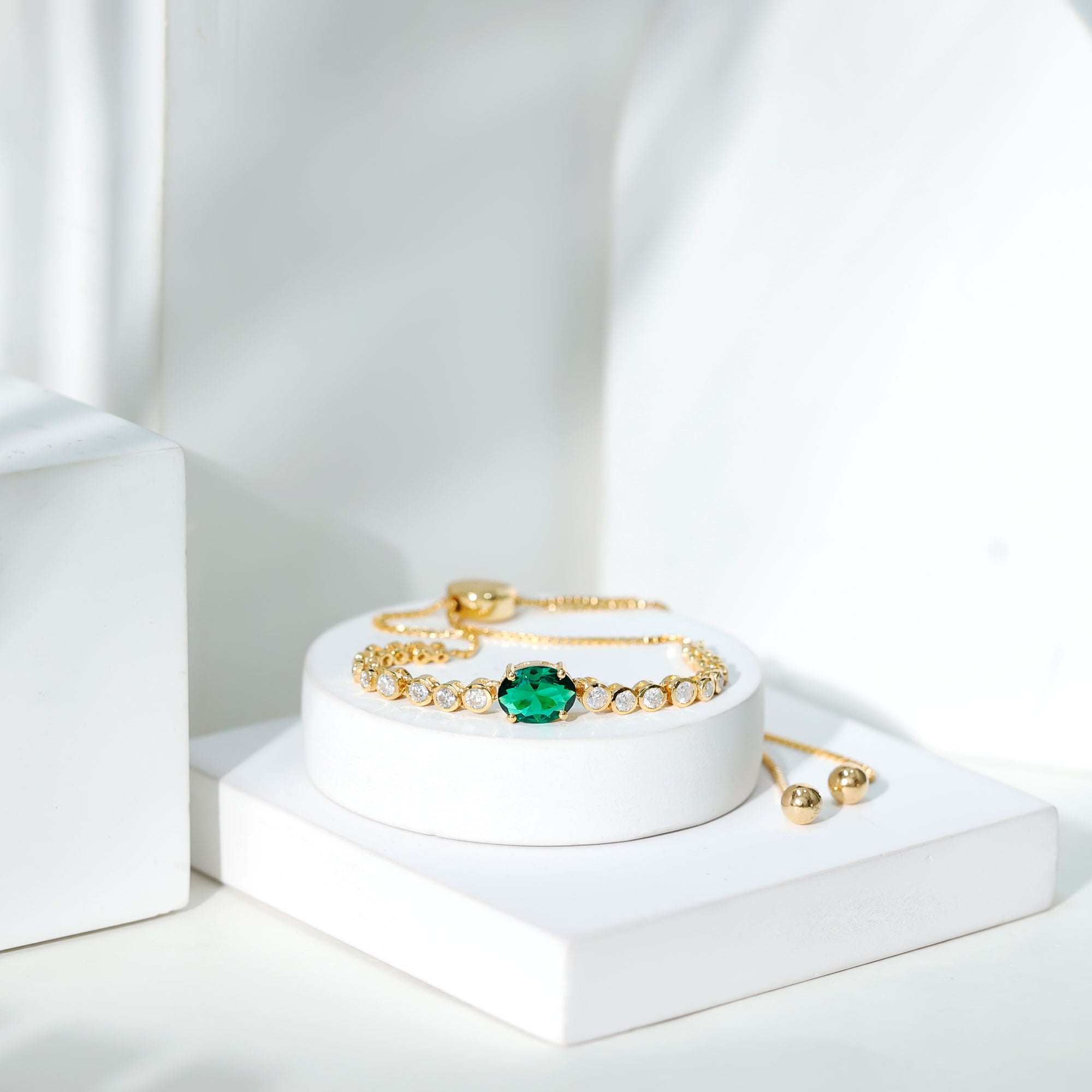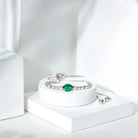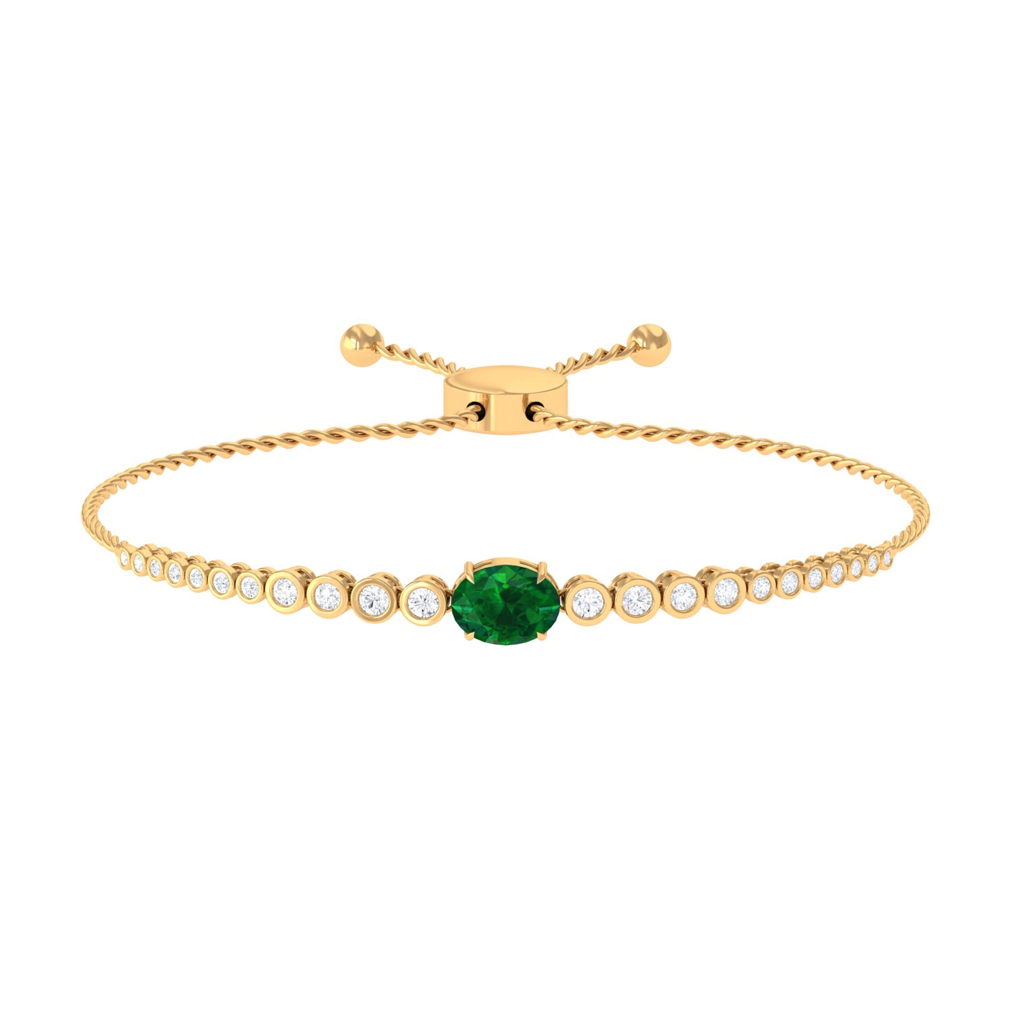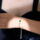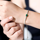 Make a stunning statement whenever you wear this gorgeous lab created Emerald and Diamond Bracelet. This classic Bolo Tennis Bracelet is curated with a 6X8 MM oval cut emerald (AAAA quality) nestled in secure claw setting in east-west style. The bezel set round cut moissanite stones are arranged in a graduated pattern, subtly guiding the eye toward the mesmerizing center stone. The bolo-style closure makes it super easy to adjust, so it fits perfectly on any wrist, while the twisted rope chain complements the overall look of this Synthetic Green Emerald Bracelet. This is the perfect Bracelet for Brides who want to add a little extra magic to their wedding look. Whether style it solo or stack it with another bracelet for a trending layered look, this piece is a must-have for any jewelry lover.
