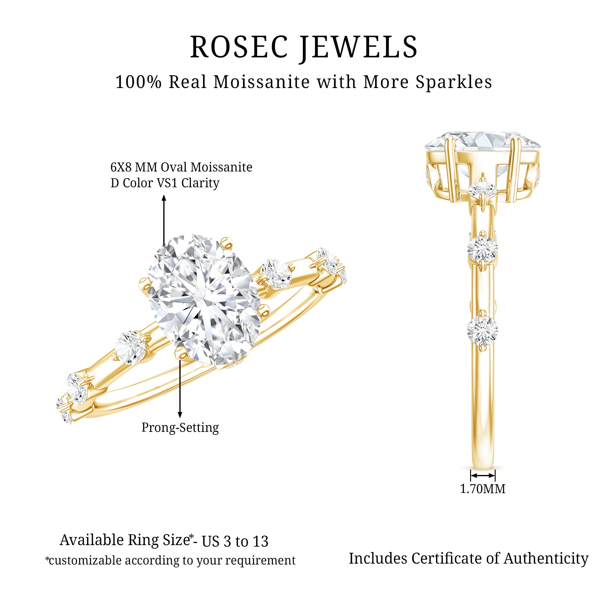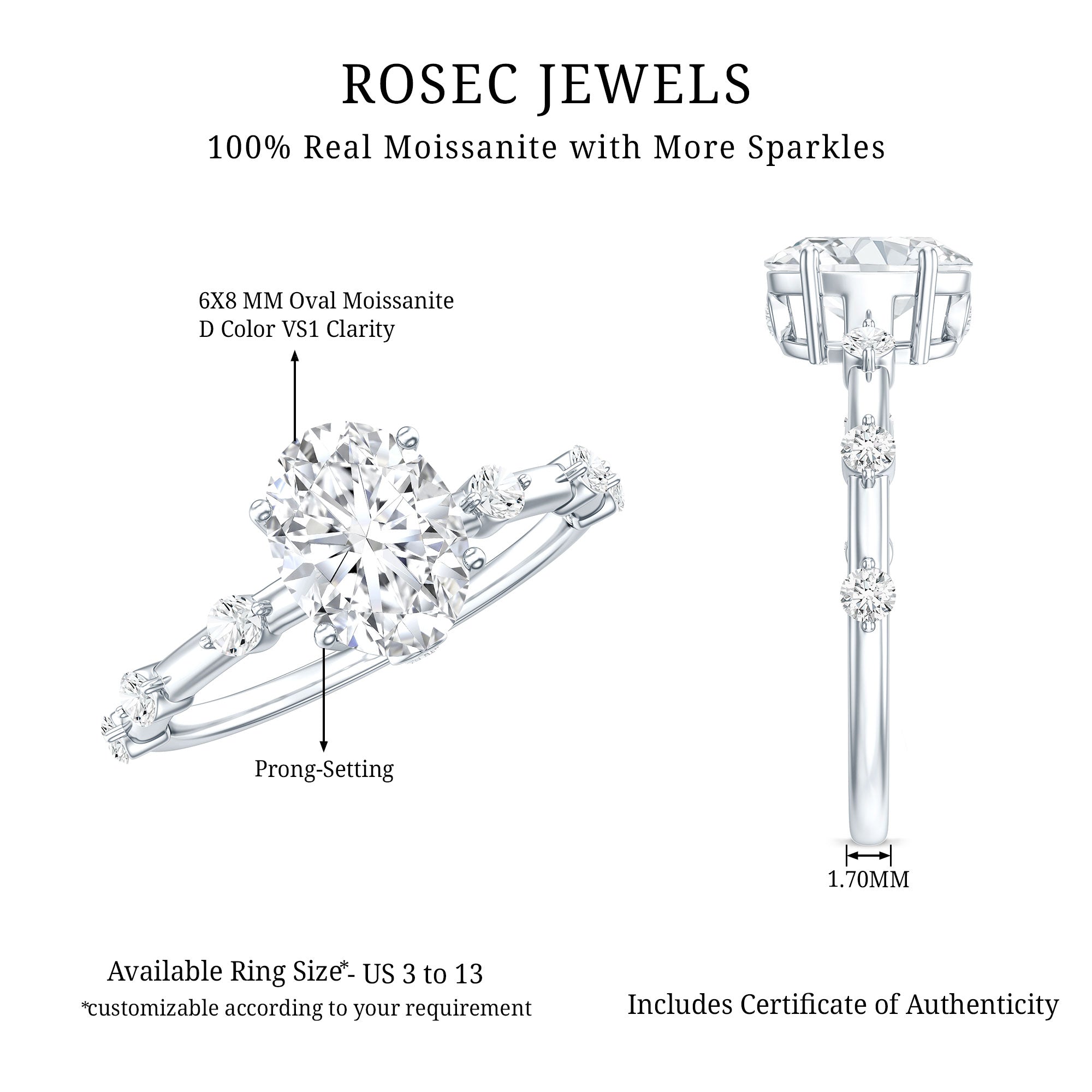 As you present this sparkling Moissanite Ring to your beloved, watch the tears of joy stream down her face. The 6X8 MM Oval Shape Moissanite, set in Prong Setting with spaced accents on both sides of the shank, creates a beautiful and gleaming engagement ring. This Oval Solitaire Engagement Ring is sure to make a stunning addition to her collection and add a touch of brilliance to her outfit. With a total weight of 1.75 Carats and a high quality of D Color and VS1 Clarity, this ring is the perfect symbol of your love and devotion. All the gemstones are certified and thoroughly checked for quality.