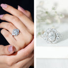 Elevate your Style statement with this Moissanite Engagement Ring which is crafted with 14K White Gold Plated Silver. This Statement Ring features a 6X8 MM Oval Shape Moissanite secured in Bezel Setting. The center stone is adorned with a halo of round shape Moissanite embellished with beaded detailing at the top of the ring. Present this Cluster Ring to your lady love on engagement and complete the celebration. The ring holds the adorable shine of D-VS1 quality Moissanite which makes it perfect to make her stun on the big day. This Statement Engagement Ring will adorn her fingers beautifully and always remind her of your love.