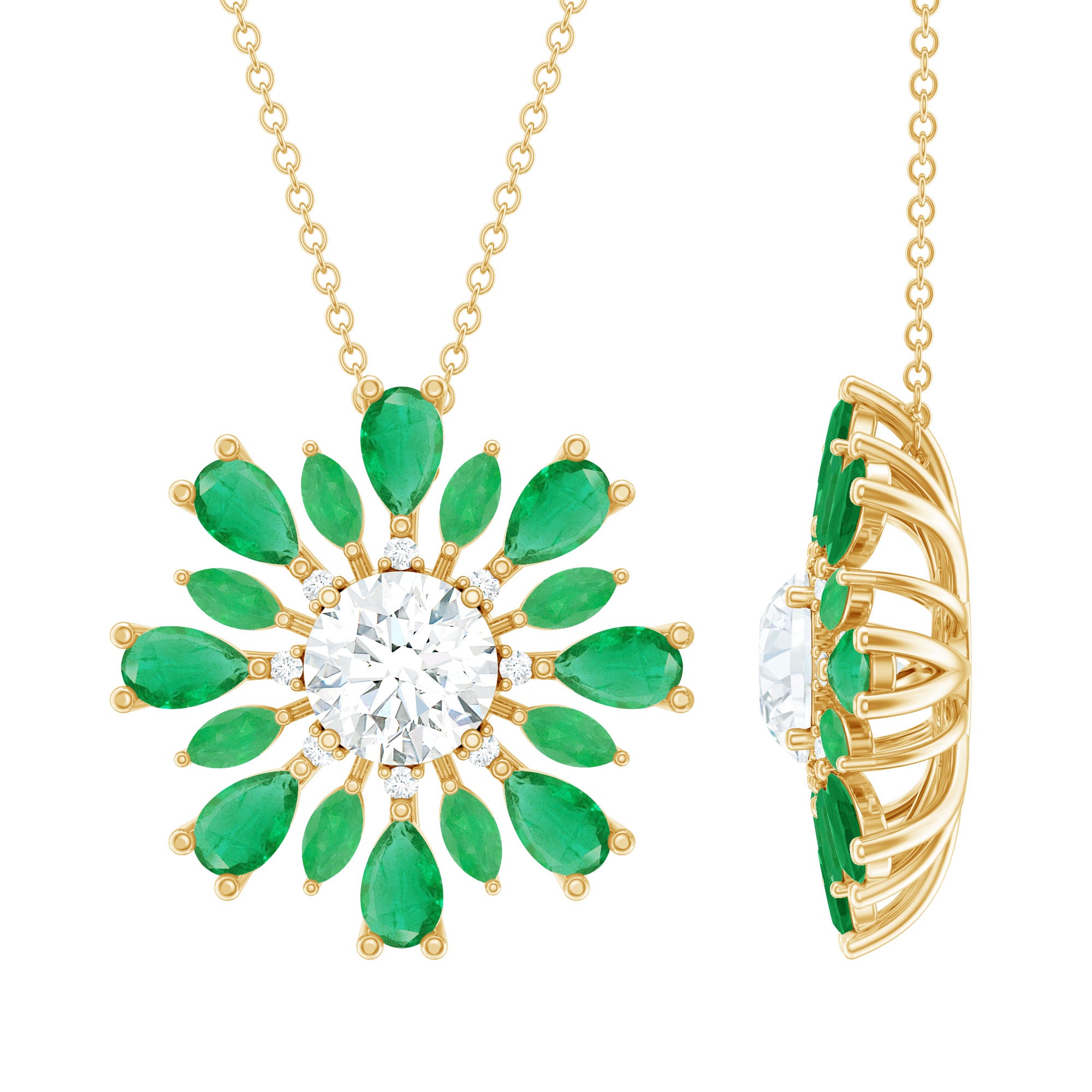 This beautiful Diamond Floral Necklace boasts a mesmerizing design that highlights the natural allure of the emerald stone, guaranteed to draw everyones attention. It features a 7 MM Round Shape diamond set in prongs, along with a unique combination of pear and marquise shape emeralds and delicate diamonds that enhance the charm of this Cocktail Necklace. Its truly the ideal accessory for your upcoming party. This Diamond and Emerald Necklace is available in a variety of metal color options so you can choose whatever suits your unique style and make it a truly personalized piece. As an April birthstone diamonds are known to enhance strength, clarity, and everlasting love. This pendant makes for an ideal gift for those born in April, symbolizing their inner radiance and refined grace.