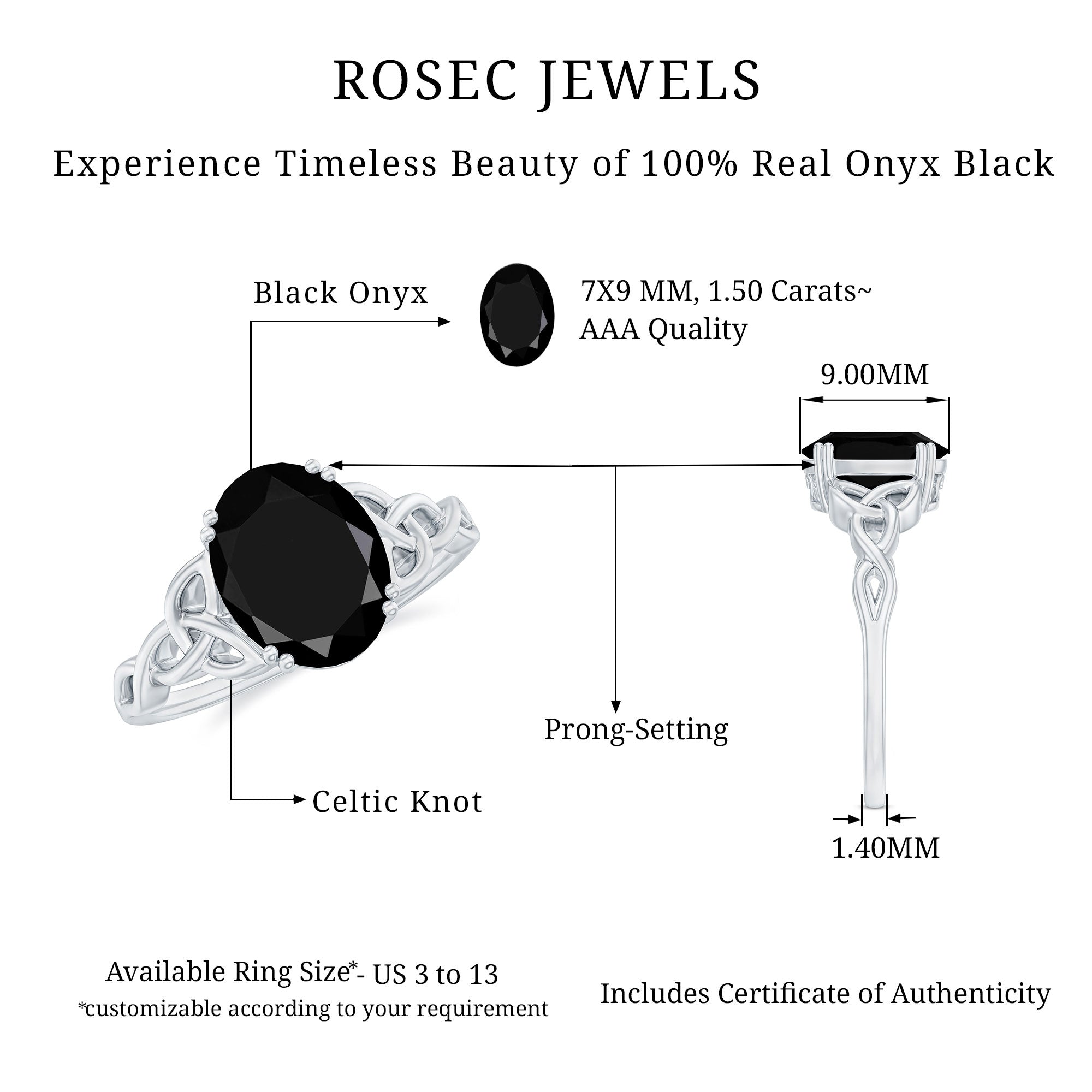 Experience the allure of this Solitaire Ring, a masterpiece of timeless elegance. A 7X9 MM Oval Shape Black Onyx takes center stage. The intricate Celtic Knot Design adds a touch of charm to this ring, making it a captivating symbol of eternal love and unity. Elevate your look with this unique and enchanting black gemstone ring. This Black Onyx Ring is perfect for channeling intense love for your partner. Make your engagement day special with the classic shine of AAA Quality Black Onyx. This Black Gemstone Ring is delicately crafted by Rosec Jewels ensuring the top notch quality of gemstone.