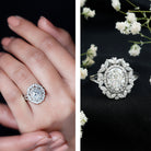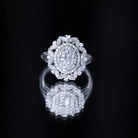 Express without saying with this Moissanite Designer Engagement Ring, which is a unique symbol of love symbolizing forever commitment. This Large Engagement Ring features a 7X9 MM Oval Shape Moissanite securely placed in Prong Setting encircled by a double halo enhancing the beauty of the ring. This Statement Ring beholds the classic shine of D-VS1 Quality Moissanite which can easily elevate any look. This Double Halo Ring levels up the sparkle and brilliance which symbolize deep and enduring love for your partner. This ring is precisely handcrafted with 14K White Gold Plated Silver for your special day.