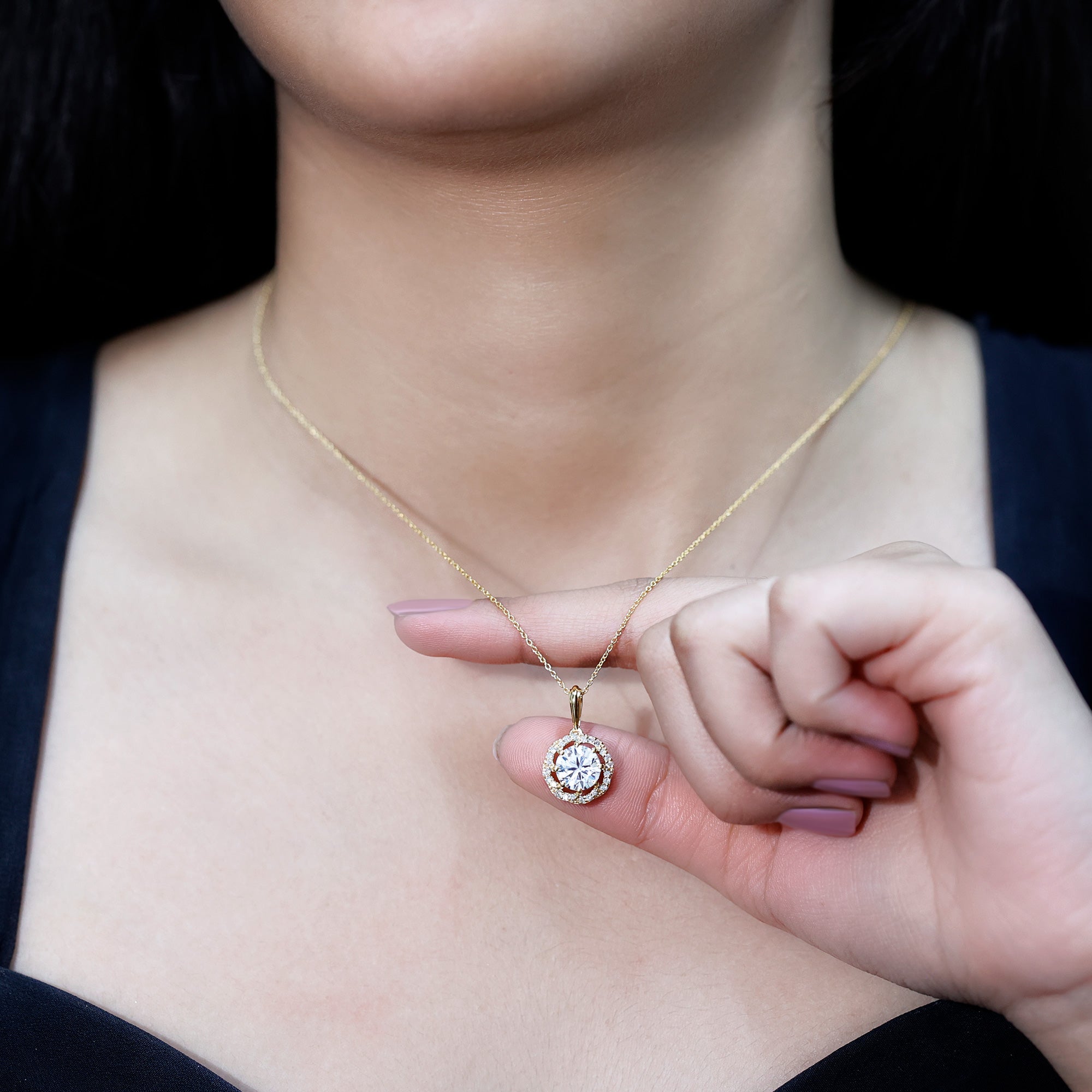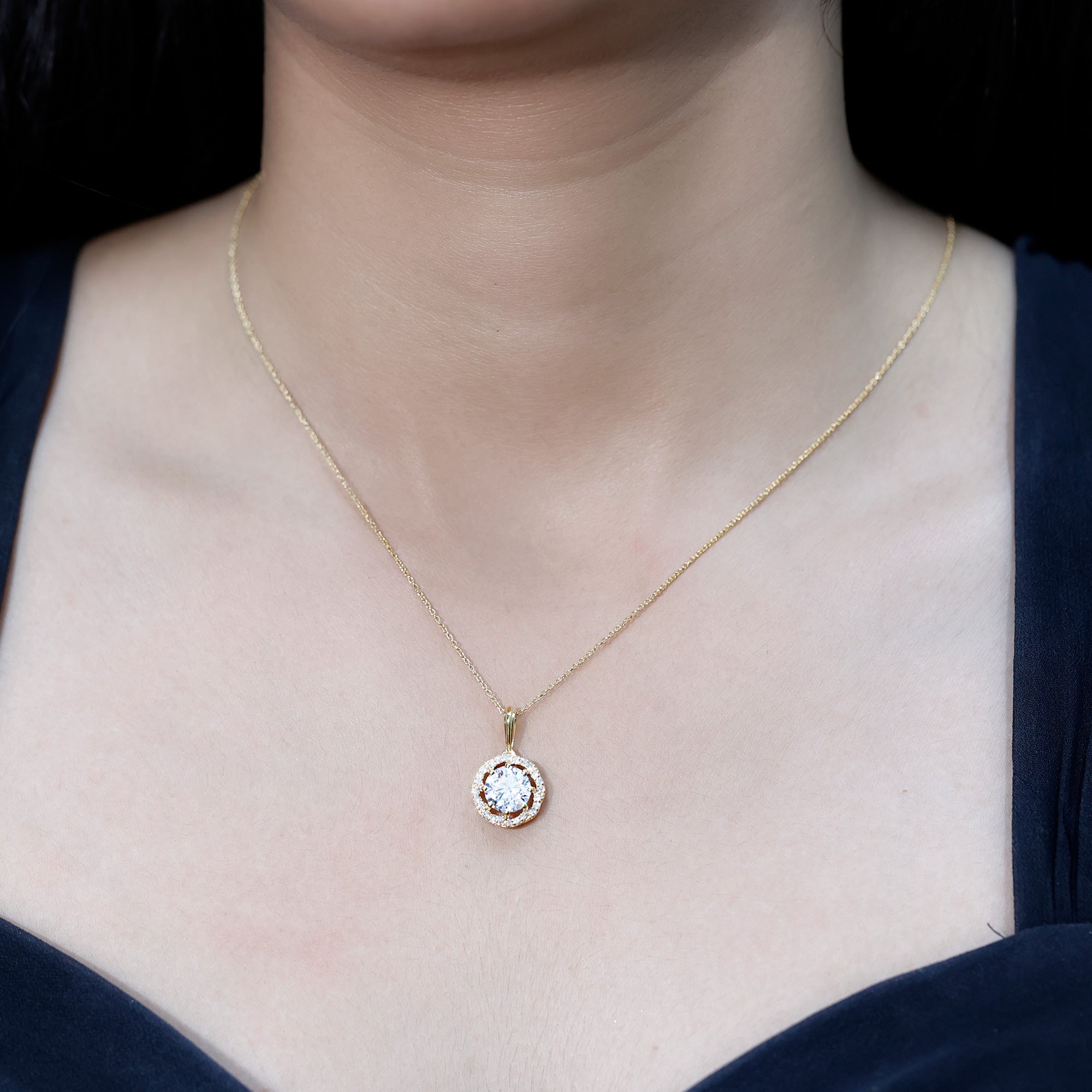 The Cocktail Pendant is embellished with an 8 MM round shaped diamond (EF-VS Quality) which is surrounded by a unique petite gemstone halo and elegantly connected by a textured bail. Crafted with certified lab-grown diamonds, it is available in a variety of metal color options, that allow you to choose your preferred one. This Diamond Halo Pendant combines elegance with brilliance, making it a perfect addition to any jewelry collection. This Round Diamond Pendant is perfect for celebrating any occasion, whether it is for a birthday, anniversary, or a thoughtful gift. This 2 carat Diamond Necklace is a great way to show love and appreciation, present this to someone special, and let it be a lasting symbol of your love.