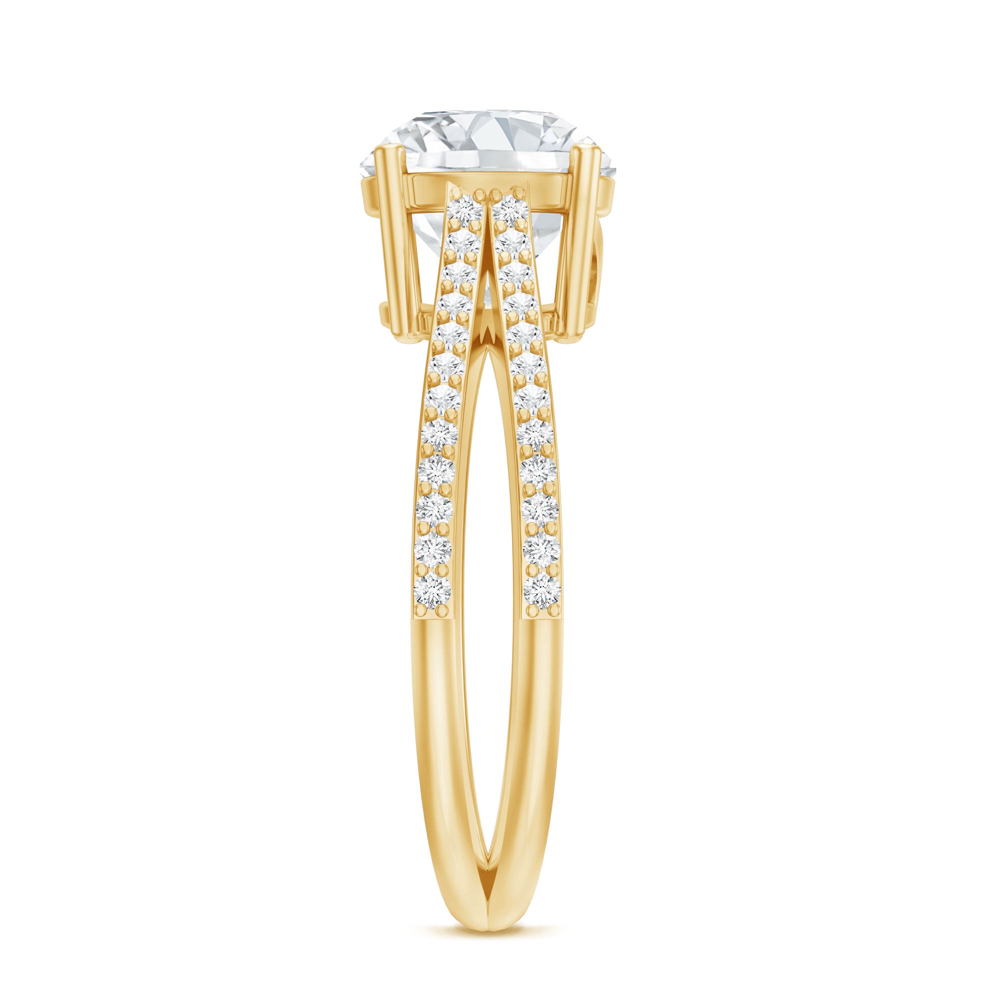 The split shank design divides as it approaches the center, drawing attention toward the diamond while adding dimension to the ring profile. This structure enhances light exposure around the center stone and creates a refined frame without overwhelming it.