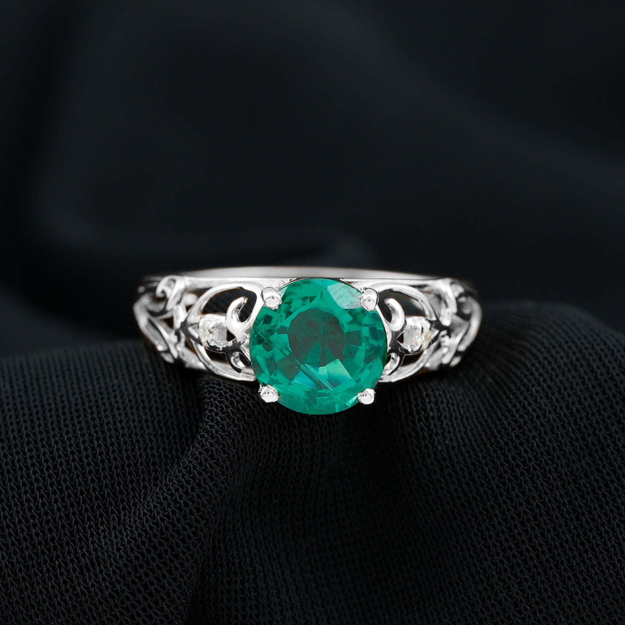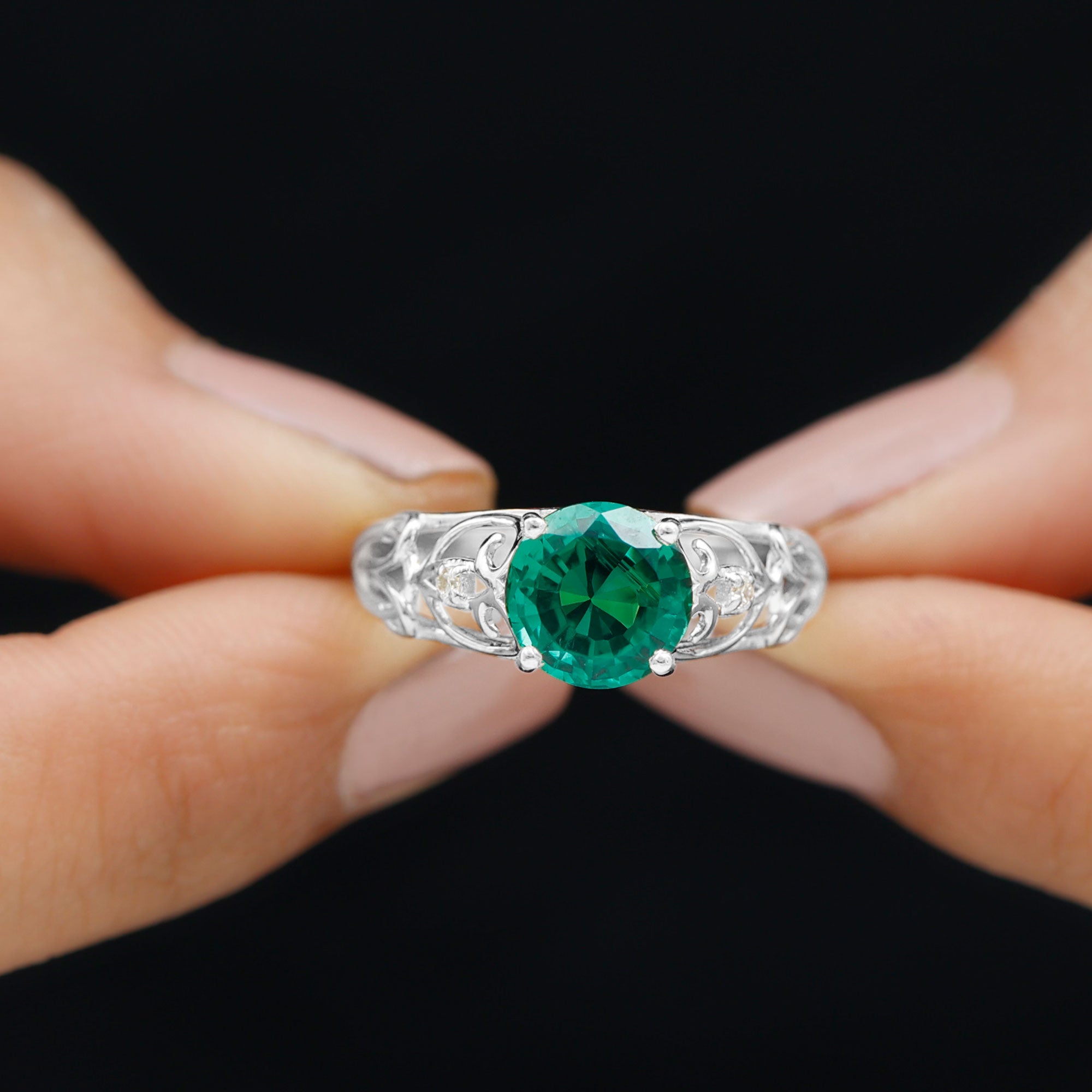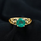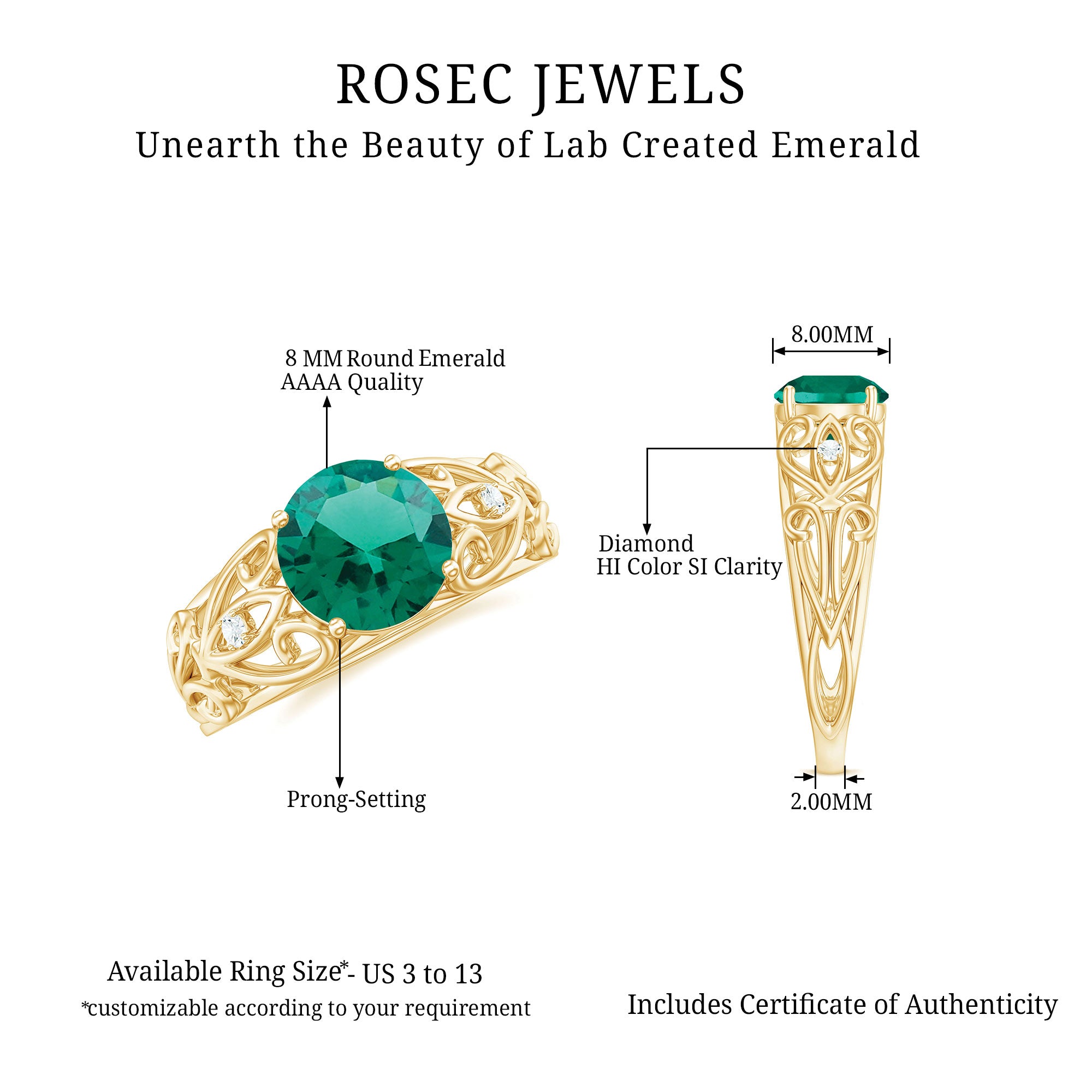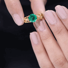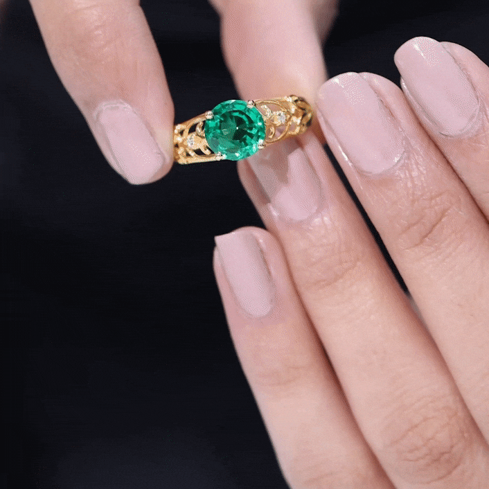 Make a timeless statement of love with this Antique Style Engagement Ring that features a stunning 8 mm Round Shape Lab Created Emerald set in Prong Setting, known for its rich green hue. The vibrant AAAA Quality Lab Emerald takes the spotlight, while the mesmerizing design brings a touch of vintage elegance. The band of this Lab Grown Emerald Ring is beautifully crafted in an intricate Ivy Scroll pattern. Adding to its charm, a delicate Diamond is set on each side of the Lab Emerald, offering just the right amount of sparkle. Perfect for those who appreciate unique design with a sense of history, this Lab Emerald Engagement Ring balances bold beauty with delicate details. The craftsmanship ensures that this Round Shaped Engagement Ring stands apart from the ordinary, making it a meaningful and timeless choice for proposing or celebrating a lifelong promise. This 2 Ct Emerald Ring (Lab Grown) is a piece of art that carries the story of love, growth, and unity destined to be cherished for generations.