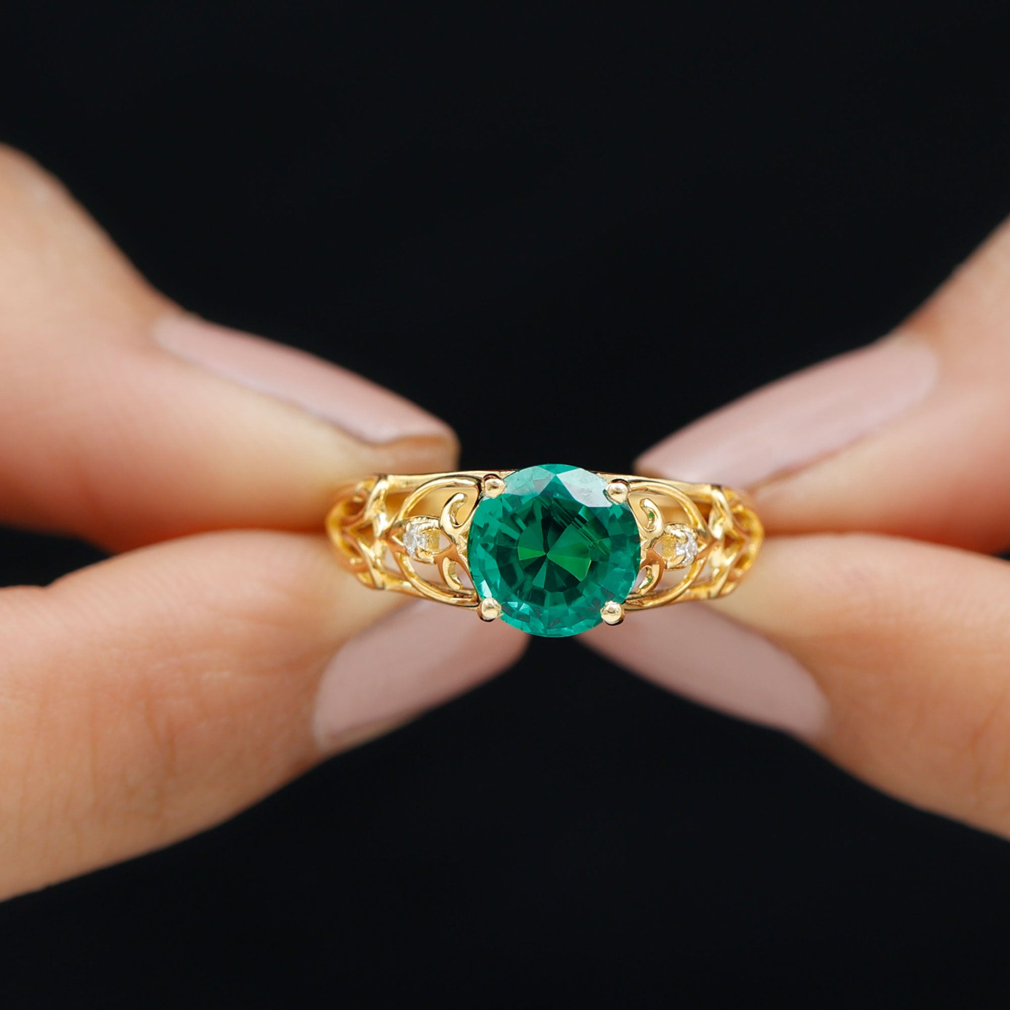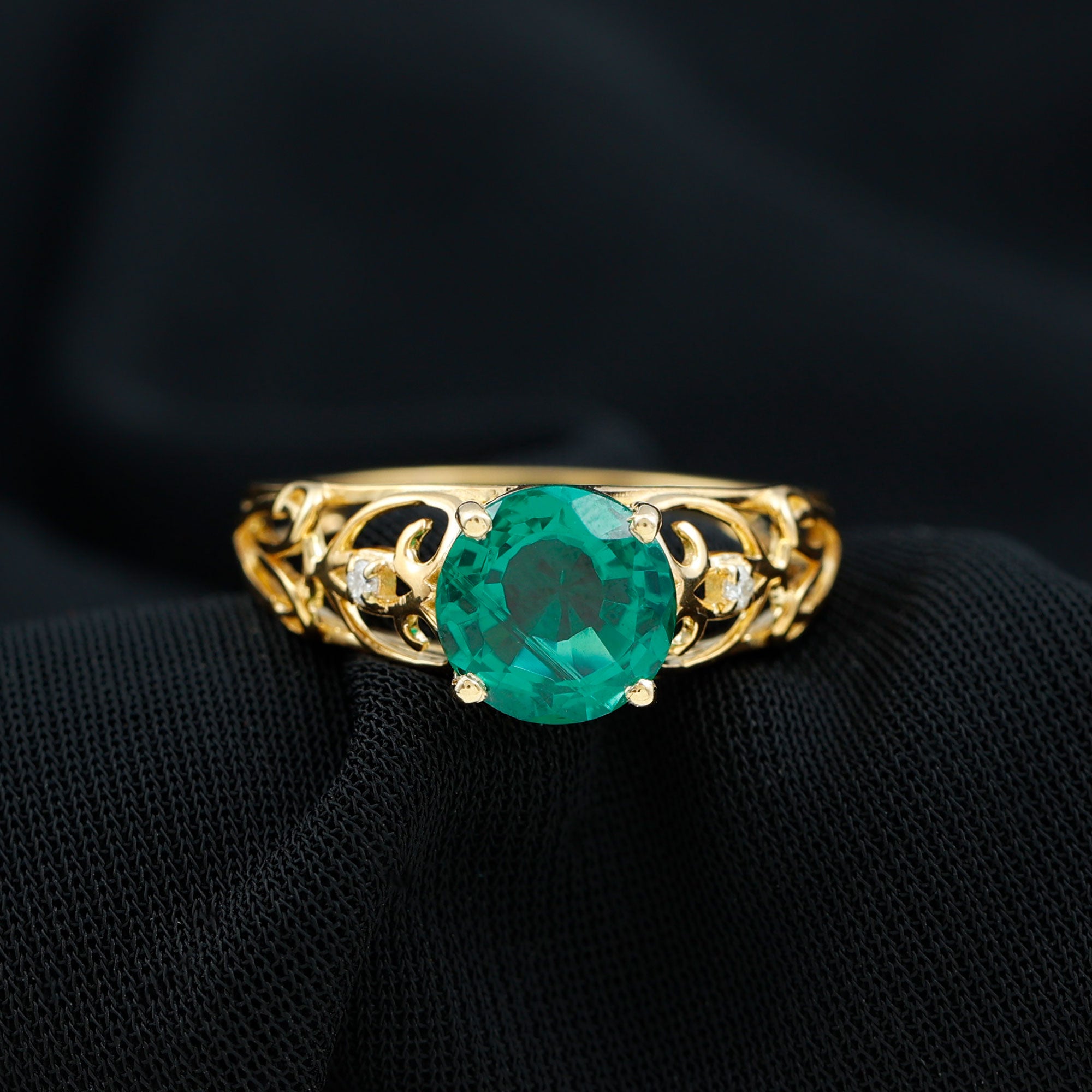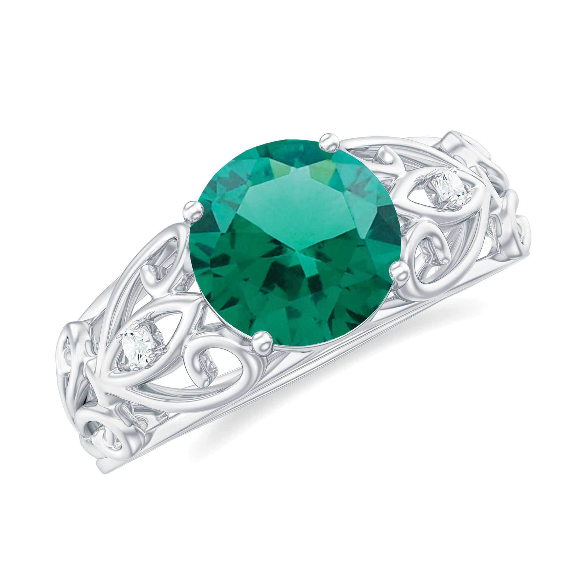 Make a timeless statement of love with this Antique Style Engagement Ring that features a stunning 8 mm Round Shape Lab Created Emerald set in Prong Setting, known for its rich green hue. The vibrant AAAA Quality Lab Emerald takes the spotlight, while the mesmerizing design brings a touch of vintage elegance. The band of this Lab Grown Emerald Ring is beautifully crafted in an intricate Ivy Scroll pattern. Adding to its charm, a delicate Diamond is set on each side of the Lab Emerald, offering just the right amount of sparkle. Perfect for those who appreciate unique design with a sense of history, this Lab Emerald Engagement Ring balances bold beauty with delicate details. The craftsmanship ensures that this Round Shaped Engagement Ring stands apart from the ordinary, making it a meaningful and timeless choice for proposing or celebrating a lifelong promise. This 2 Ct Emerald Ring (Lab Grown) is a piece of art that carries the story of love, growth, and unity destined to be cherished for generations.