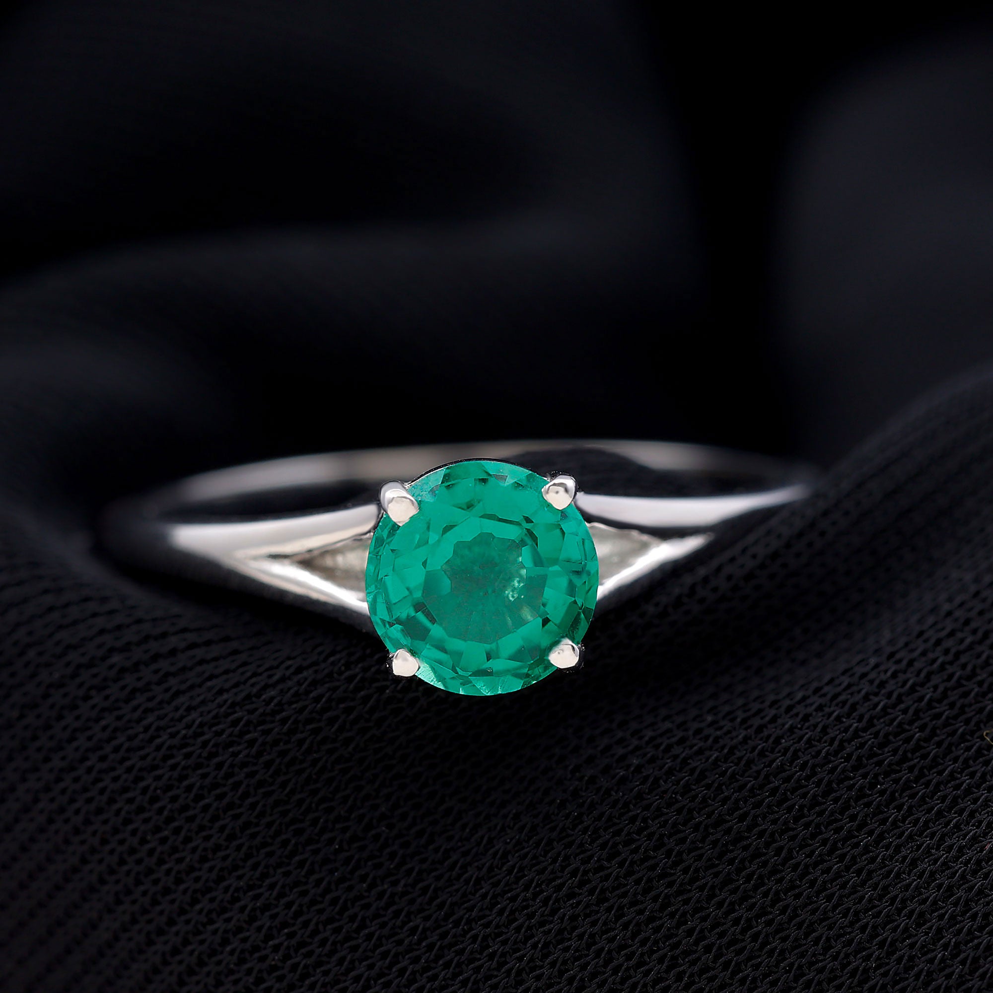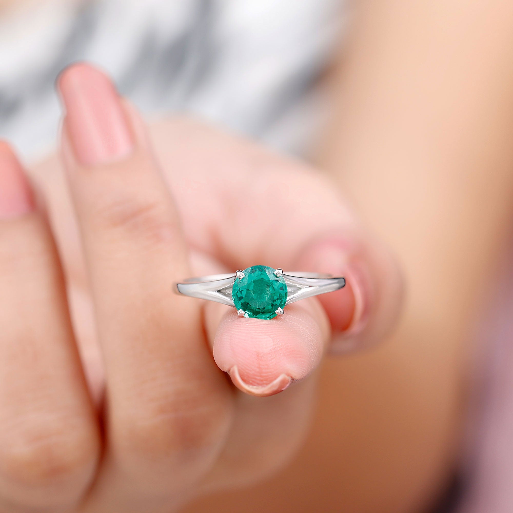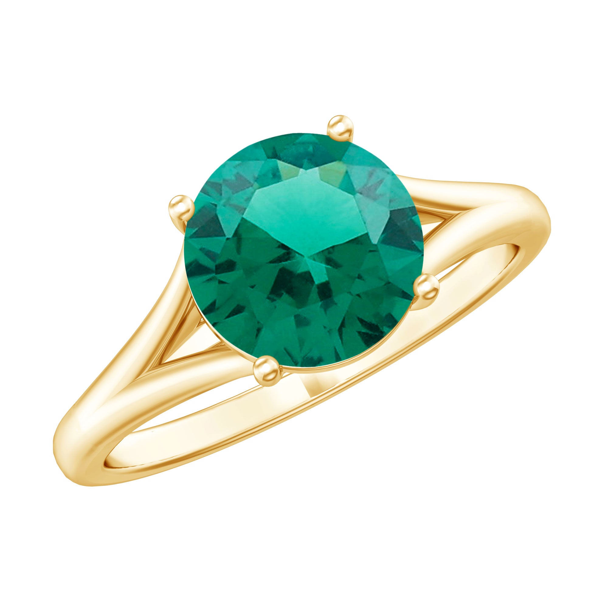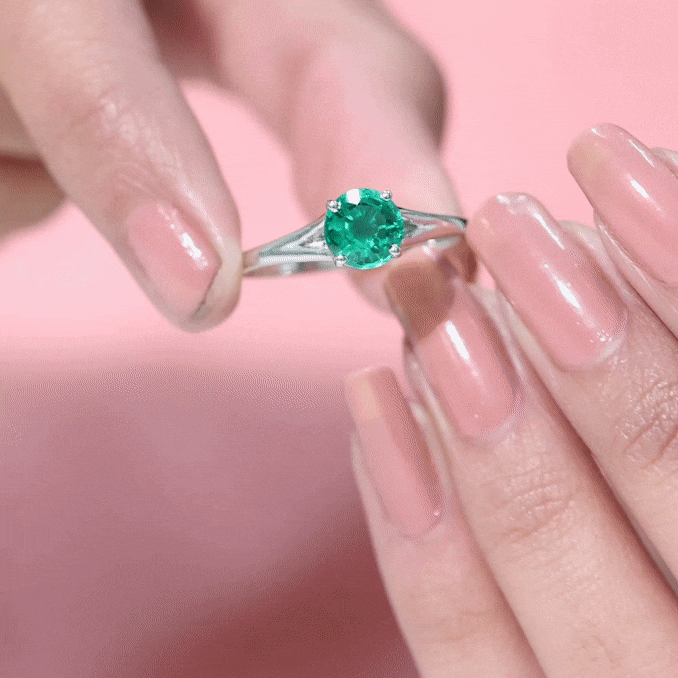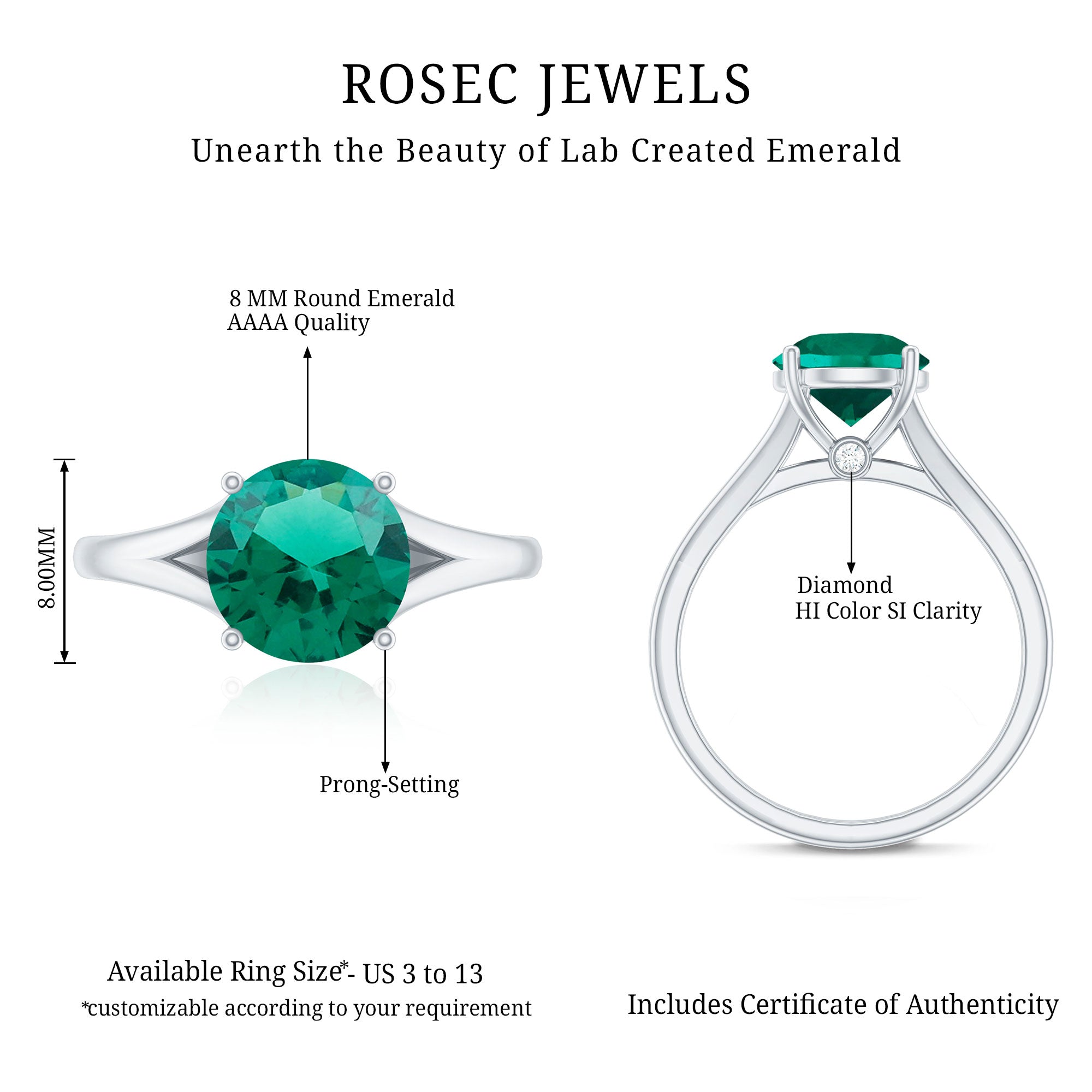 Celebrate your unique love story with this elegant Solitaire Engagement Ring, designed to reflect beauty, meaning and style. Simply stunning, this Fine Ring features a vibrant 8 mm Lab Created Emerald set in Prong Setting that shines brightly, showcasing a rich green color that symbolizes growth, harmony and renewal, perfect for the beginning of your lifelong journey together. This Lab Grown Emerald Ring features a graceful Split Shank design, which adds a modern and elegant touch and also symbolizes two individual lives coming together as one. The split shank represents the connection and balance in a relationship while providing extra support and focus to the center Lab Emerald. Adding to its charm, two Diamond stones are carefully set beneath the center stone, that symbolizes hidden treasures in your love. The Lab Grown Emerald offers both stunning color and clarity, while being an ethical and sustainable choice. Perfect for a proposal or a meaningful gift, this Split Shank Engagement Ring blends classic elegance with thoughtful symbolism and craftsmanship, making it a piece she will cherish forever as a symbol of your everlasting bond.