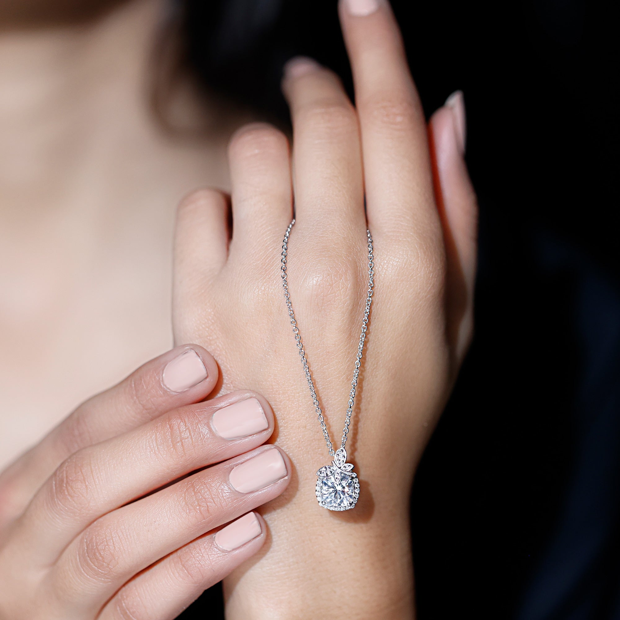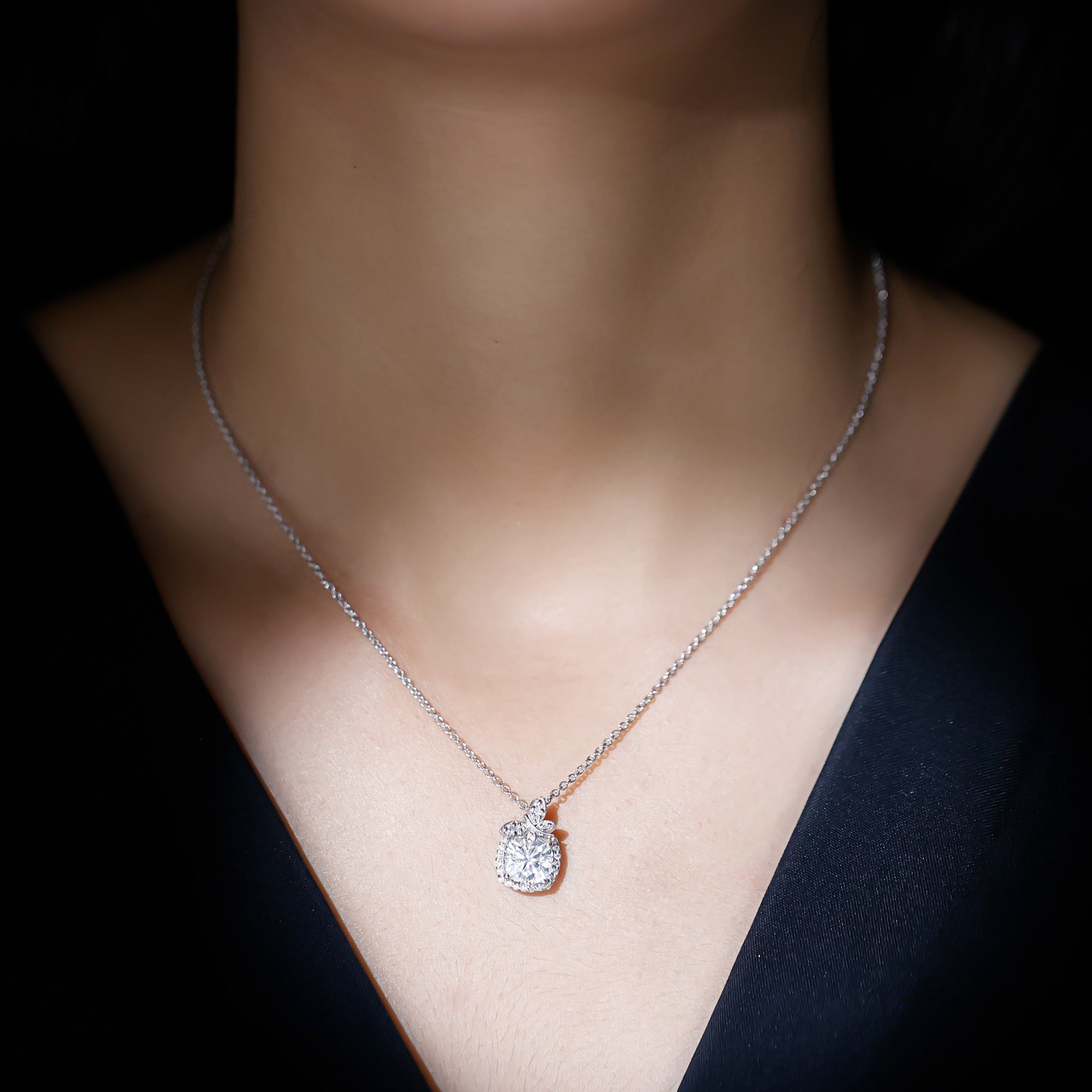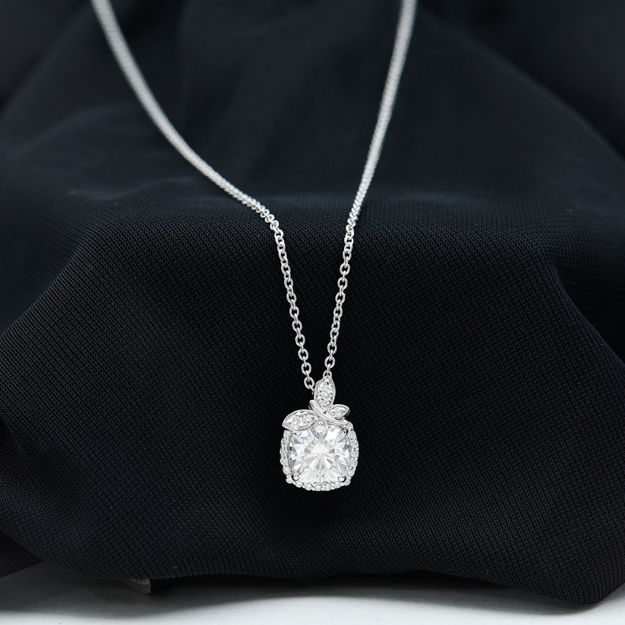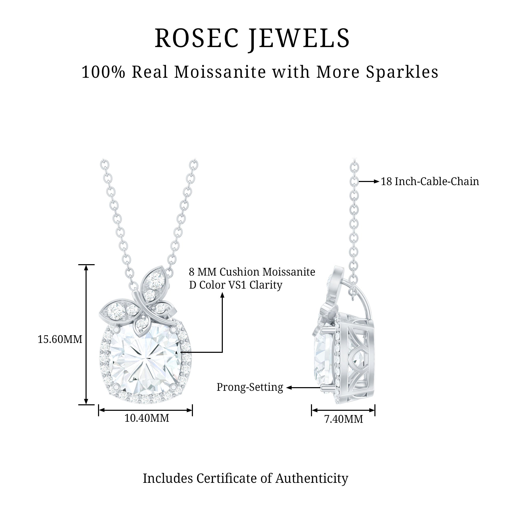 Graceful, radiant, and full of charm, this Moissanite Necklace Silver is the kind of piece that makes hearts skip a beat. At the center lies a stunning 8 MM cushion cut Moissanite stone that glows with unmatched brilliance and is set in secure prong setting. Framing this showstopper is a delicate halo of shimmering round cut stones. A cute butterfly motif preached at the top, its wings embedded with dainty stones and shaped in soft curves that feel both feminine and free-spirited. This Butterfly Pendant Necklace is a blend of romantic design and natures elegance. It is curated in 14k white gold plated silver, offering the luxury of gold with a modern and affordable twist. This Designer Pendant shines with D color VS1 clarity Moissanite stones, making it a smart and stunning choice for todays bride-to-be. Whether you are walking down the aisle, celebrating a birthday, anniversary, or simply treating yourself to something timeless, this Bridal Necklace for Wedding adds that perfect sparkle to your story.
