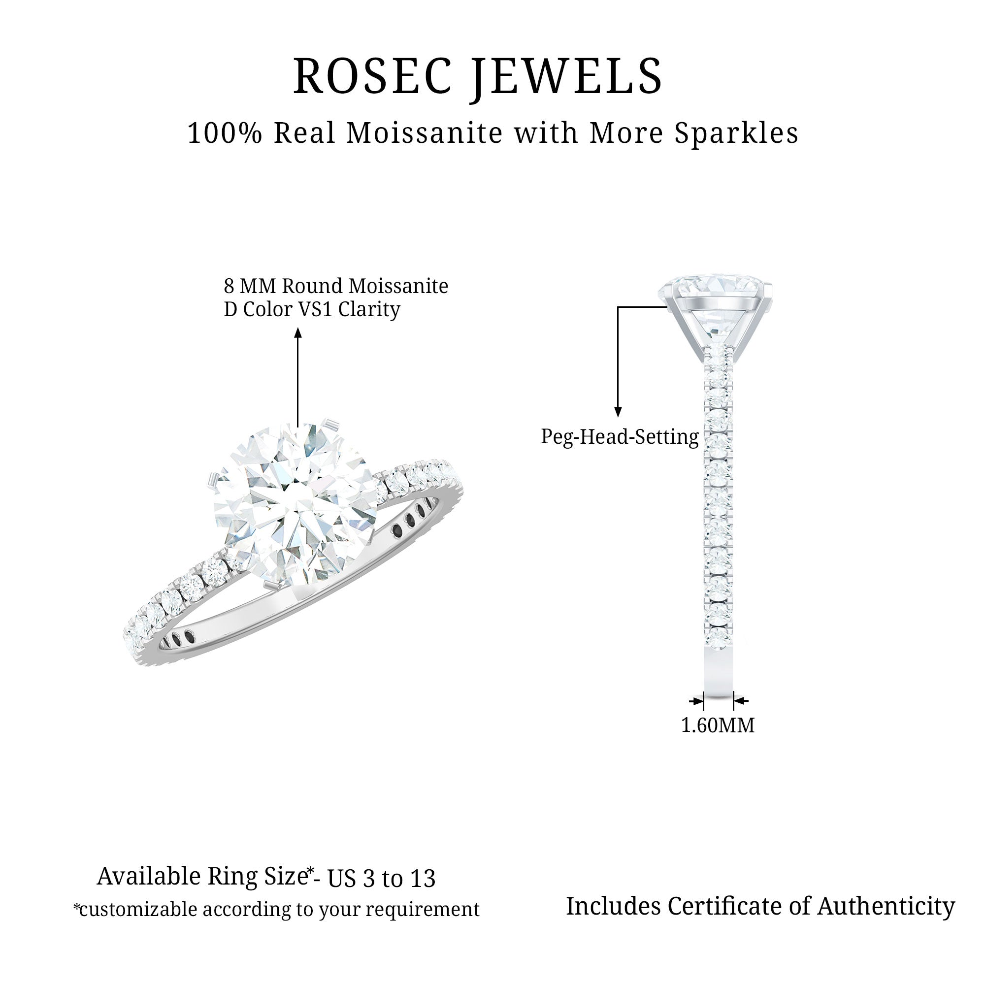 Seal vows of everlasting love with a ring that speaks directly to the heart. This Moissanite Engagement Ring captures the magic of devotion in the purest way. The dazzling 8 mm Round Shape Moissanite set in Peg Head Setting glows with every breath and every moment you share. Crafted in 925 Sterling Silver, the band offers a timeless frame that beautifully enhances the radiance of Moissanite. Delicate Side Stones line the band with a soft sparkle, creating a gentle cascade of light that adds depth, charm and irresistible elegance. This Solitaire Engagement Ring is a symbol of promises whispered, dreams shared and a future built hand in hand. Thoughtfully presented in a signature jewelry box and available in a range of sizes, this Moissanite Diamond Engagement Ring is ready for that perfect moment when words fall short, but love speaks louder than ever. Whether you are planning a heartfelt proposal or choosing a ring that reflects the purity of your bond, this shimmering Side Stone Engagement Ring is designed to make the moment unforgettable.