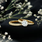 Celebrate your love with this exquisite Engagement Ring Set that features an 8 MM Round Shape Moissanite in Prong Setting and flanked with petite side stones. The Moissanite Ring Set features an Engagement Ring with an enhancer band. This Bridal Ring Set beholds the shine of D-Vs1 Quality Moissanite which makes the celebration brighter. This beautiful ring set will astonish your bride as it perfectly represents timeless elegance which represents the forever love. This Ring Set will be delivered in the signature jewelry box with the certificate of gemstone authentication to ensure the quality of the rings.
