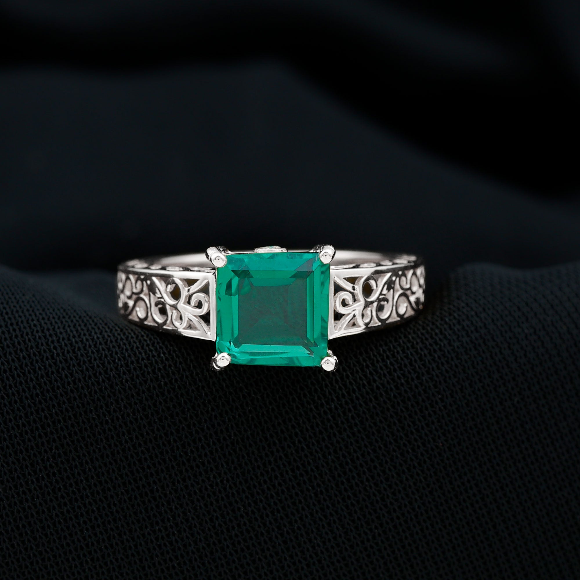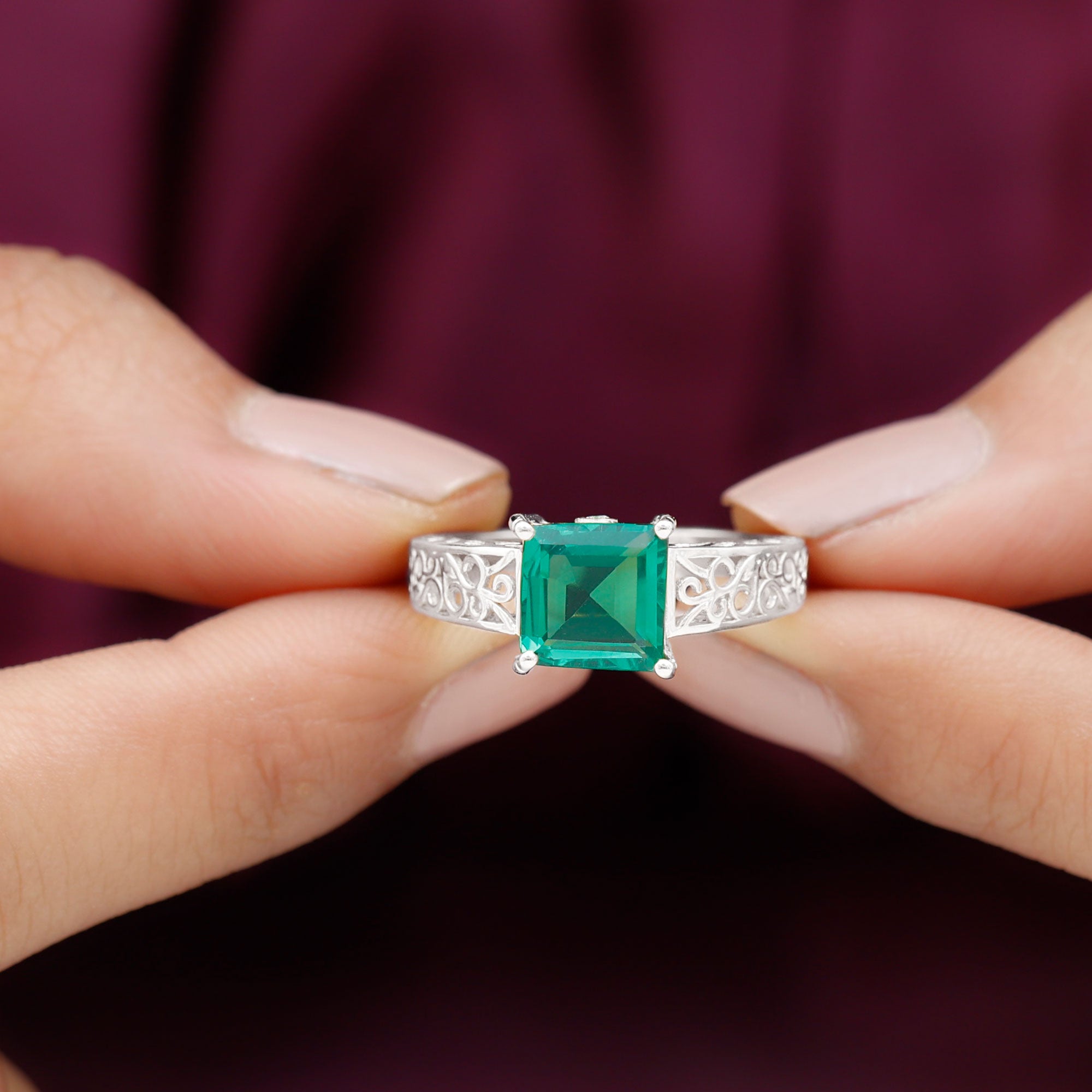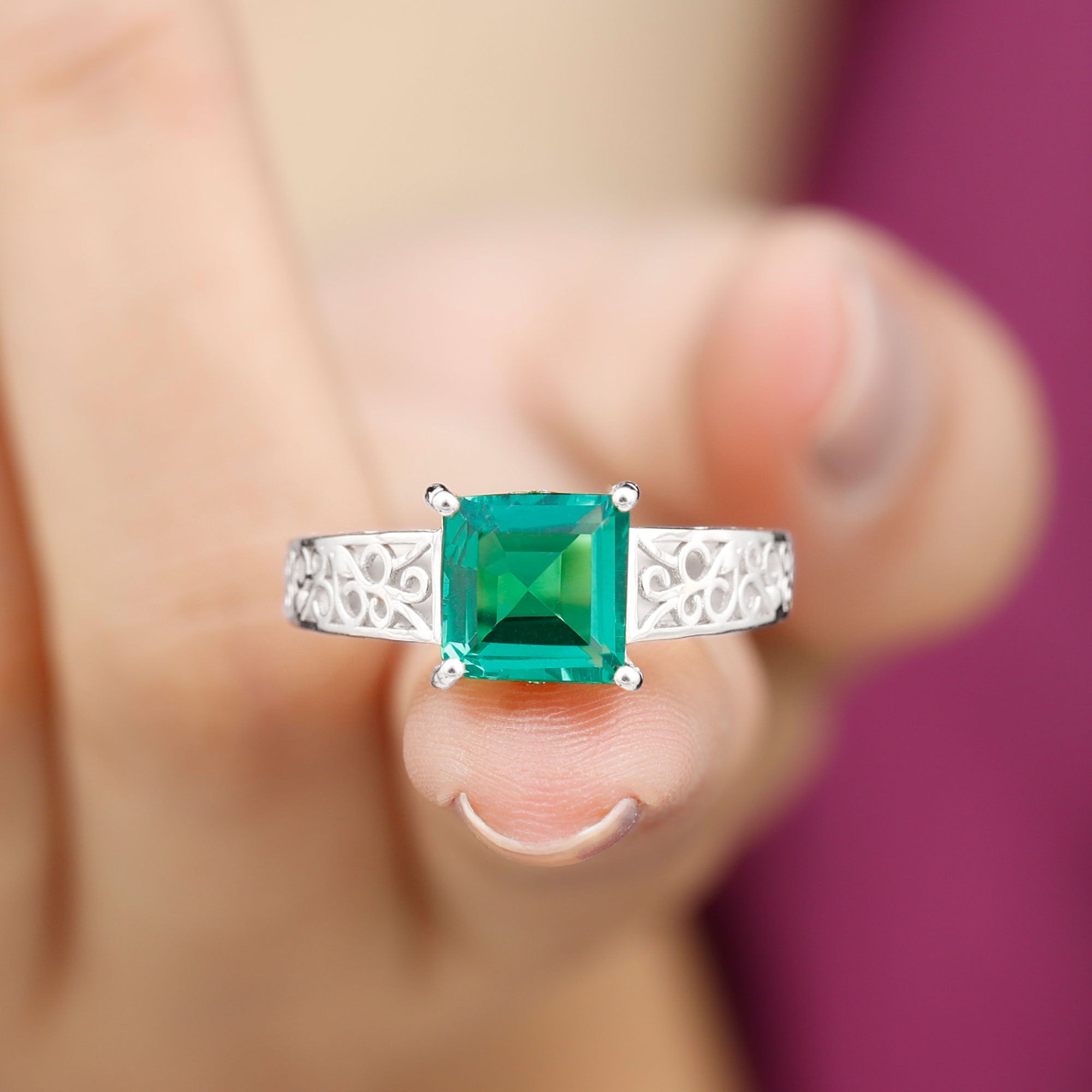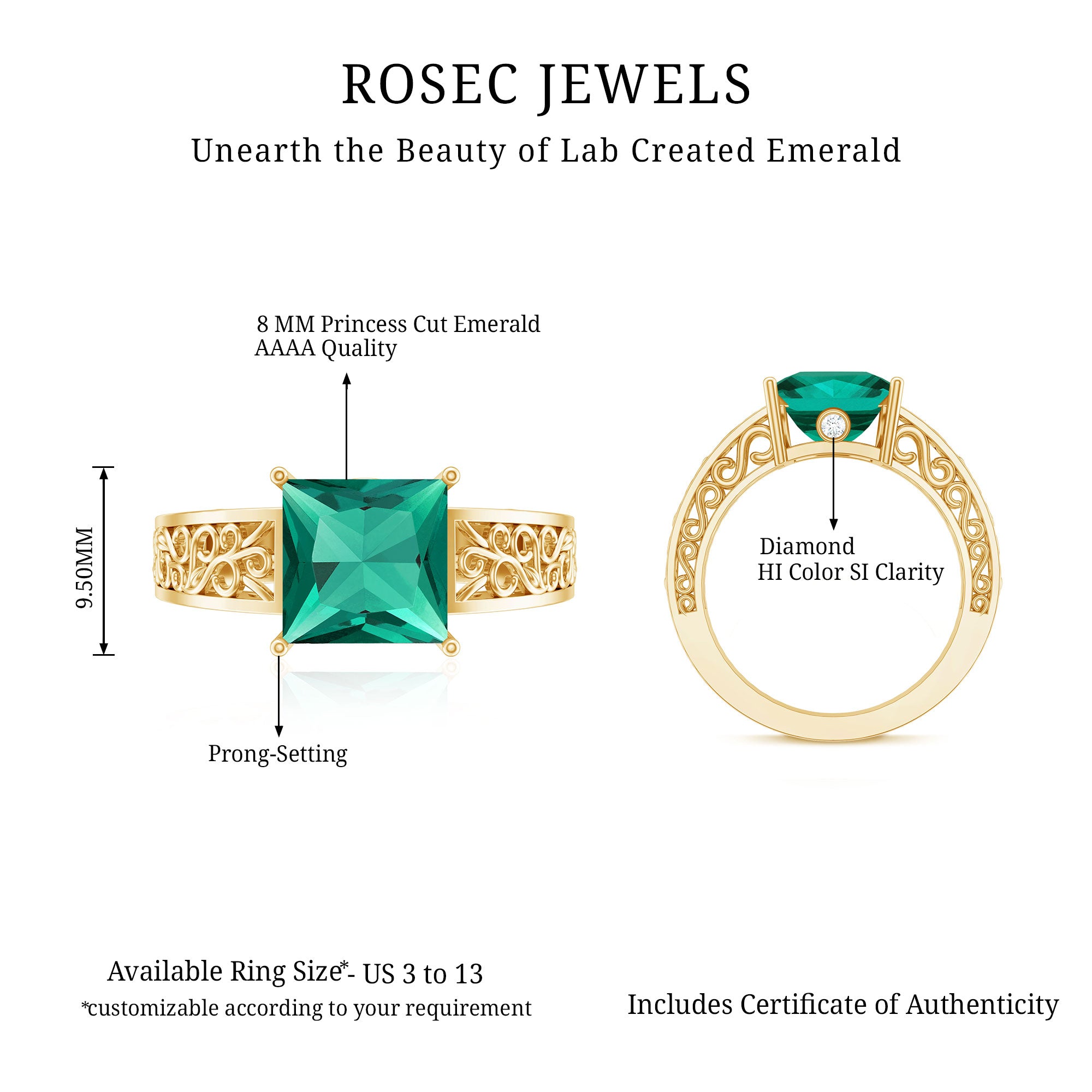 Certified 8 mm Princess Cut Lab Grown Emerald Filigree Engagement Ring
