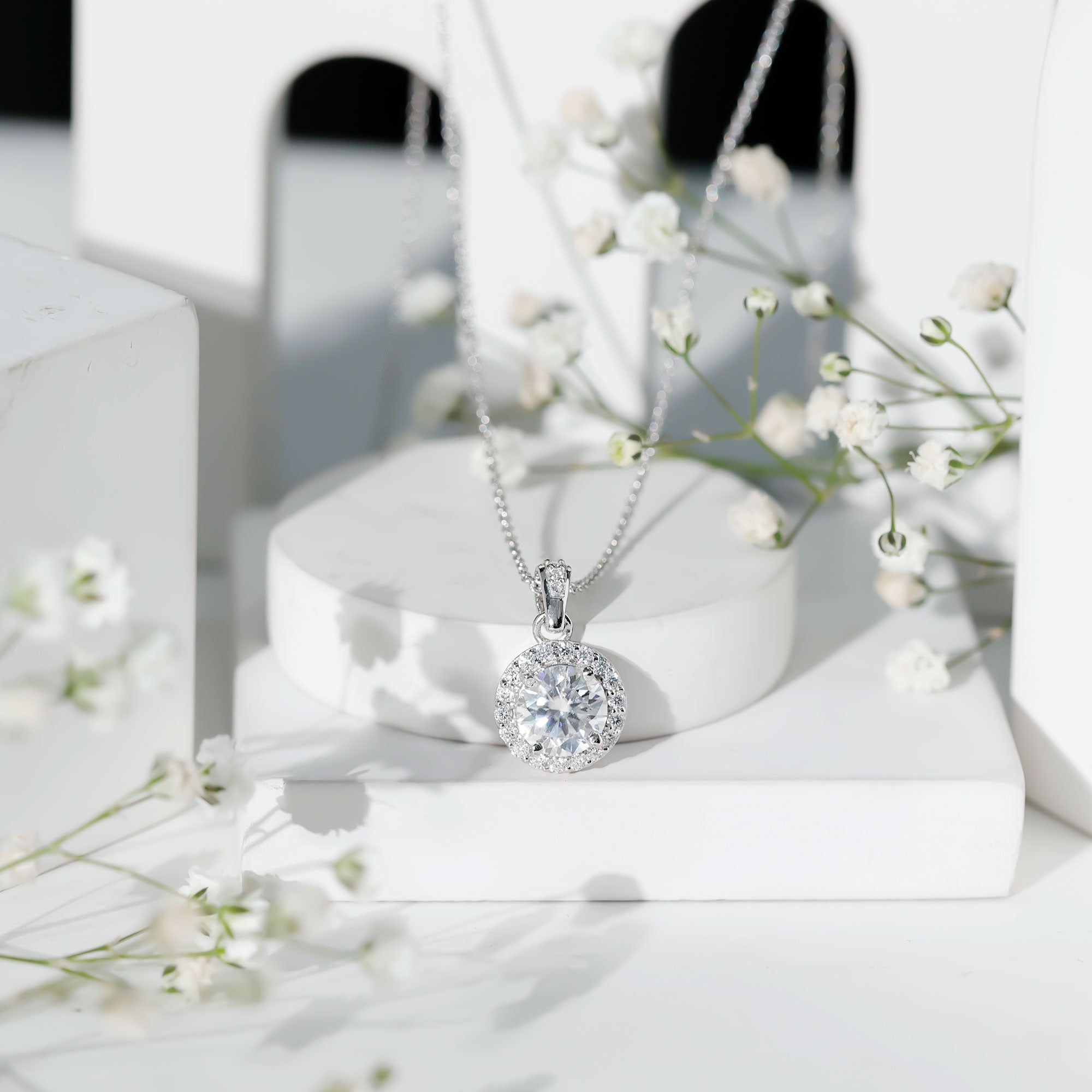 Elevate your office attire with this classic Round Zirconia Necklace, made from 14 Karat White Gold Plated Sterling Silver. This Halo Necklace is one of the most popular style for its beauty and elegance. Its not only comfortable and lightweight but also exudes elegance and luxury, featuring a dazzling array of round cut cubic zirconia that sparkles beautifully. This necklace features a soft, charming circle shaped pendant surrounded by a radiant halo, making it an ideal choice for any special occasion. It sparkles with a center 8 MM Round Cut Cubic Zirconia of AAAAA quality securely set in claw setting. The bail is further enhanced with sparkling stones, adding a layer of brilliance to the design. The pendant rests on a cable chain that secures with a lobster clasp, allowing you to adjust the length effortlessly to achieve the perfect fit around your neck. Elegance and sophistication at its finest, this CZ Diamond Pendant Necklace is sure to make a perfect, versatile addition to any jewelry collection.
