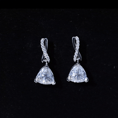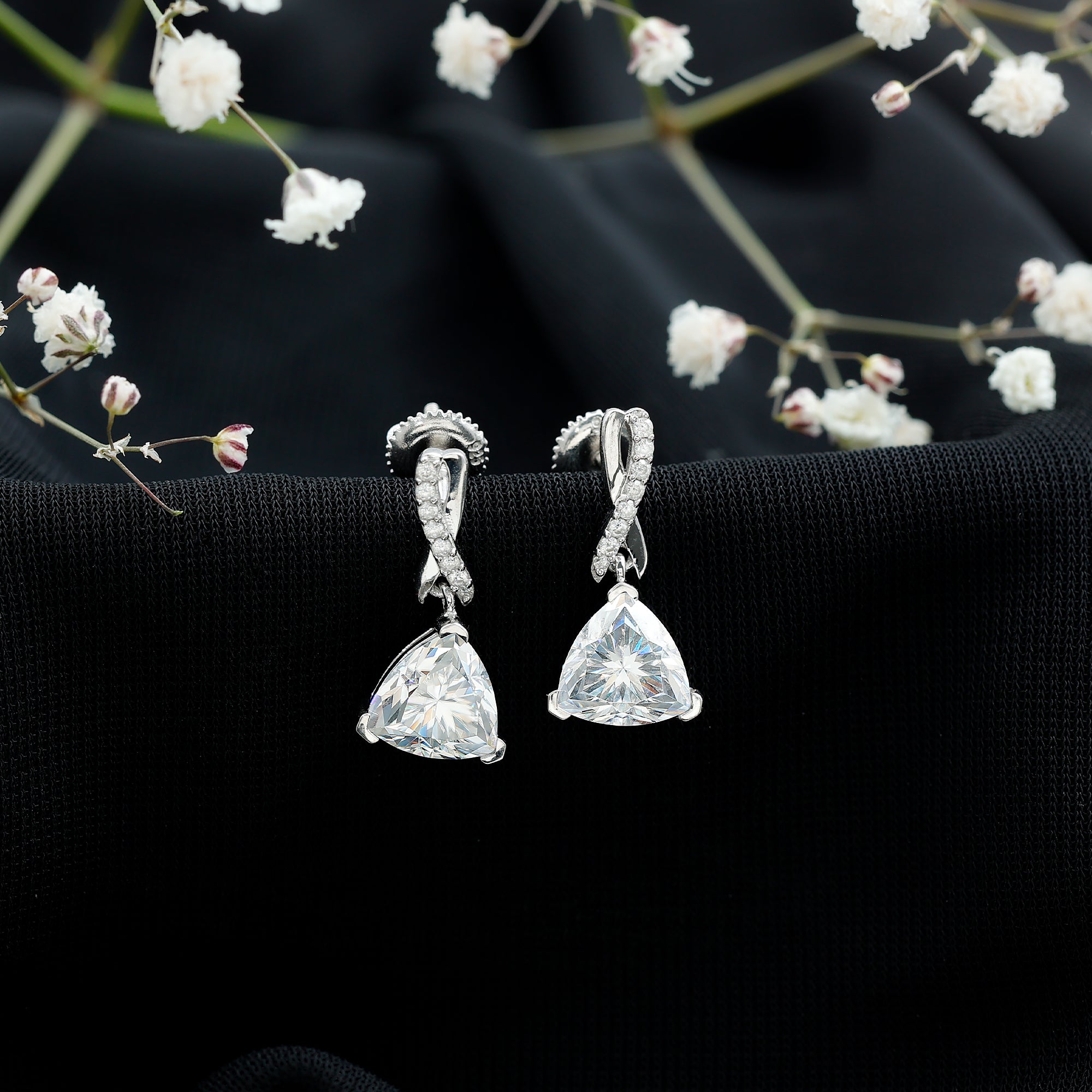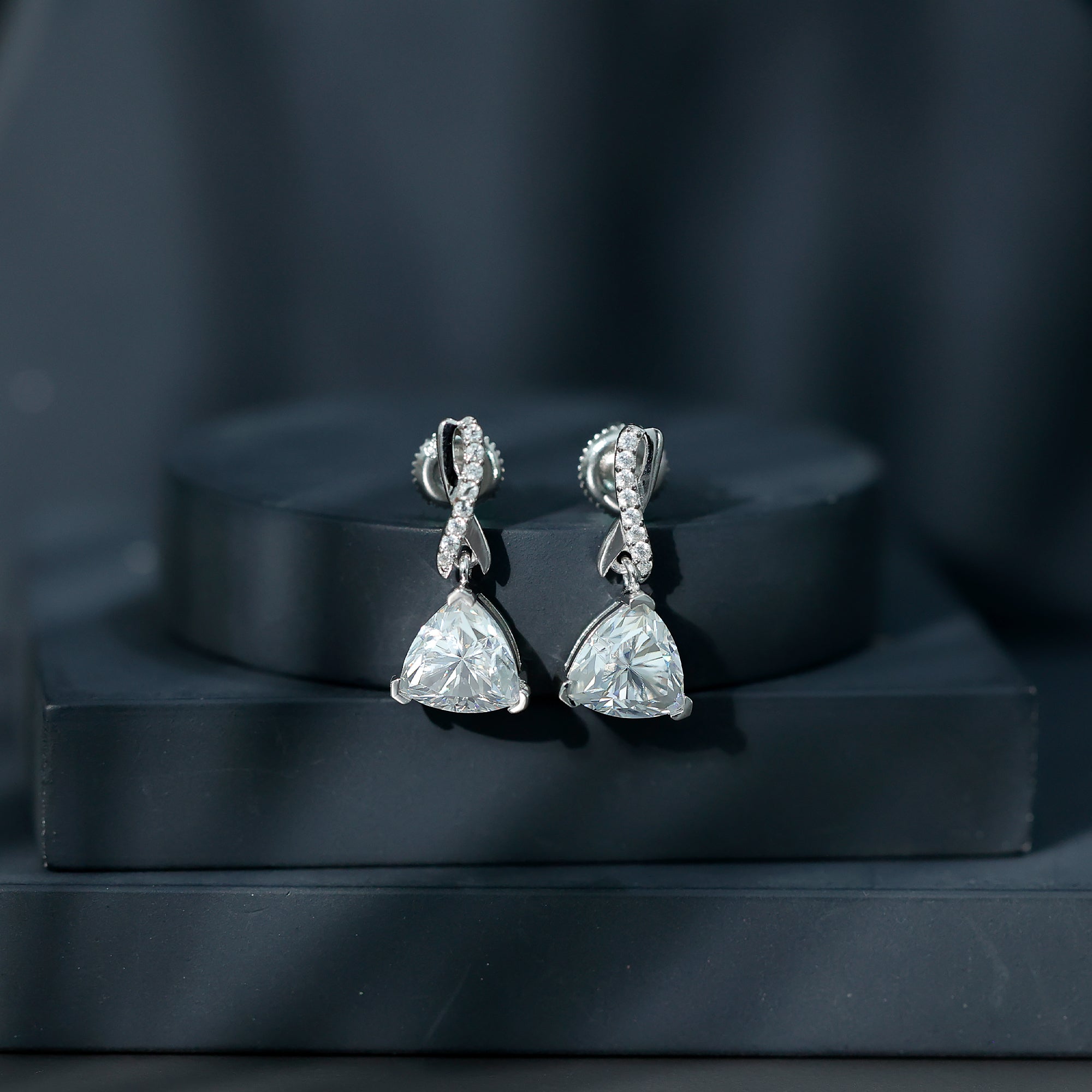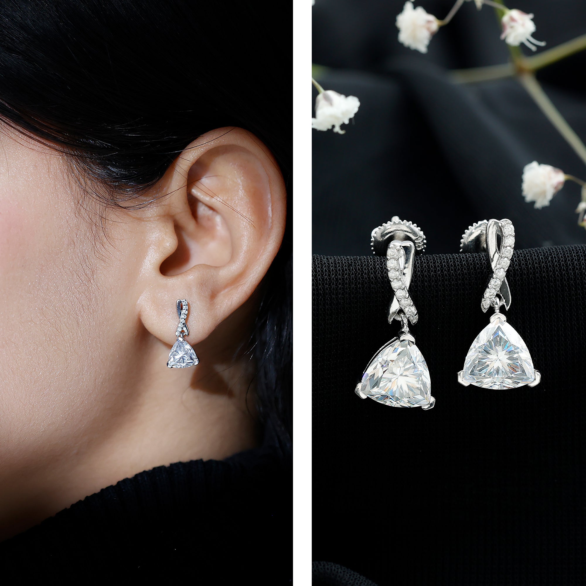 Adorn your ears with these Moissanite Drop Earrings handcrafted with 14K White Gold Plated Silver. It features an 8 MM Trilliant Cut Moissanite securely placed in Prong Setting that is accentuated with Moissanite studded infinity pattern. These Drop Dangle Earrings have an inner radiance that amplifies your elegance and elevates your style game. These Infinity Earrings bear a classic shine of D-VS1 Quality Moissanite that makes them perfect to beautify your ears. These earrings are perfectly crafted for your special look. The designer earrings will be delivered to you in a velvet pouch with a certificate of authenticity to ensure the high quality of the gemstone.