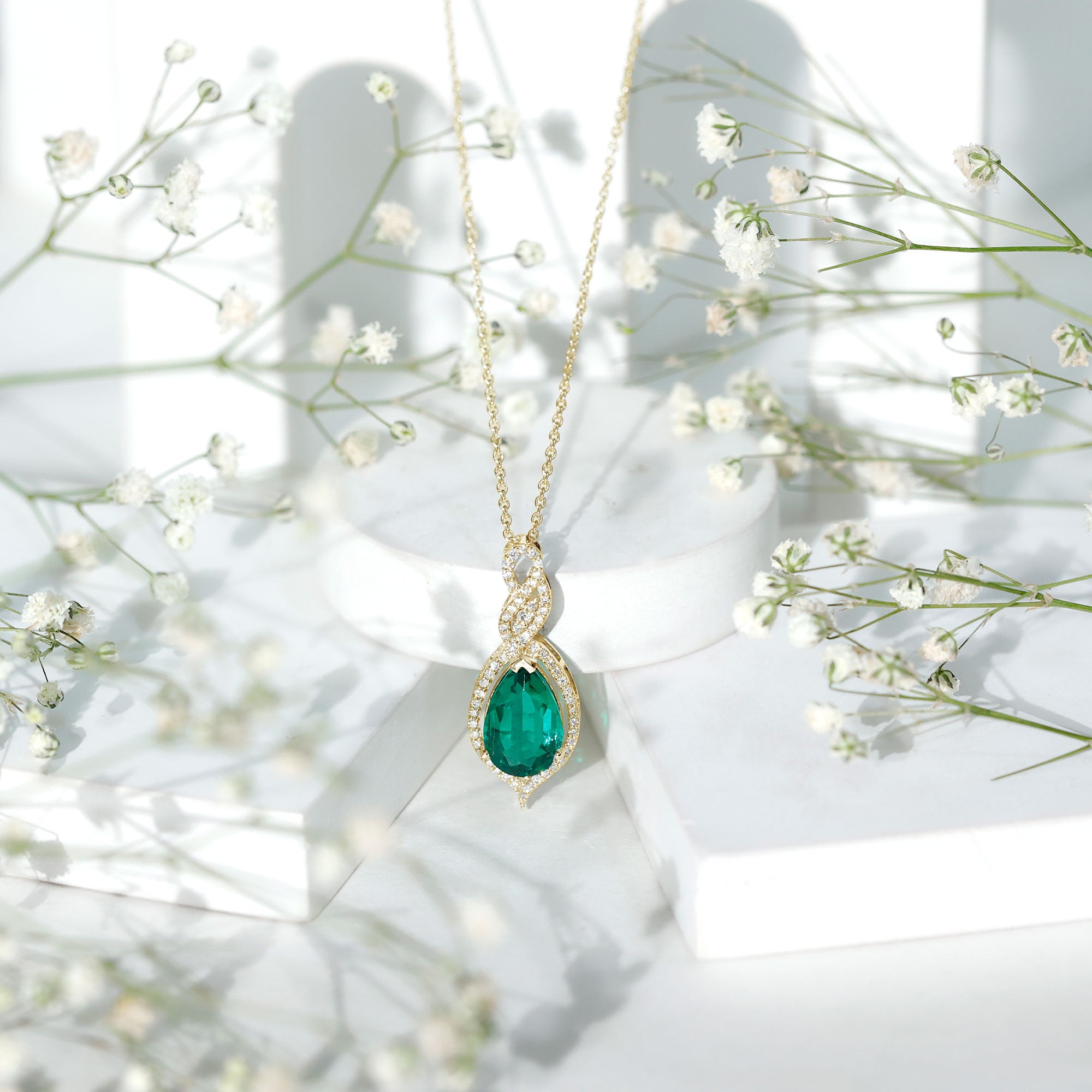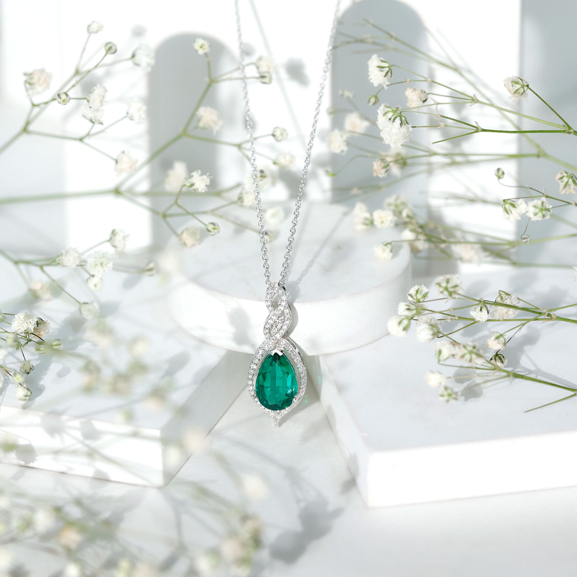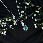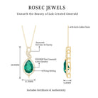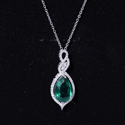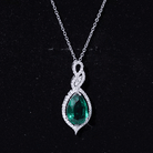 Unveil the beautiful allure of this Lab Grown Emerald Pendant. The pendant features an 8X10 MM Pear Shape Lab Created Emerald delicately placed in Prong Setting encircled with round shape diamonds. The infinity design adds to its enchantment, as round Diamond stones embrace the magnificent hue of the center stone, illuminating it with brilliance. This Infinity Pendant is guaranteed to make heads turn wherever you grace with its exquisite beauty. The pendant will be delivered to you in a signature jewelry box for the storage.