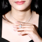Dazzle your neckline with this CZ Diamond Bridal Necklace, precisely crafted with 14K White Gold Plated Silver. The pendant features an 8X10 MM Oval Shape Zircon secured in Prong Setting and encircled by a halo of smaller stones. This large pendant is accentuated with a Diamond studded bail and dangles with a cable chain. This Oval Pendant dazzles with the classic shine of AAAAA Quality Zirconia, which perfectly sits on the neckline. This Cubic Zirconia Pendant can be a thoughtful gift to your special one on an occasion such as an Anniversary or birthday.