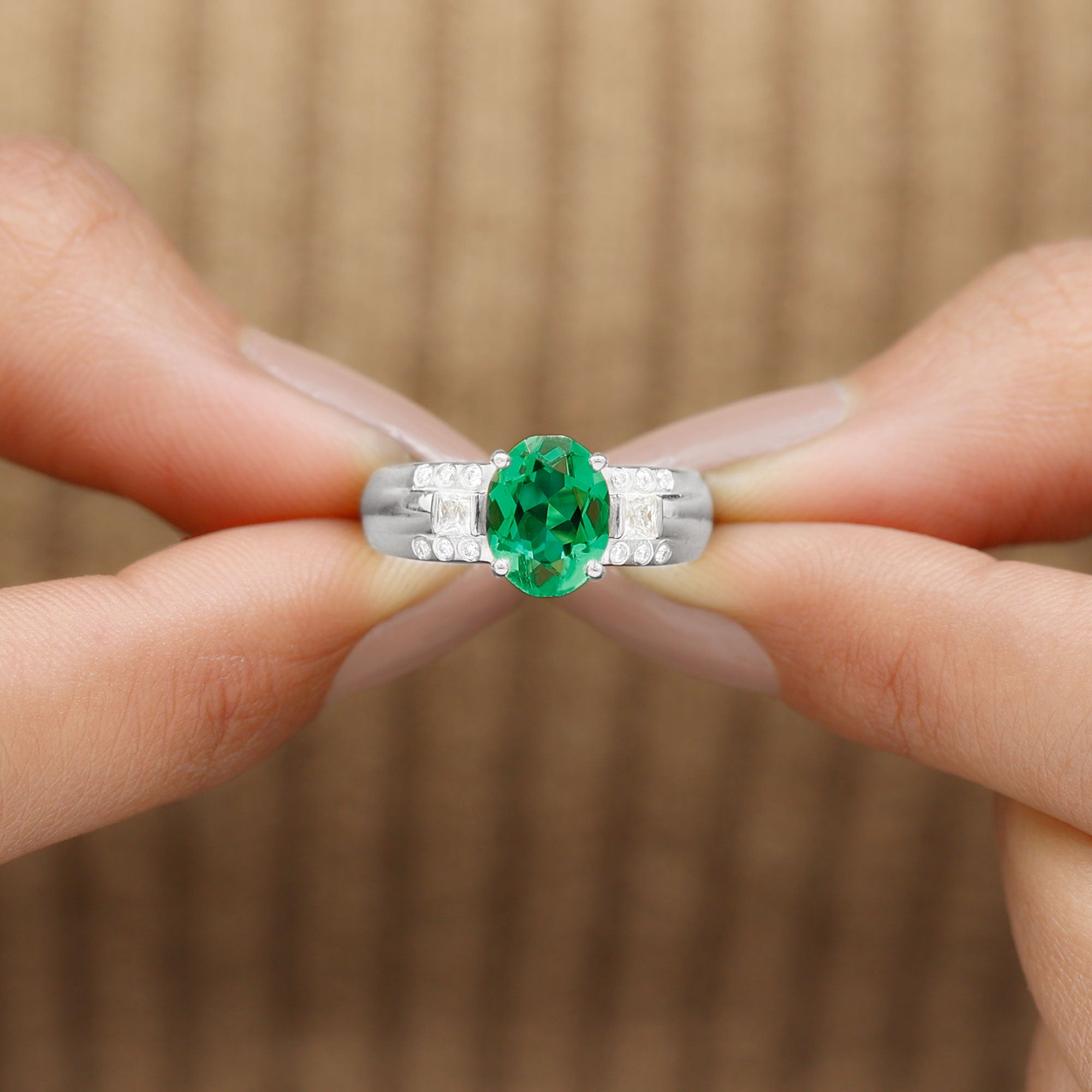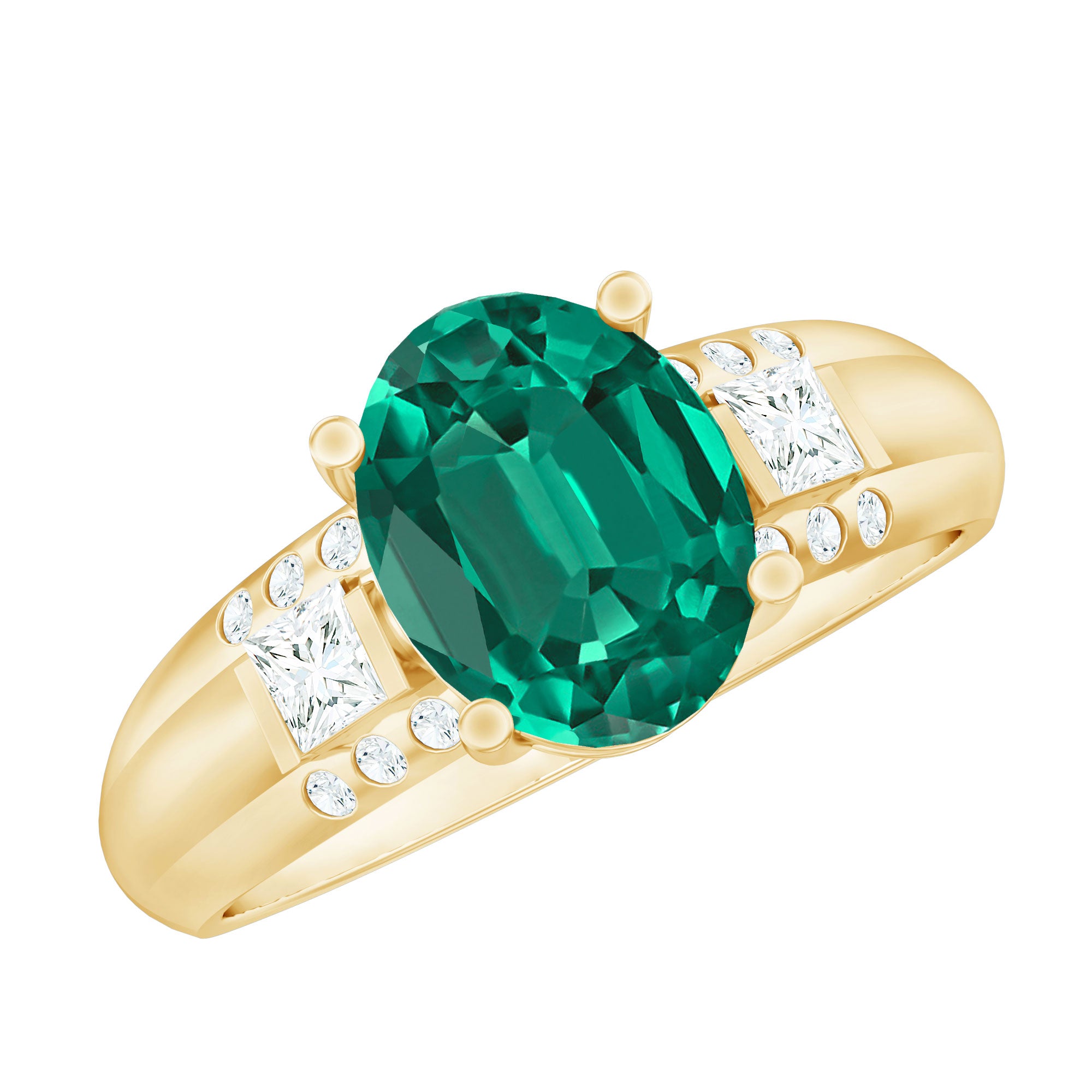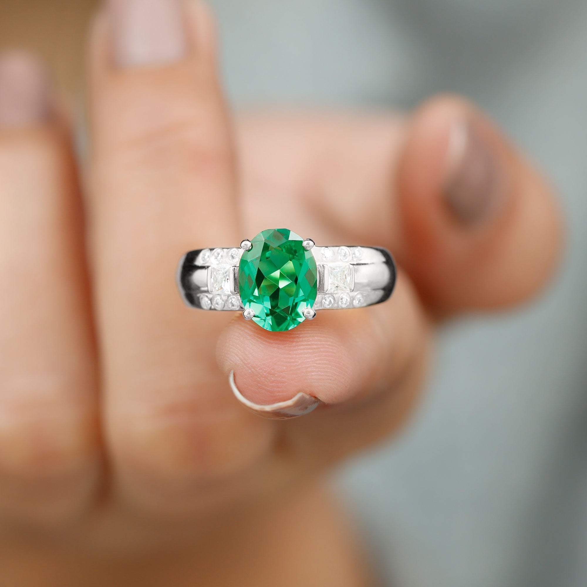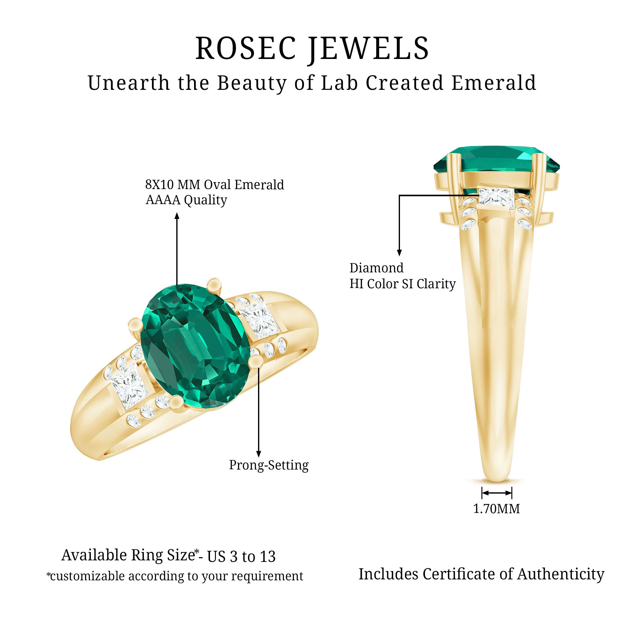 Make a bold statement of love with this striking Oval Engagement Ring, that is designed for the one who shines brightest in your life. At the center of this Fine Ring is an elegant and big 8X10 mm Oval Shape Lab Created Emerald set in Prong Setting, that radiates rich green hue. Flanking the center AAAA Quality Lab Emerald are carefully placed Round and Princess Cut Diamond stones on both sides that add dazzling brilliance and a touch of modern glamour. The combination of different diamond shapes creates a unique contrast that perfectly complements the vibrant Lab Emerald and gives this Lab Emerald Diamond Engagement Ring an unforgettable sparkle. This stunning Lab Grown Emerald Ring is perfect for a woman who appreciates bold elegance with meaning. Whether it is for an engagement, anniversary or a special moment of celebration, this Oval Emerald Ring (Lab Grown) makes a lasting impression. Available in various ring sizes and presented in a signature jewelry box, this Statement Ring is ready to be gifted with pride. Ideal for someone who loves distinctive jewelry, this Lab Grown Emerald Engagement Ring reflects your promise and your shared journey ahead. Let it be the symbol of a love as unique and brilliant as she is.