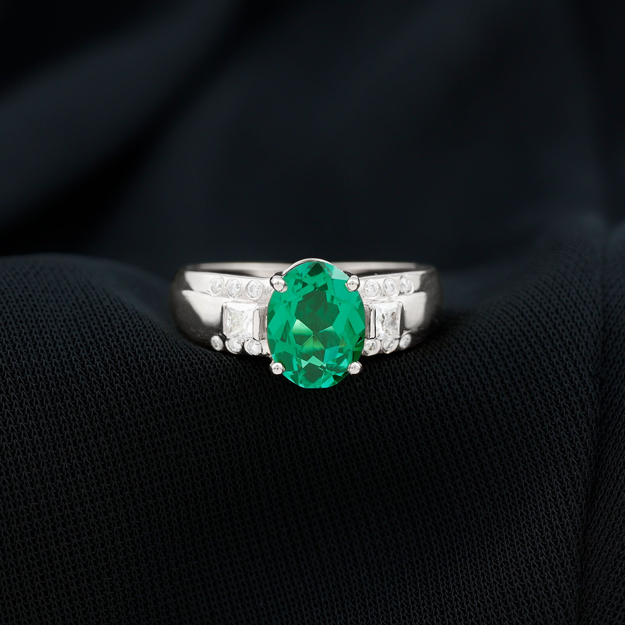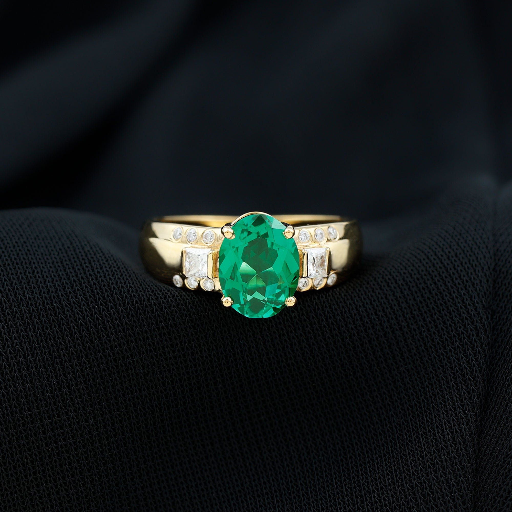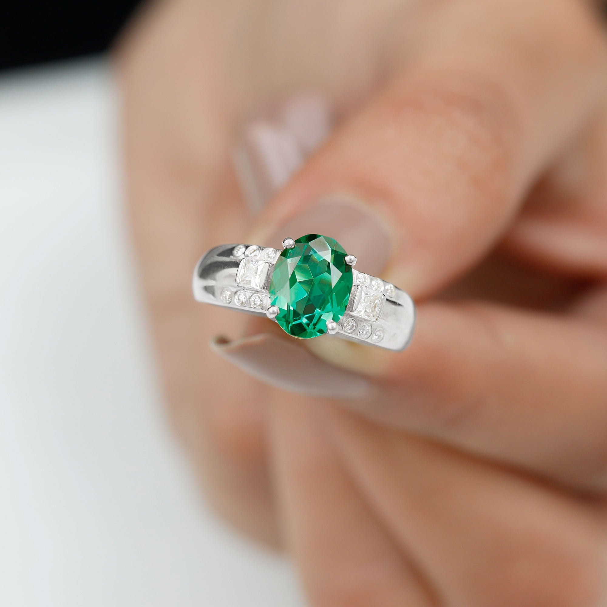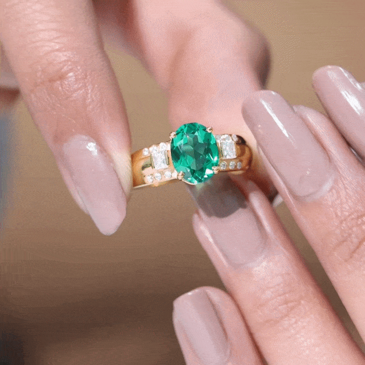 Make a bold statement of love with this striking Oval Engagement Ring, that is designed for the one who shines brightest in your life. At the center of this Fine Ring is an elegant and big 8X10 mm Oval Shape Lab Created Emerald set in Prong Setting, that radiates rich green hue. Flanking the center AAAA Quality Lab Emerald are carefully placed Round and Princess Cut Diamond stones on both sides that add dazzling brilliance and a touch of modern glamour. The combination of different diamond shapes creates a unique contrast that perfectly complements the vibrant Lab Emerald and gives this Lab Emerald Diamond Engagement Ring an unforgettable sparkle. This stunning Lab Grown Emerald Ring is perfect for a woman who appreciates bold elegance with meaning. Whether it is for an engagement, anniversary or a special moment of celebration, this Oval Emerald Ring (Lab Grown) makes a lasting impression. Available in various ring sizes and presented in a signature jewelry box, this Statement Ring is ready to be gifted with pride. Ideal for someone who loves distinctive jewelry, this Lab Grown Emerald Engagement Ring reflects your promise and your shared journey ahead. Let it be the symbol of a love as unique and brilliant as she is.