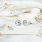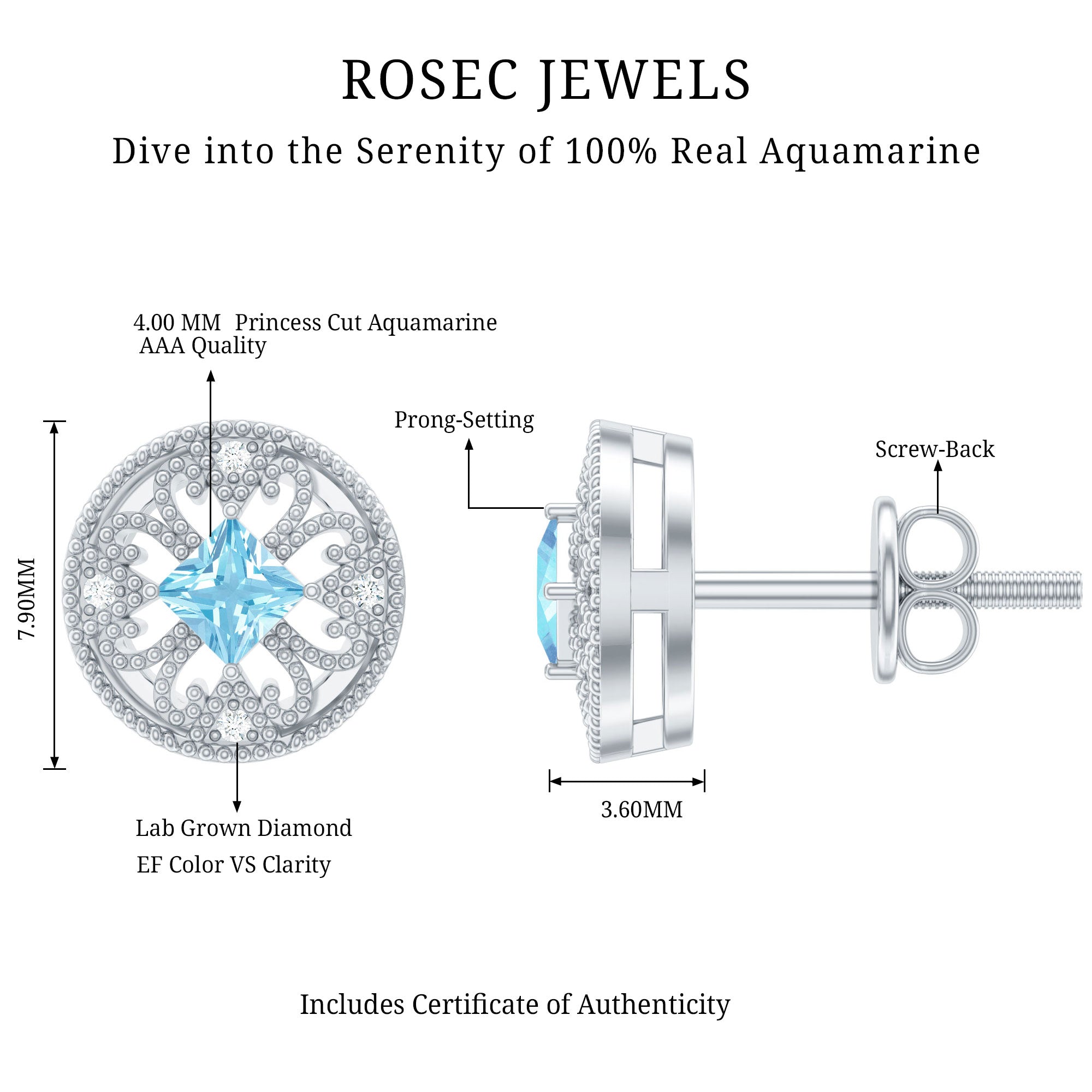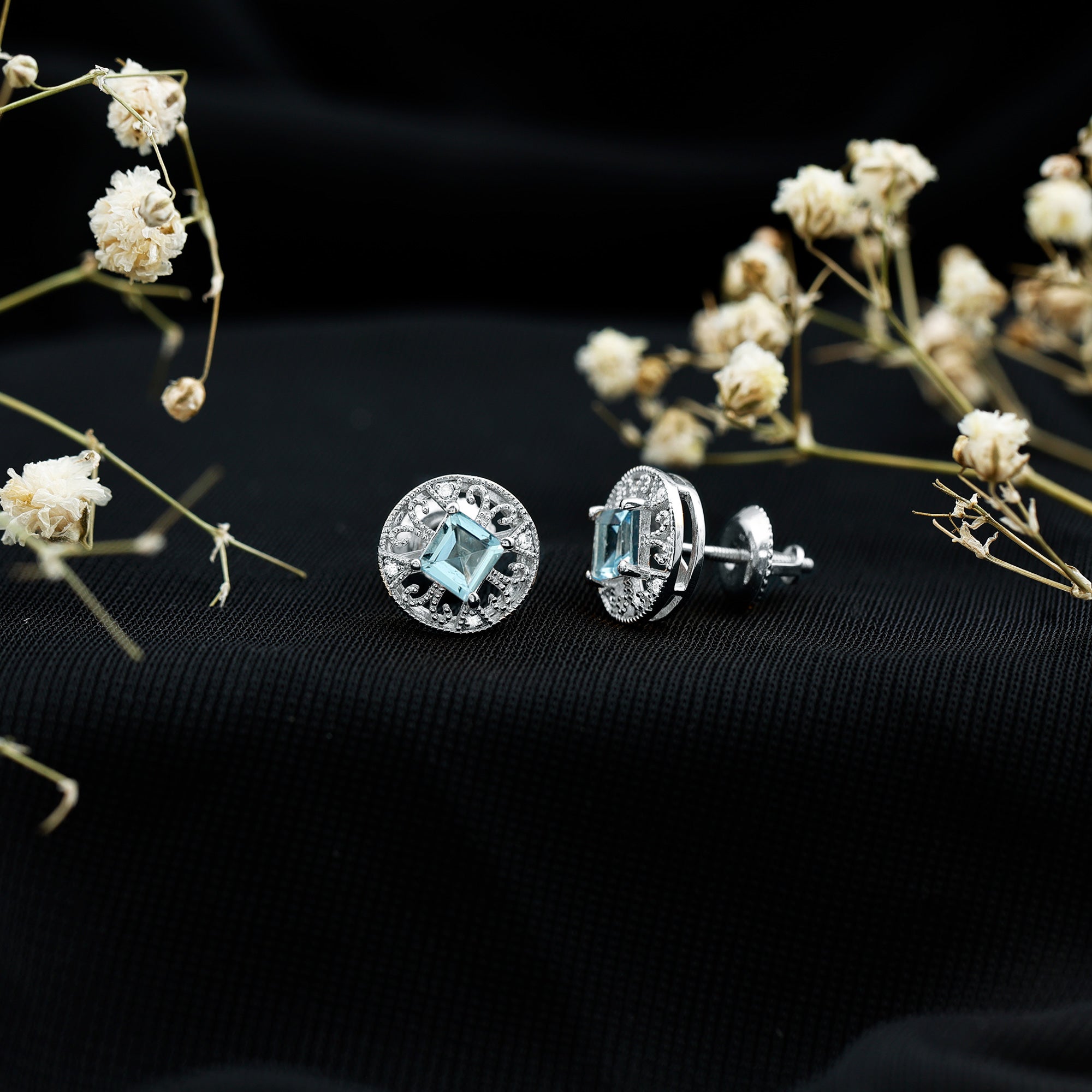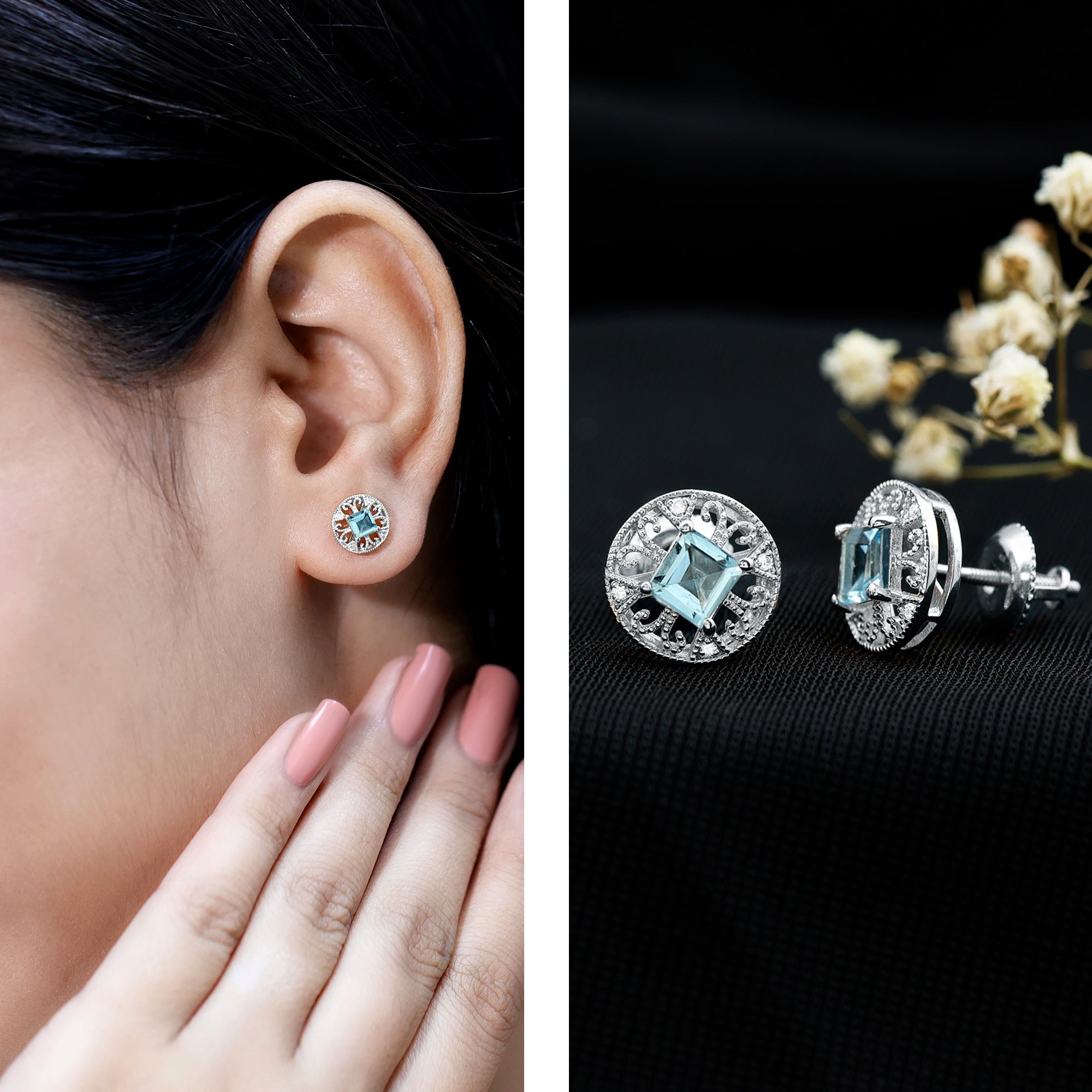 Add a touch of timeless elegance and cool sophistication to your look with these Aquamarine Stud Earrings. Designed to blend everyday wearability with vintage charm, these beautifully crafted Vintage Stud Earrings feature a captivating princess cut lab created aquamarine set in 14K white gold plated silver. Surrounding the aquamarine is a delicately detailed frame, inspired by antique design elements. Intricate beaded accents form an ornate pattern that echoes old-world craftsmanship, giving the Circle Earrings a romantic and heirloom-like feel. To elevate the look, sparkling round lab created diamonds are thoughtfully placed between the motifs, offering just the right contrast and a soft shimmer that complements the tranquil hue of the aquamarine. Made for comfort and secure wear, these Vintage Aquamarine Earrings come with sturdy screw-back closures, ensuring you can wear them with confidence from morning to evening. Whether youre attending a celebration, heading to a special dinner, or simply looking to elevate your everyday ensemble, these Aquamarine and Diamond Earrings offer the perfect blend of charm and sophistication.