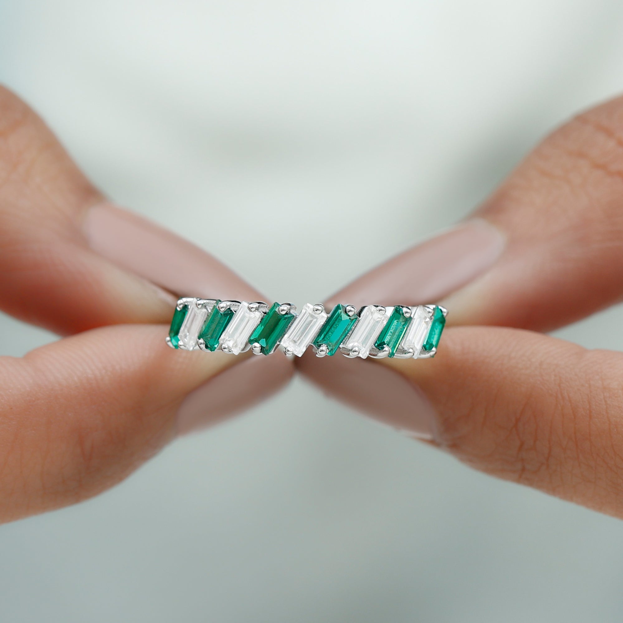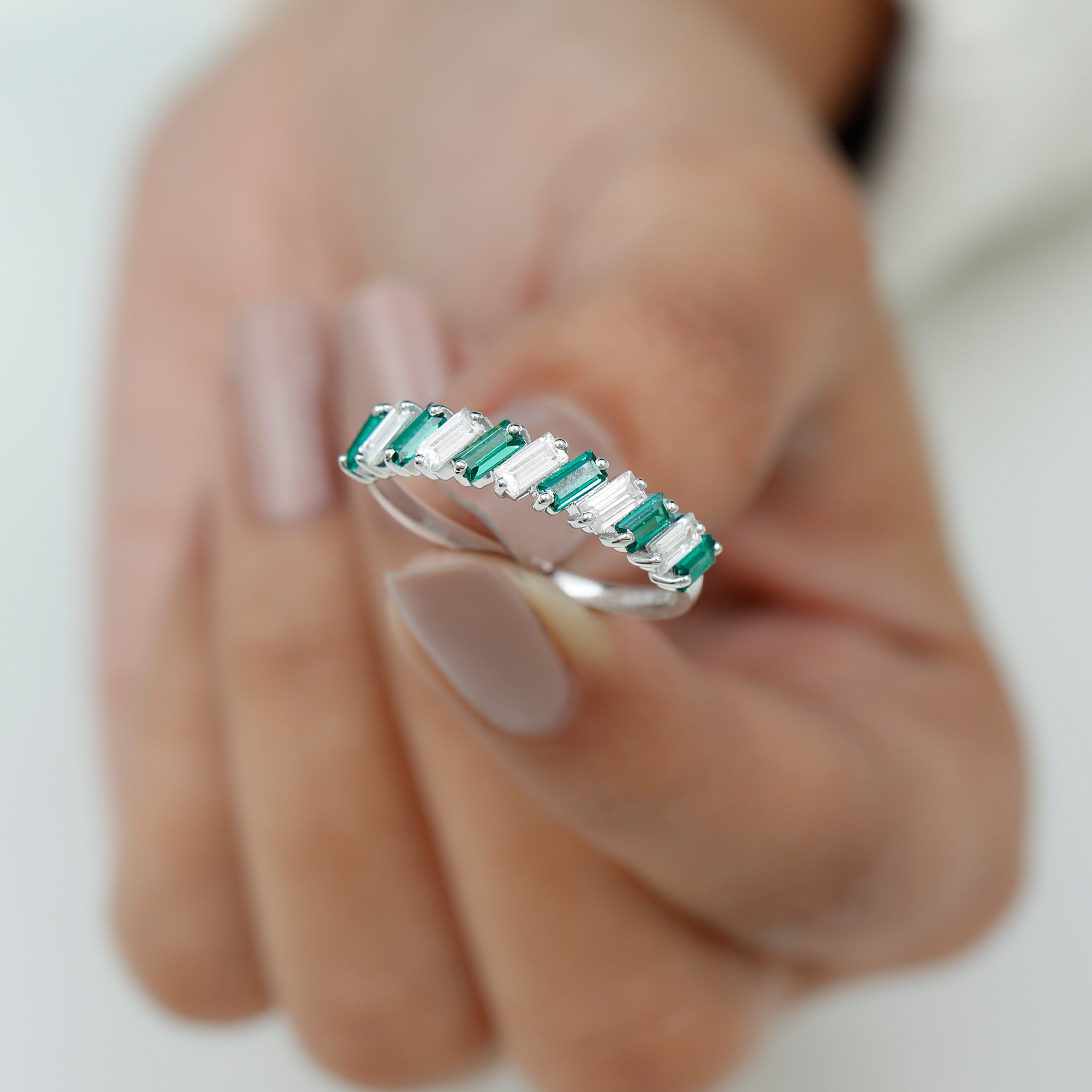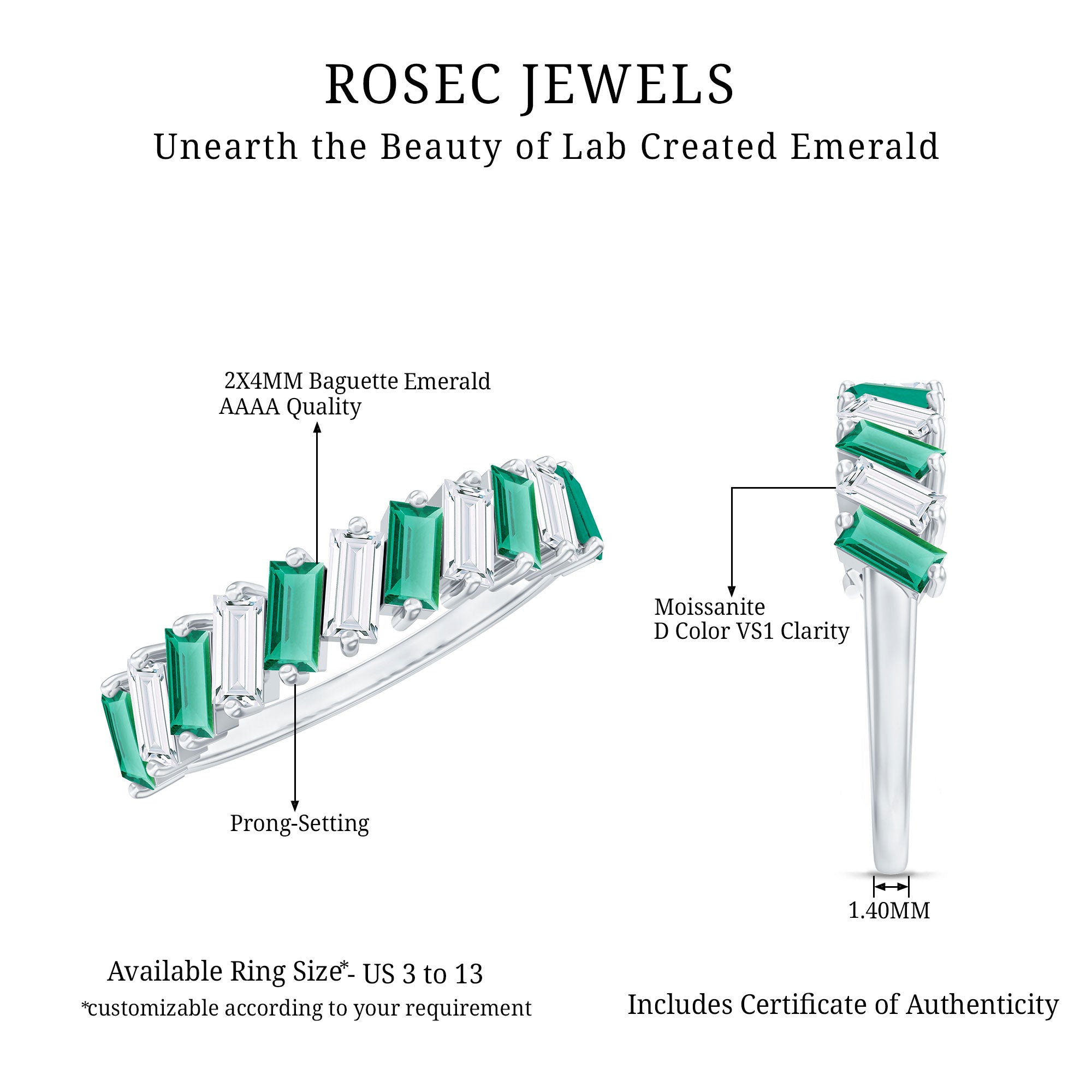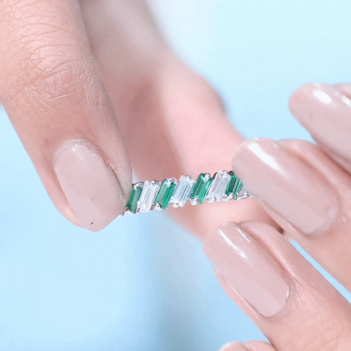 Shine bright and celebrate your everlasting bond with this mesmerizing Half Eternity Band. Designed to captivate attention, this unique band features 2X4 mm Baguette Shape Lab Created Emerald and Moissanite stones, each placed in a tilted 2 Prong Setting in an alternate pattern along the band. Creating a modern and eye-catching rhythm that enhances the brilliance and color contrast between the vibrant green AAAA Quality Lab Emerald and the dazzling D-VS1 Quality Moissanite stones. The half eternity design symbolizes both the enduring love you share and the promise of many more beautiful moments ahead. Unlike a full eternity band, this Lab Grown Emerald Ring is comfortable for everyday wear while still offering remarkable sparkle. Whether gifted on a wedding anniversary, milestone celebration or as a meaningful reminder of your lifelong commitment, this Lab Emerald Anniversary Band stands as a timeless piece of jewelry. Its thoughtful design and meaningful symbolism make it an ideal choice for those who appreciate beauty with purpose. Presented in an elegant jewelry box, this Wedding Anniversary Ring is destined to be treasured forever as a symbol of love that grows stronger with every passing year.