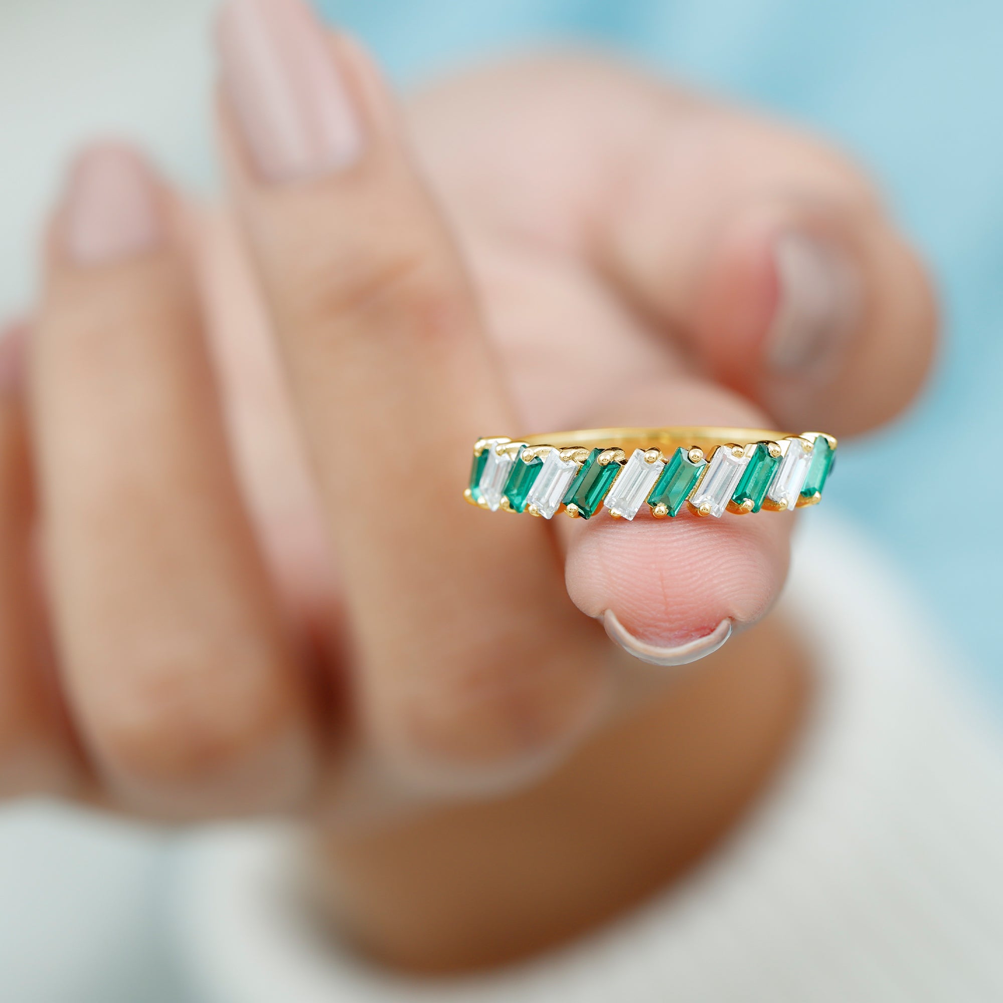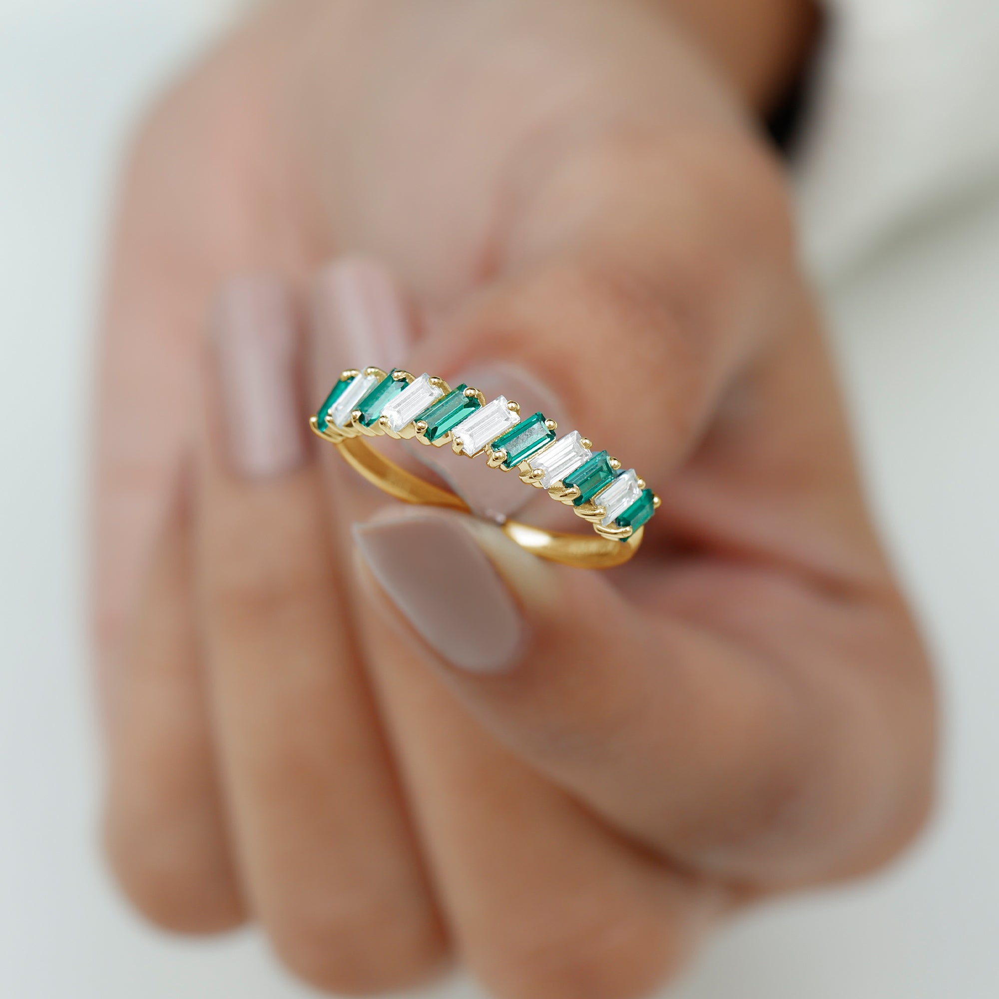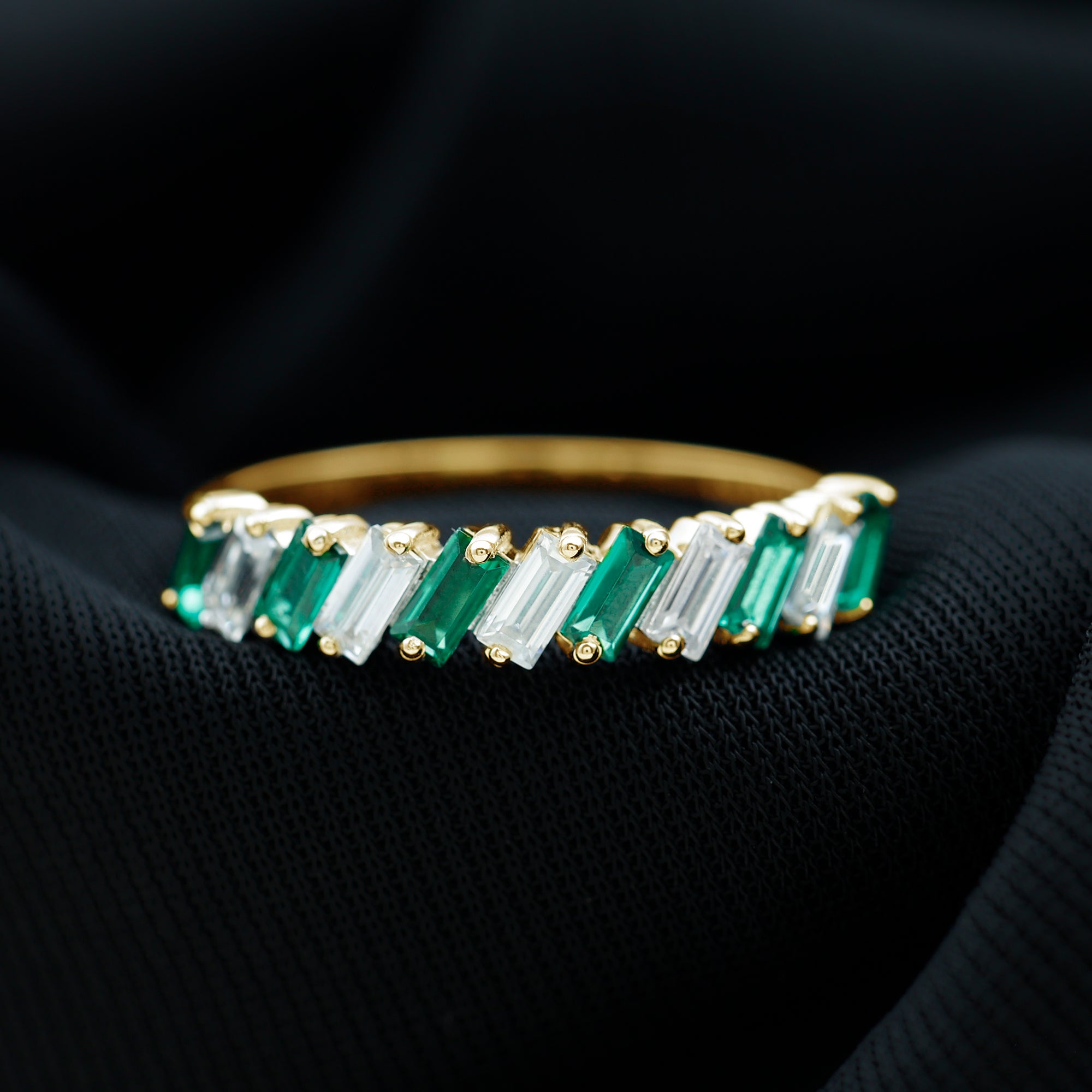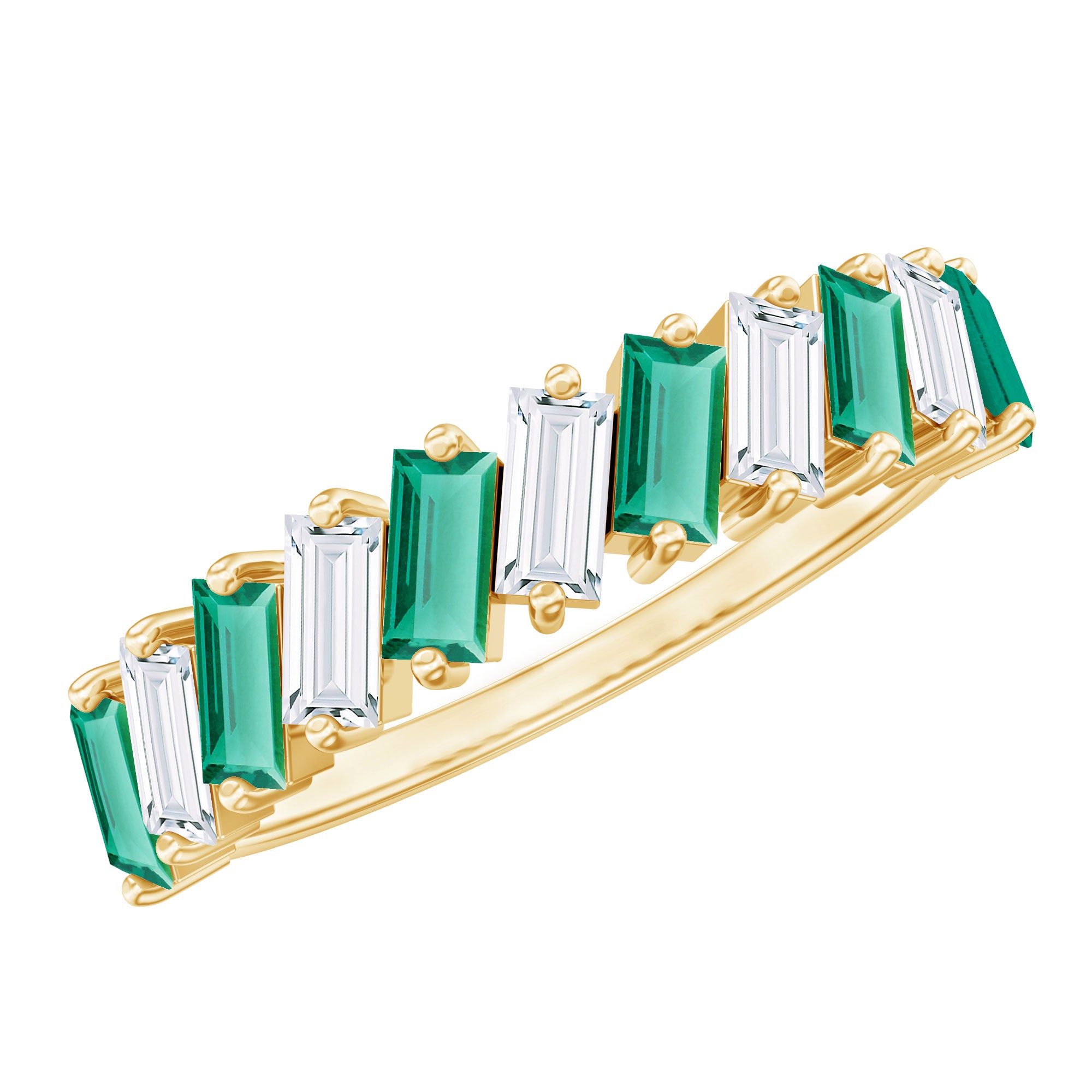 Shine bright and celebrate your everlasting bond with this mesmerizing Half Eternity Band. Designed to captivate attention, this unique band features 2X4 mm Baguette Shape Lab Created Emerald and Moissanite stones, each placed in a tilted 2 Prong Setting in an alternate pattern along the band. Creating a modern and eye-catching rhythm that enhances the brilliance and color contrast between the vibrant green AAAA Quality Lab Emerald and the dazzling D-VS1 Quality Moissanite stones. The half eternity design symbolizes both the enduring love you share and the promise of many more beautiful moments ahead. Unlike a full eternity band, this Lab Grown Emerald Ring is comfortable for everyday wear while still offering remarkable sparkle. Whether gifted on a wedding anniversary, milestone celebration or as a meaningful reminder of your lifelong commitment, this Lab Emerald Anniversary Band stands as a timeless piece of jewelry. Its thoughtful design and meaningful symbolism make it an ideal choice for those who appreciate beauty with purpose. Presented in an elegant jewelry box, this Wedding Anniversary Ring is destined to be treasured forever as a symbol of love that grows stronger with every passing year.