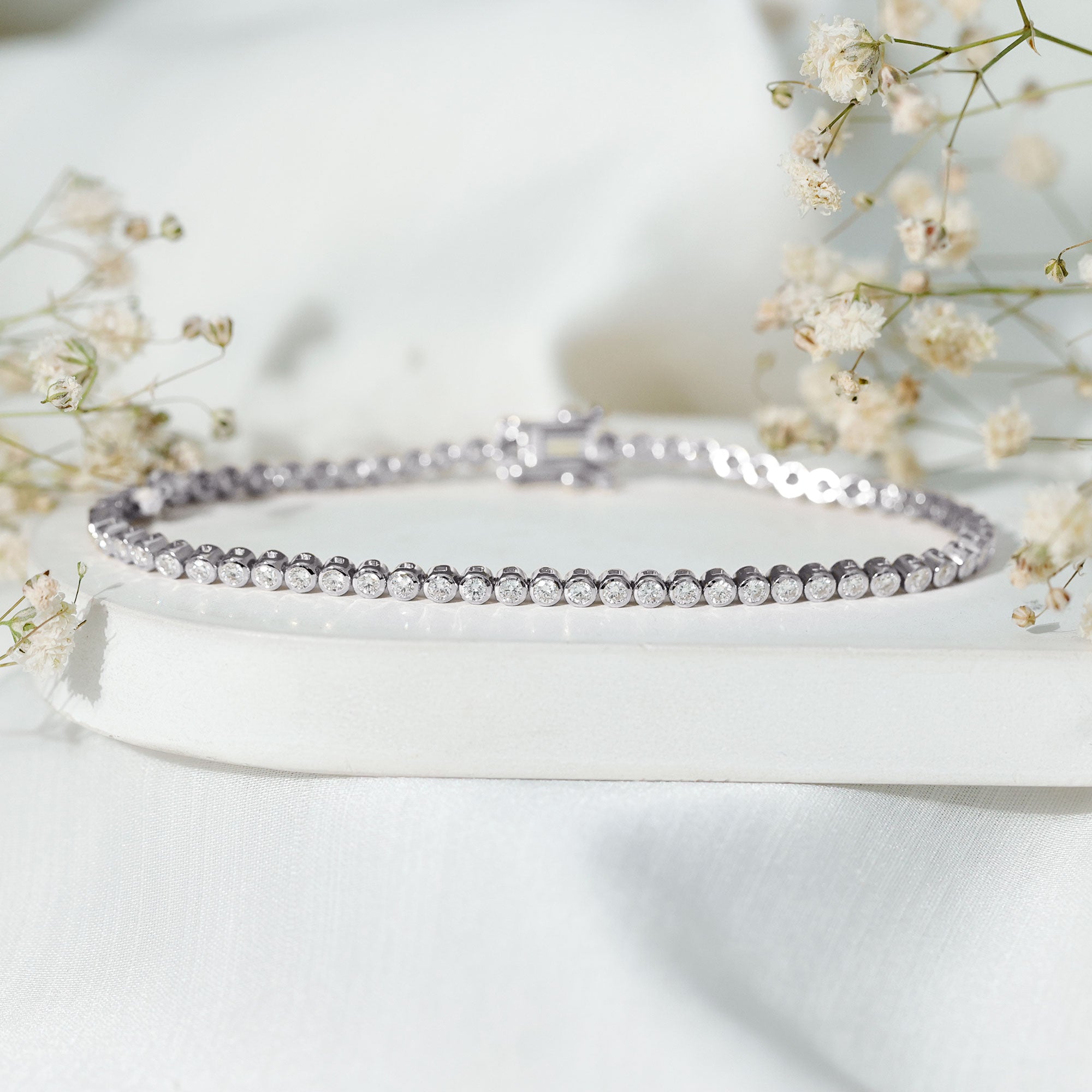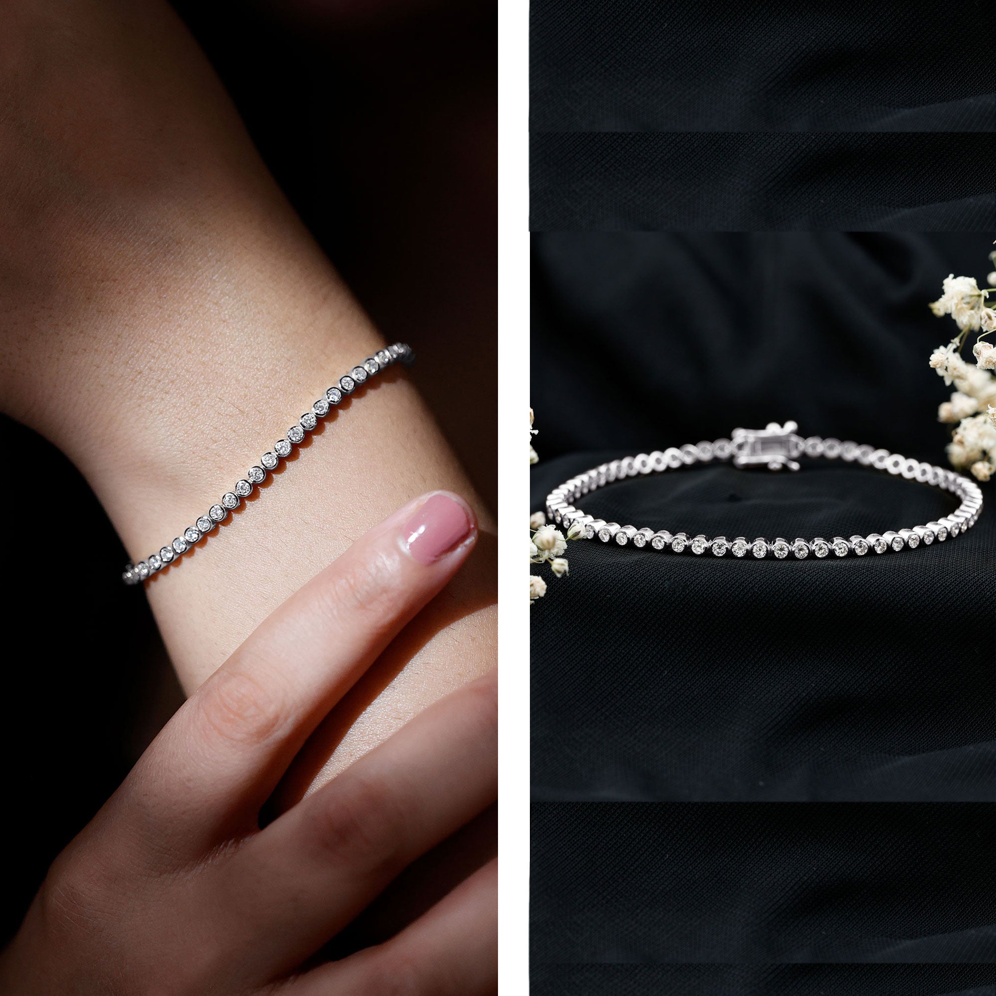 The Rosec Jewels Lab Created Diamond Tennis Bracelet is the perfect accessory to make you dazzle at any evening event. This stunning piece features a continuous row of EF-VS quality lab-grown diamonds. Each stone is beautifully framed in a secure bezel setting, enhancing its brilliance. The Eternity Bracelet is equipped with a box-with-tongue-and-safety clasp, ensuring a snug and comfortable fit for all-day wear. Symbolizing love, strength, and endless possibilities, it makes a thoughtful gift for yourself or someone special. Lightweight and versatile, this Bezel Set Tennis Bracelet adds just the right amount of sparkle without being too much. You can also pair it with another bracelet for a fashionable stacked effect.