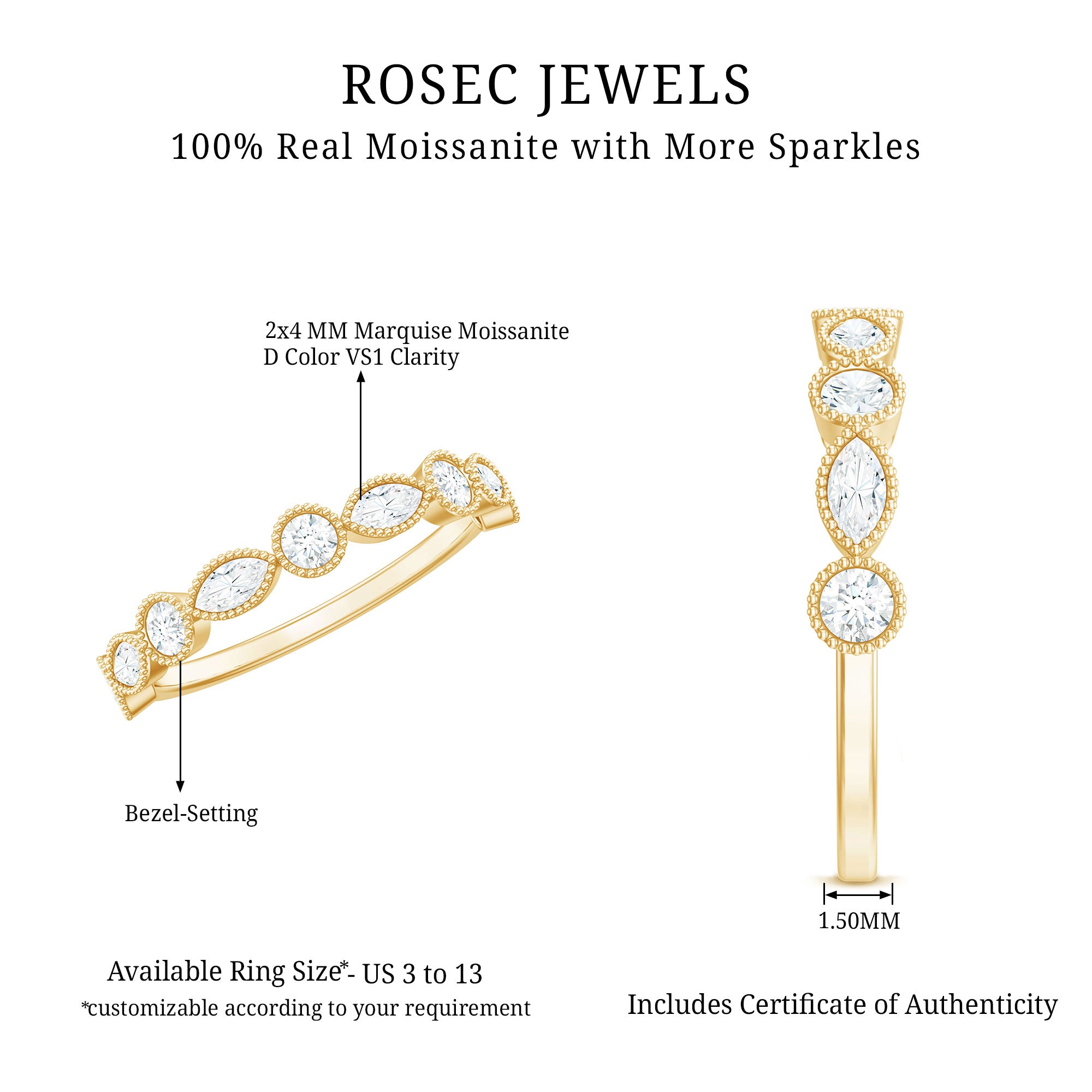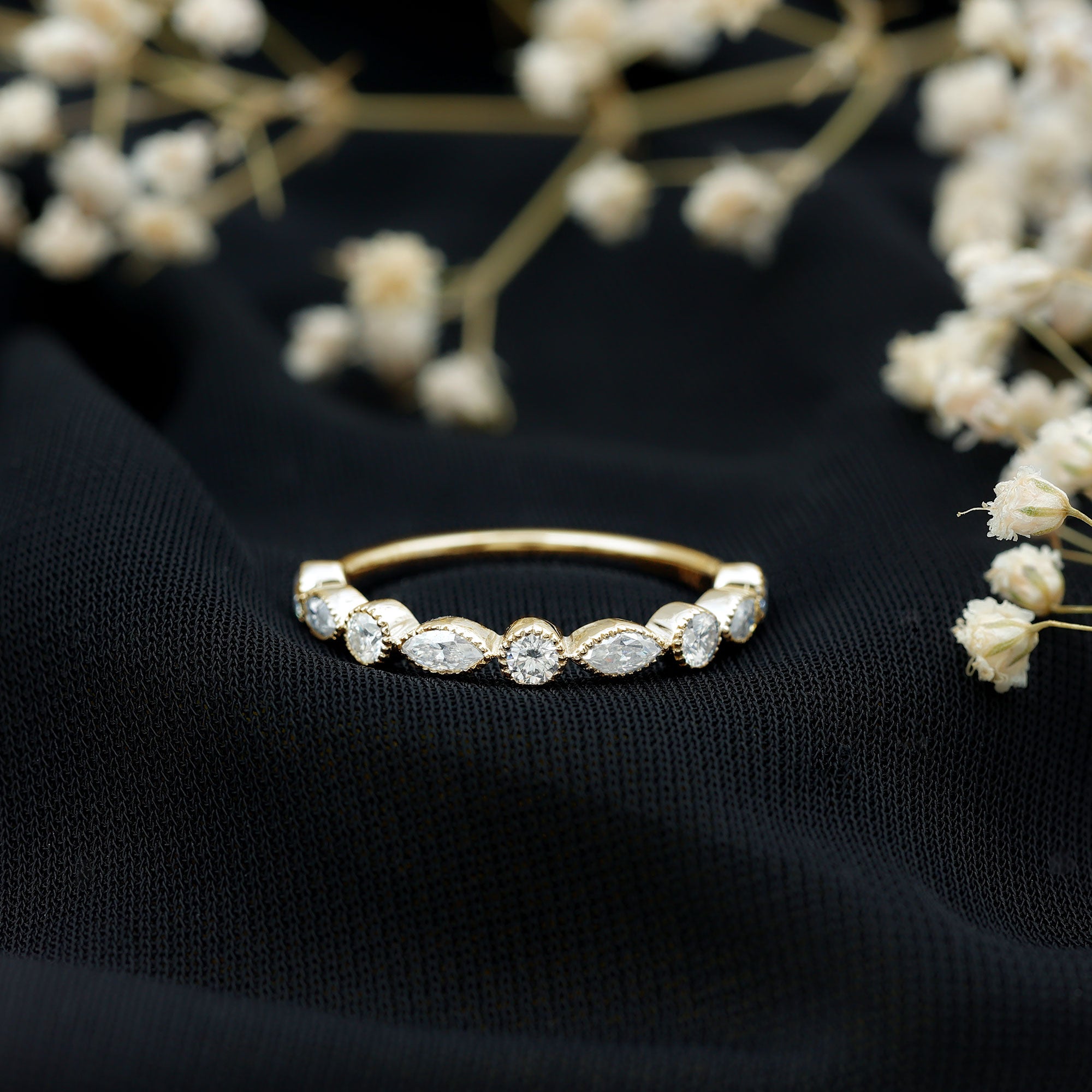This exquisite Moissanite Half Eternity Ring is a timeless expression of elegance, crafted with a unique blend of classic detail and contemporary design. Set with alternating round and marquise shaped moissanite stones, each gem is securely nestled in beaded bezel setting that adds a vintage-inspired charm while offering excellent protection and durability. What makes this Moissanite Wedding Band truly distinctive is its textured beaded detailing that surrounds each stone. The elegant half-eternity style creates a harmonious flow of sparkle across the top of the band, making it ideal for both stacking and solo wear. This Bezel Set Eternity Ring is available in a variety of metal types and color finishes, allowing you to create a piece that reflects your unique taste. Whether you are designing it as a wedding band, anniversary gift, or a meaningful treat to yourself, this Moissanite Stackable Ring can be tailored to your preference with ease. Symbolizing everlasting love and thoughtful design, this Moissanite Eternity Ring is more than just a piece of jewelry, it is a personal statement of elegance, made to shine for a lifetime.