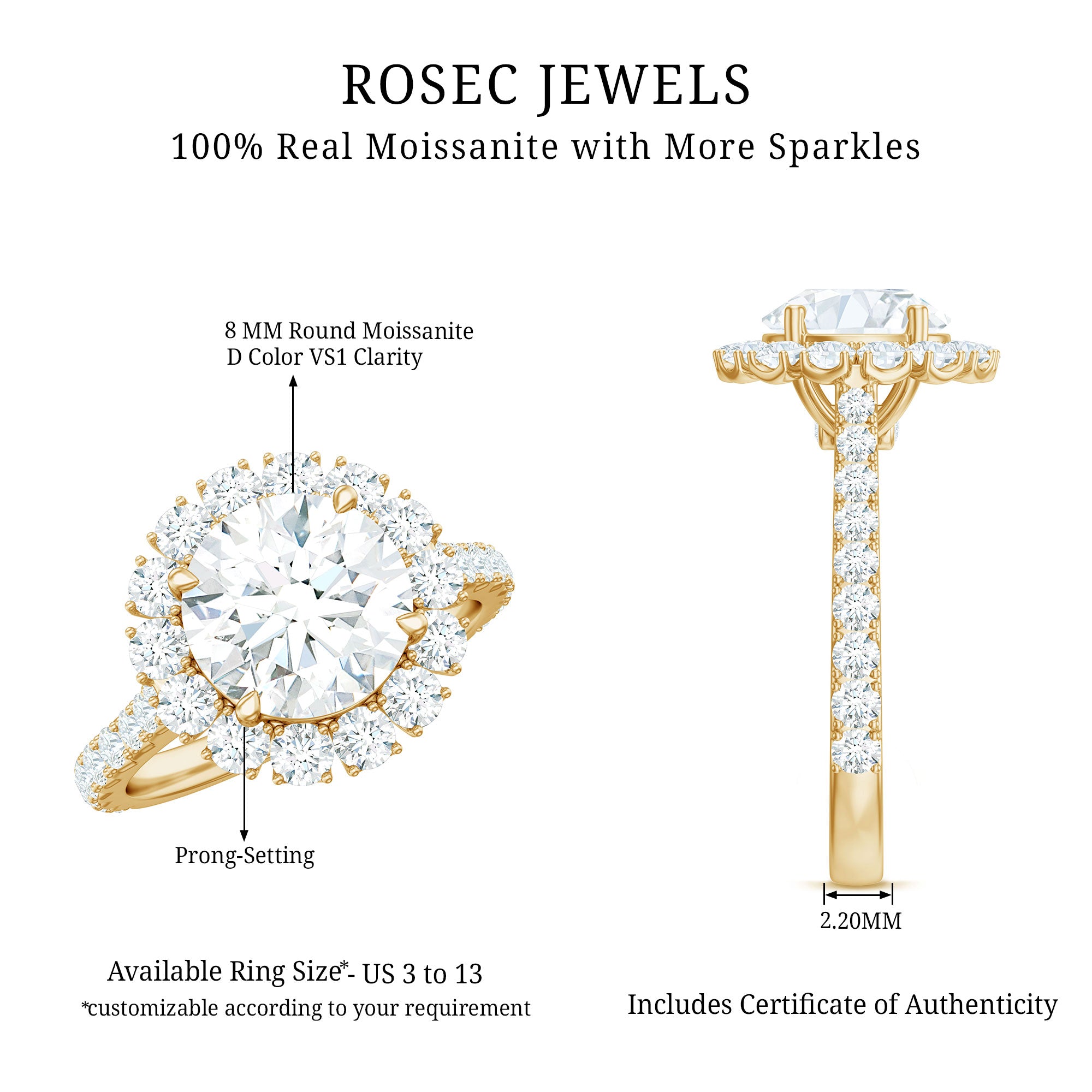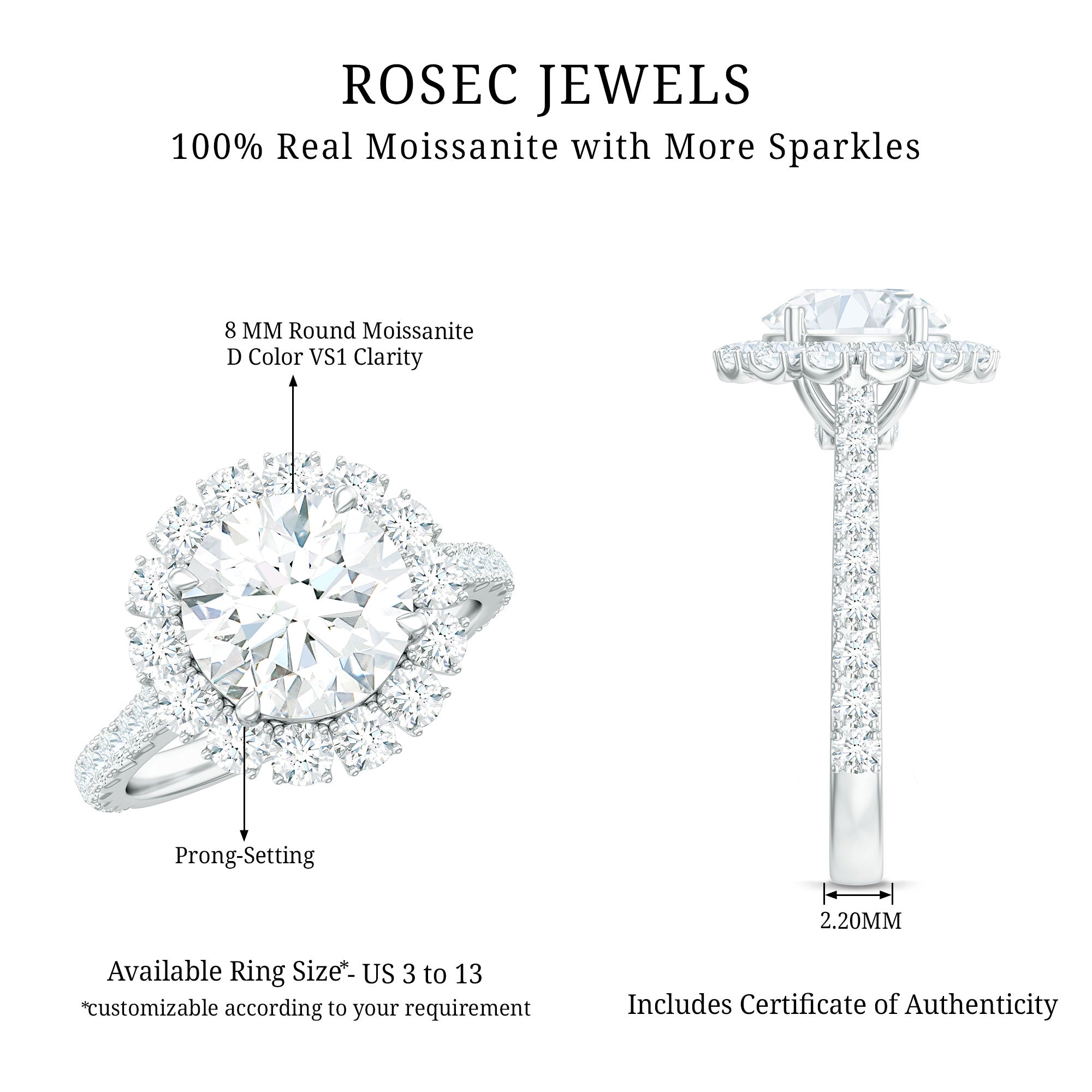 Turn heads with this Round Moissanite Engagement Ring, crafted to shine with timeless elegance and thoughtful details. At the center is a dazzling 8 MM round moissanite, surrounded by a beautiful halo of smaller stones, which adds extra shine and gives the Traditional Engagement Ring a bright, glamorous look from all sides. The halo design not only makes the center stone appear larger but also adds a touch of luxury. The band is carefully lined with tiny round moissanites that go halfway around the ring, bringing even more sparkle to the overall design. Whether you are looking at it from the top or the side, every angle glows with elegance. A special surprise lies beneath the center stone, a hidden moissanite tucked into the setting, adding a sweet and romantic detail that only you or your loved one know. It is a thoughtful touch that makes the Halo Engagement Ring even more special. This 2 Carat Moissanite Ring is a beautiful way to mark your love story. With its elegant style, lasting sparkle, and delicate craftsmanship, it is a symbol of love, commitment, and the moments that matter most. Perfectly packaged in a lovely jewelry box, this Moissanite Halo Ring is ready to create a memory that lasts forever.