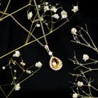 Warm golden tones meet effortless elegance in this Citrine Pendant Necklace designed to capture the essence of November’s birthstone. A vibrant 8X10 MM pear cut citrine of AAA quality takes center stage, full of personality and symbolic meaning like joy, abundance, and vitality. Surrounding the center stone is a brilliant halo of lab grown diamonds (EF-VS quality), carefully set to enhance the depth and fire of the citrine. Just above the teardrop shape, a single round lab grown diamond creates a smooth transition from the stone to the sleek silver bail. Crafted in 14k yellow gold plated sterling silver, the Teardrop Necklace offers a polished finish with durability that is built for daily wear. The sturdy cable chain sits comfortably against the skin and holds the Citrine and Diamond Necklace in place with subtle elegance. Great for meaningful gifting or simply elevating your everyday style, the Pear Shaped Necklace arrives in a beautifully designed signature box, ready to become a favorite piece in any jewelry collection. With its glowing color and delicate sparkle, the Halo Necklace makes a thoughtful choice for birthdays, milestones, or personal moments that deserve a little shine.