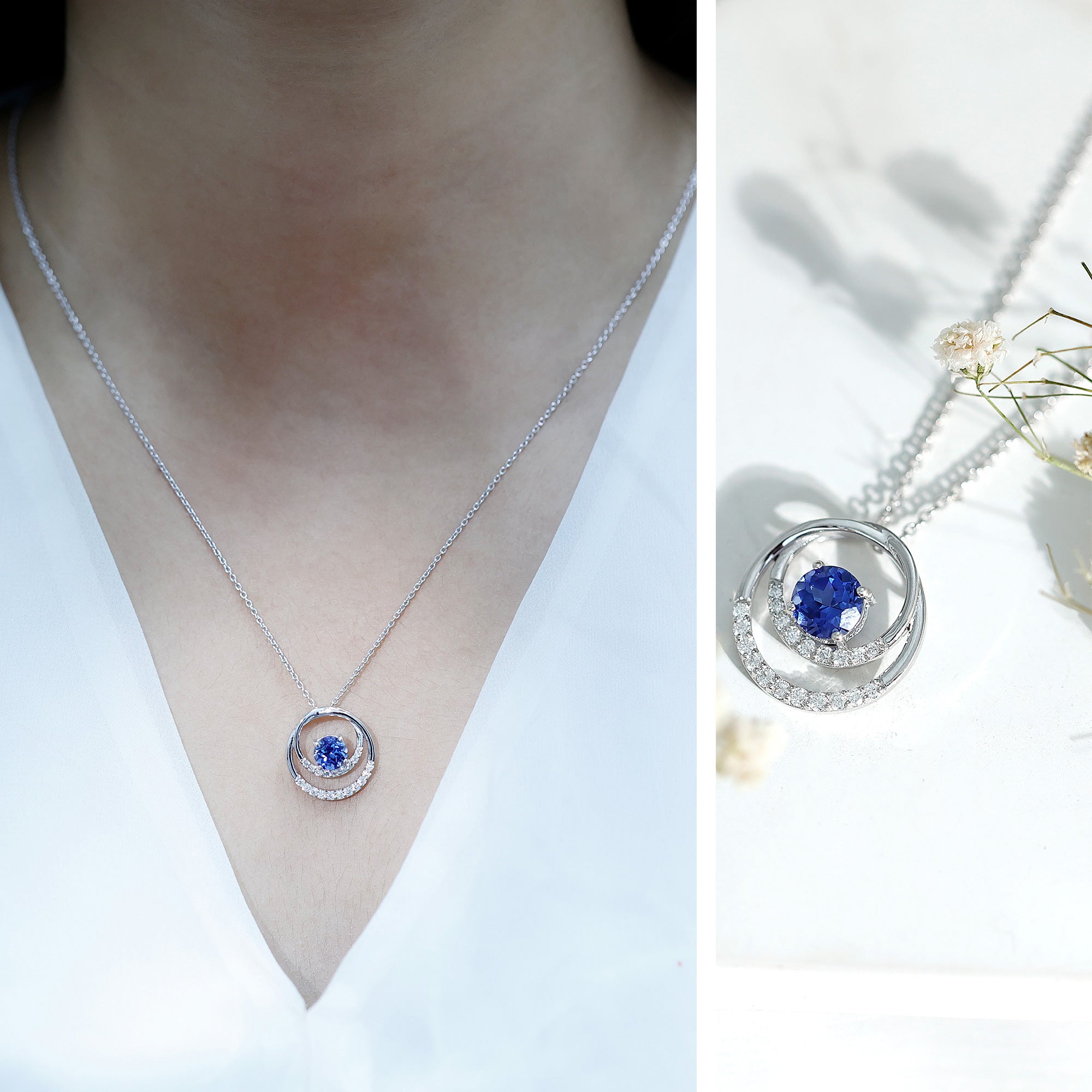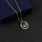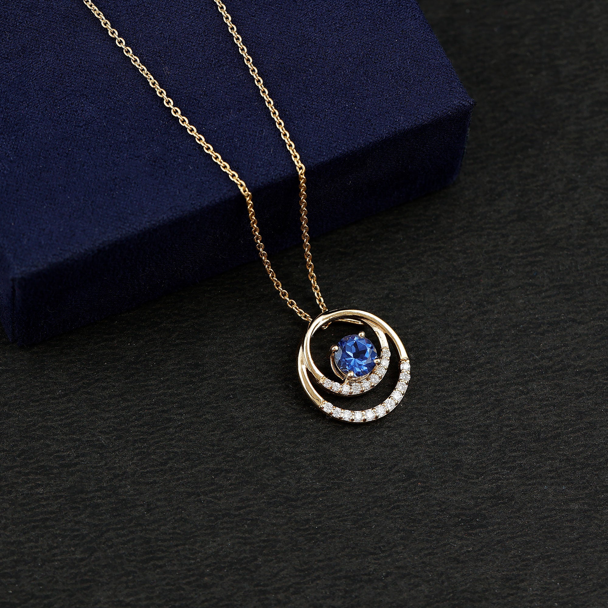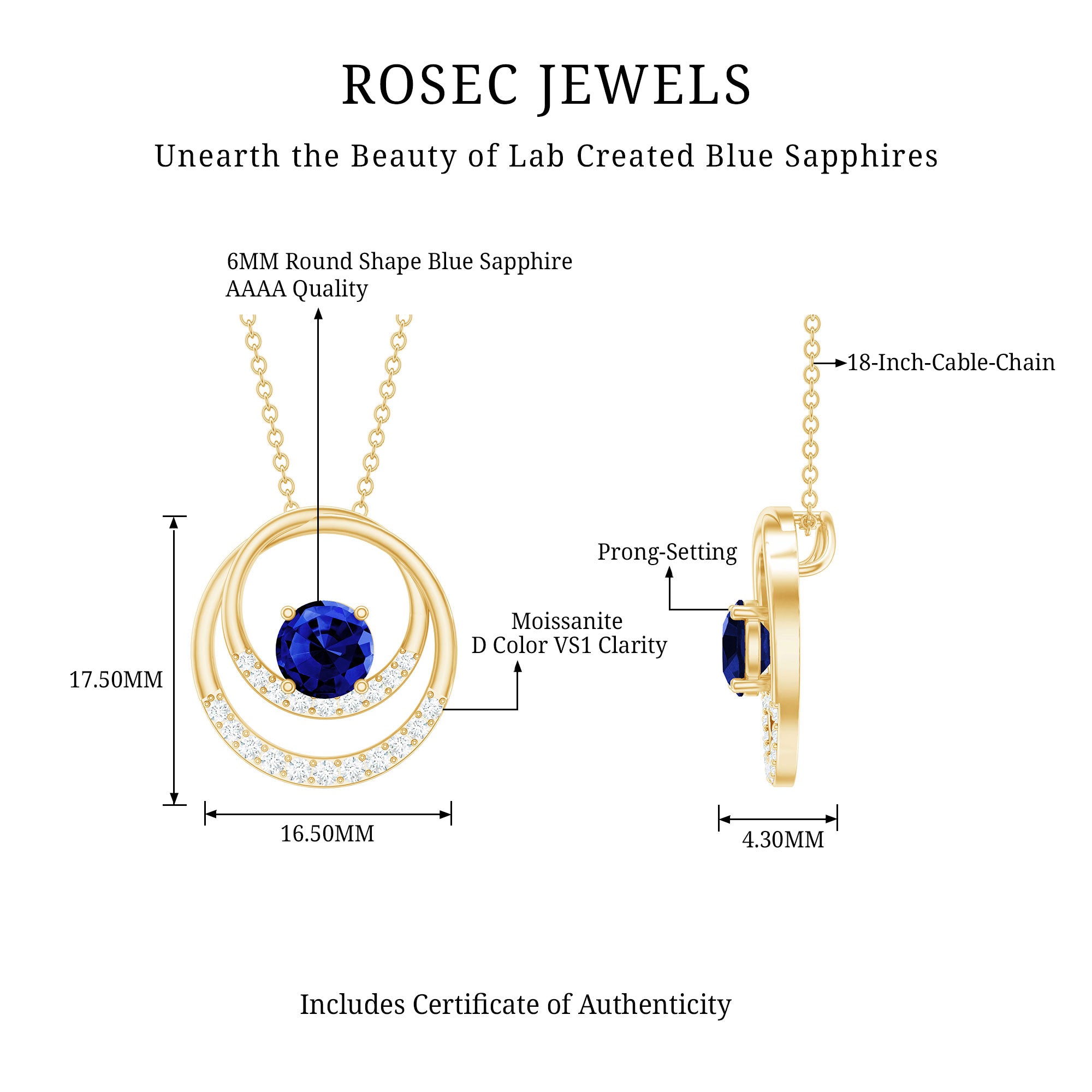 If you want to fortify your relationship and make it enduring, consider our Created Blue Sapphire Pendant Necklace as the ideal option. The necklace boasts a 6 MM Round Cut Created Blue Sapphire securely held in a Prong Setting and encircled by dazzling Round Moissanite on an open circle pendant.