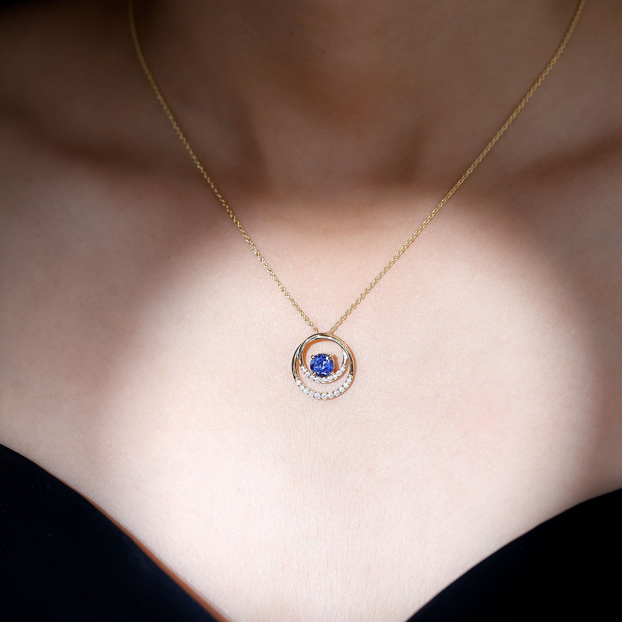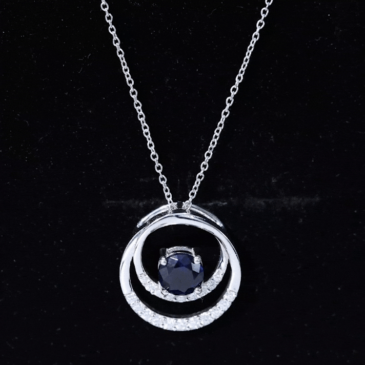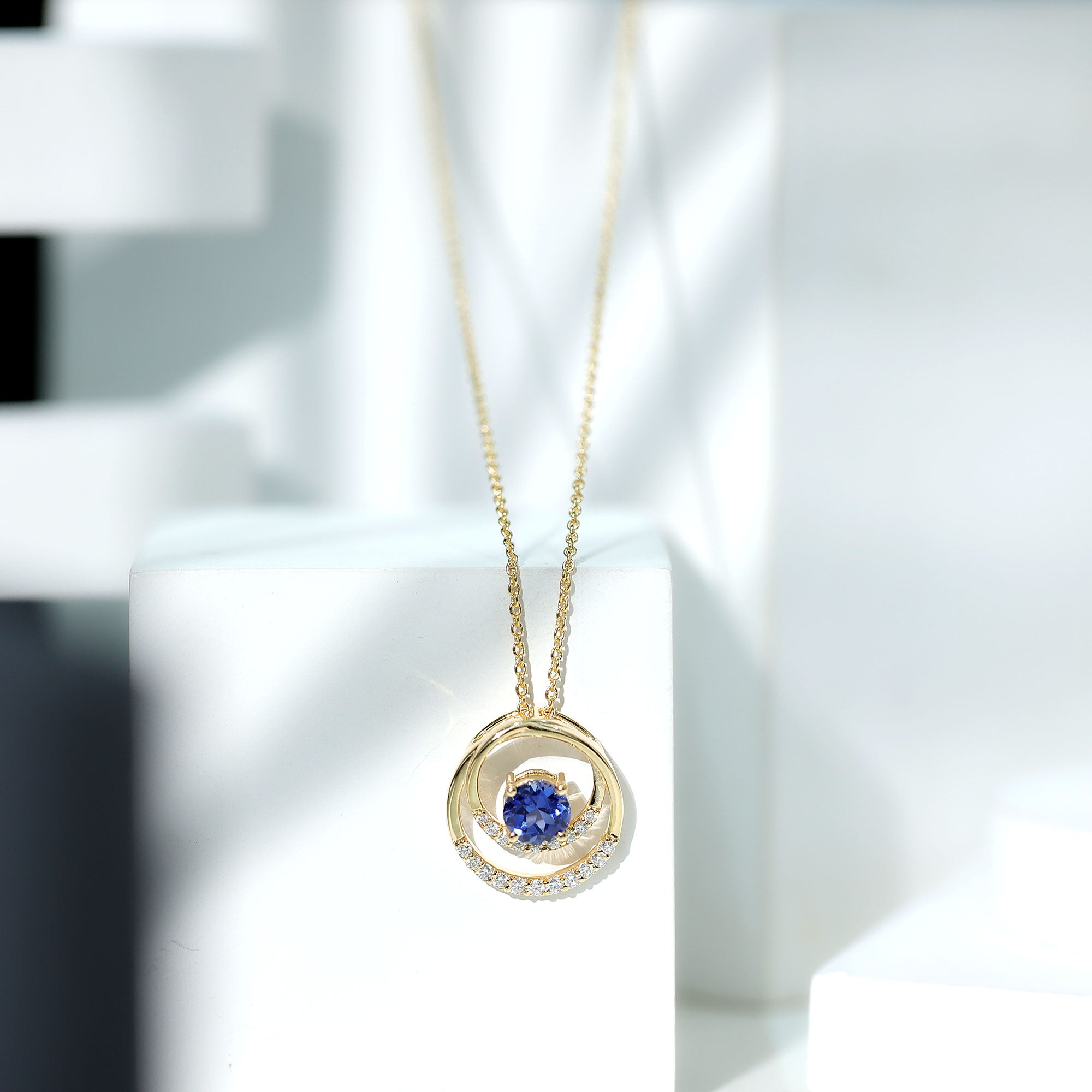 If you want to fortify your relationship and make it enduring, consider our Created Blue Sapphire Pendant Necklace as the ideal option. The necklace boasts a 6 MM Round Cut Created Blue Sapphire securely held in a Prong Setting and encircled by dazzling Round Moissanite on an open circle pendant.