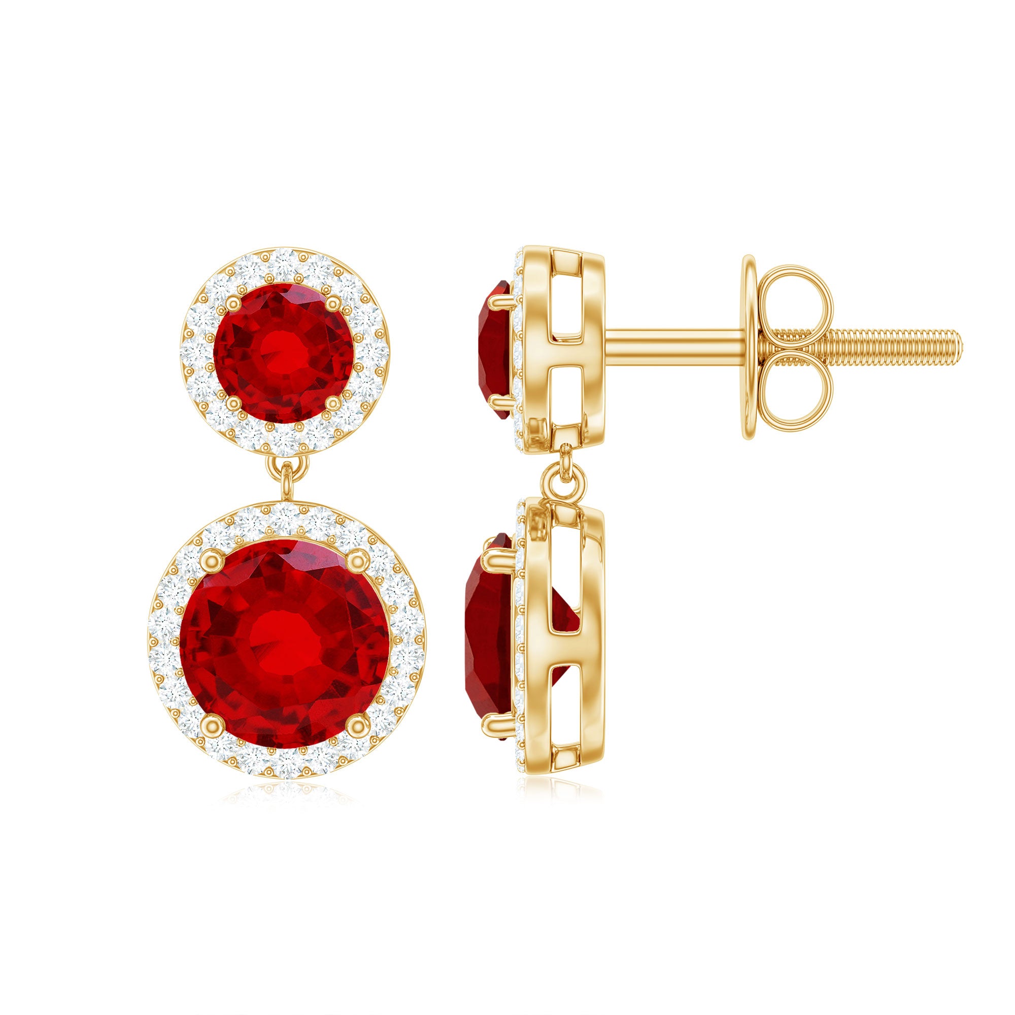 The Halo Dangle Earring is adorned with Round Shape Created Ruby and Diamond. This Created Ruby Dangle Earring will be a perfect piece for your wife on your Anniversary.