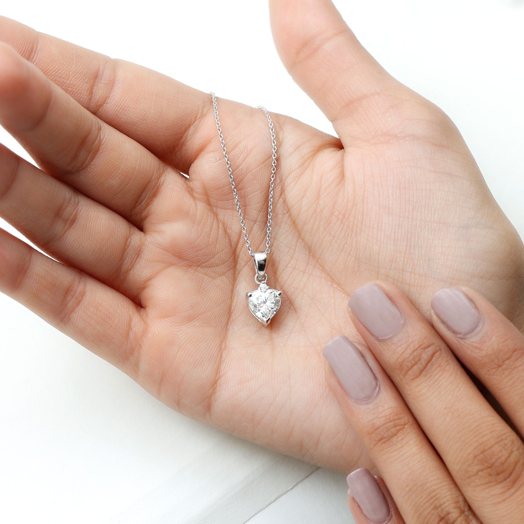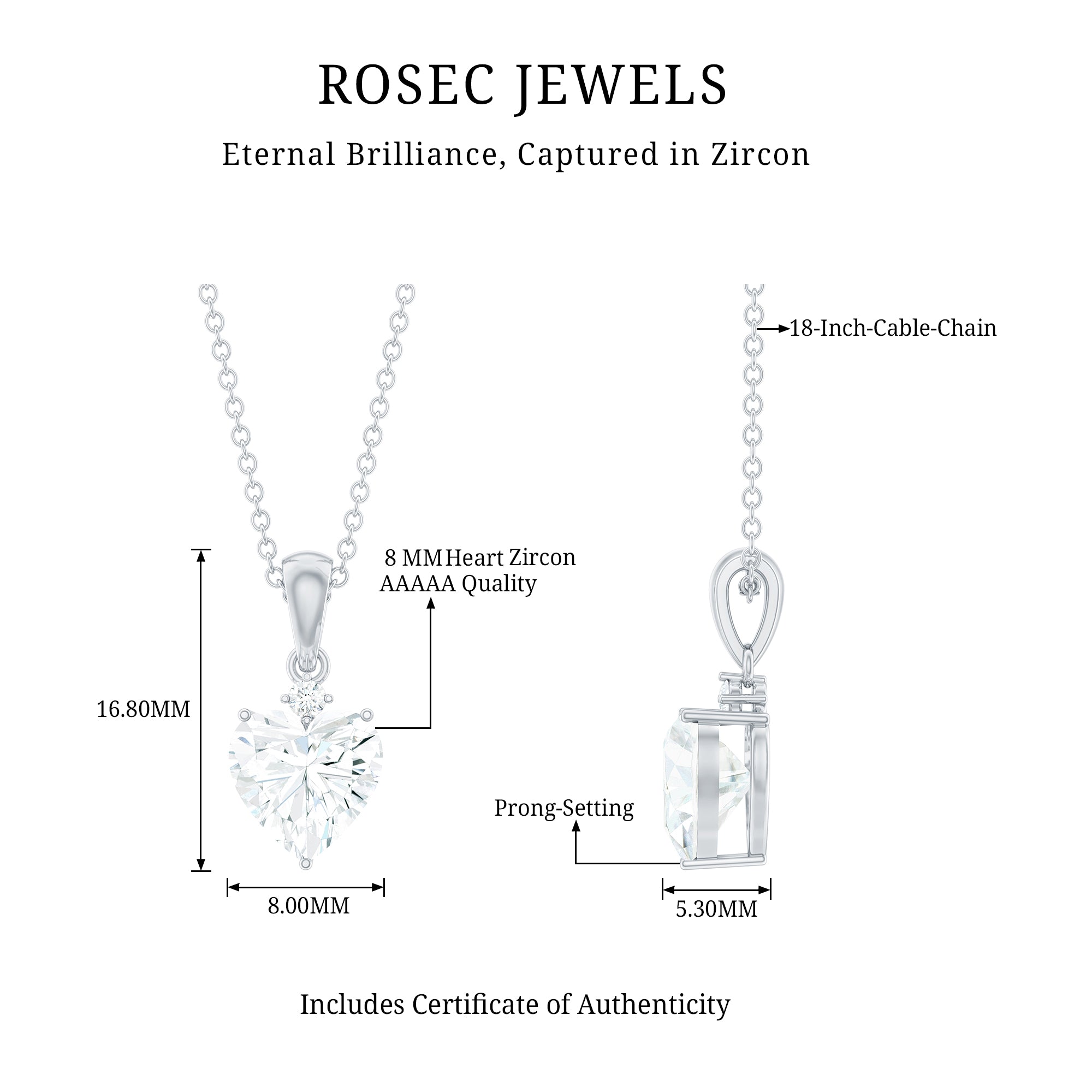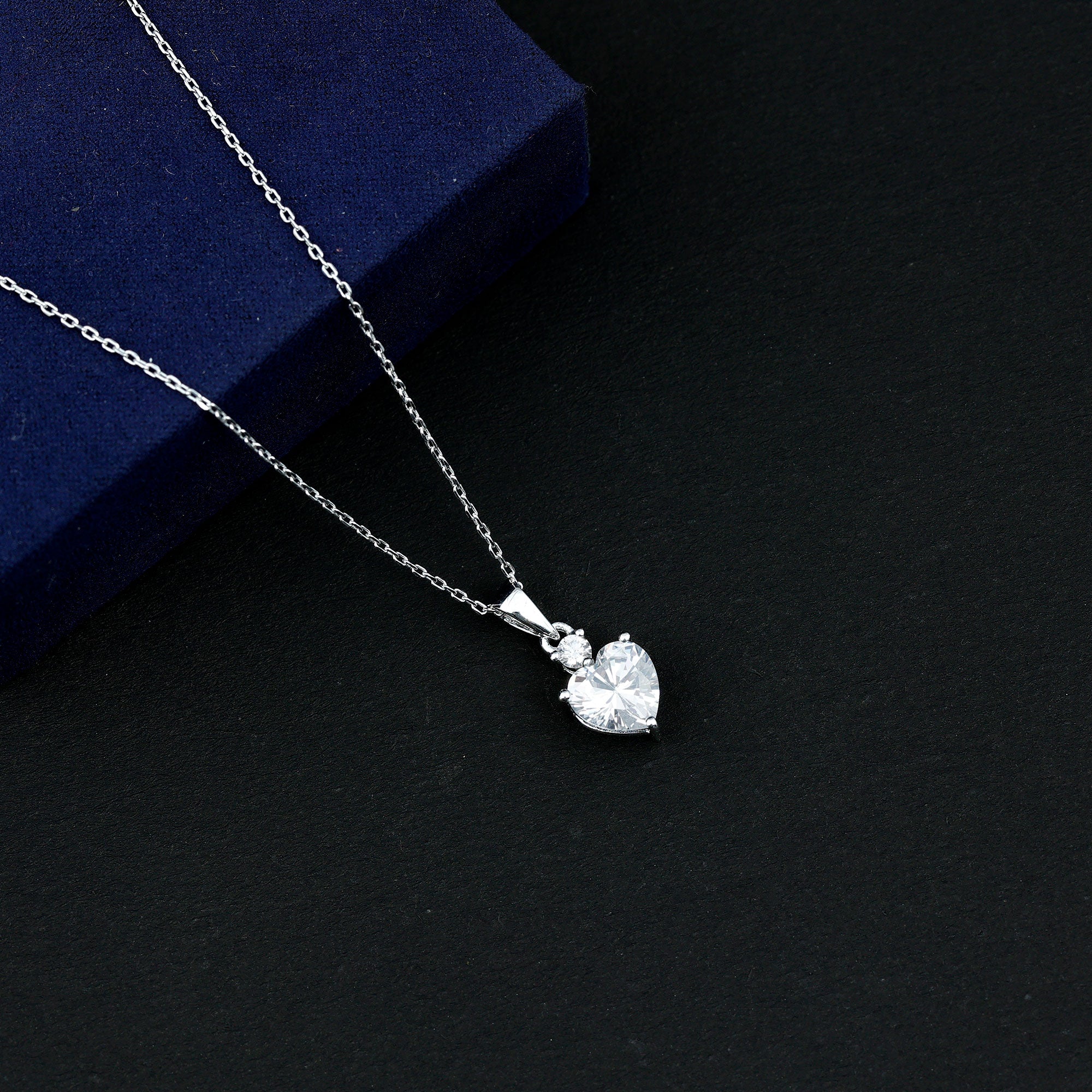 Present this CZ Heart Pendant as a token of love on a special occasion. The pendant is crafted with 14K White Gold Plated Silver and features an 8 MM Heart Shape Zircon securely placed in Prong Setting. The main stone is topped with a smaller Round Shape stone, which amplifies the beauty of the pendant and is dropped down from a Standard Bail. This Solitaire Pendant dangles with a sturdy cable chain that makes it beautifully sit on the neckline. This Zirconia Pendant Chain will be delivered to you in a premium quality velvet pouch with the certificate of authenticity. This Heart Chain Pendant is a perfect gifting option to present on occasions like Valentines, Anniversary or Birthday.
