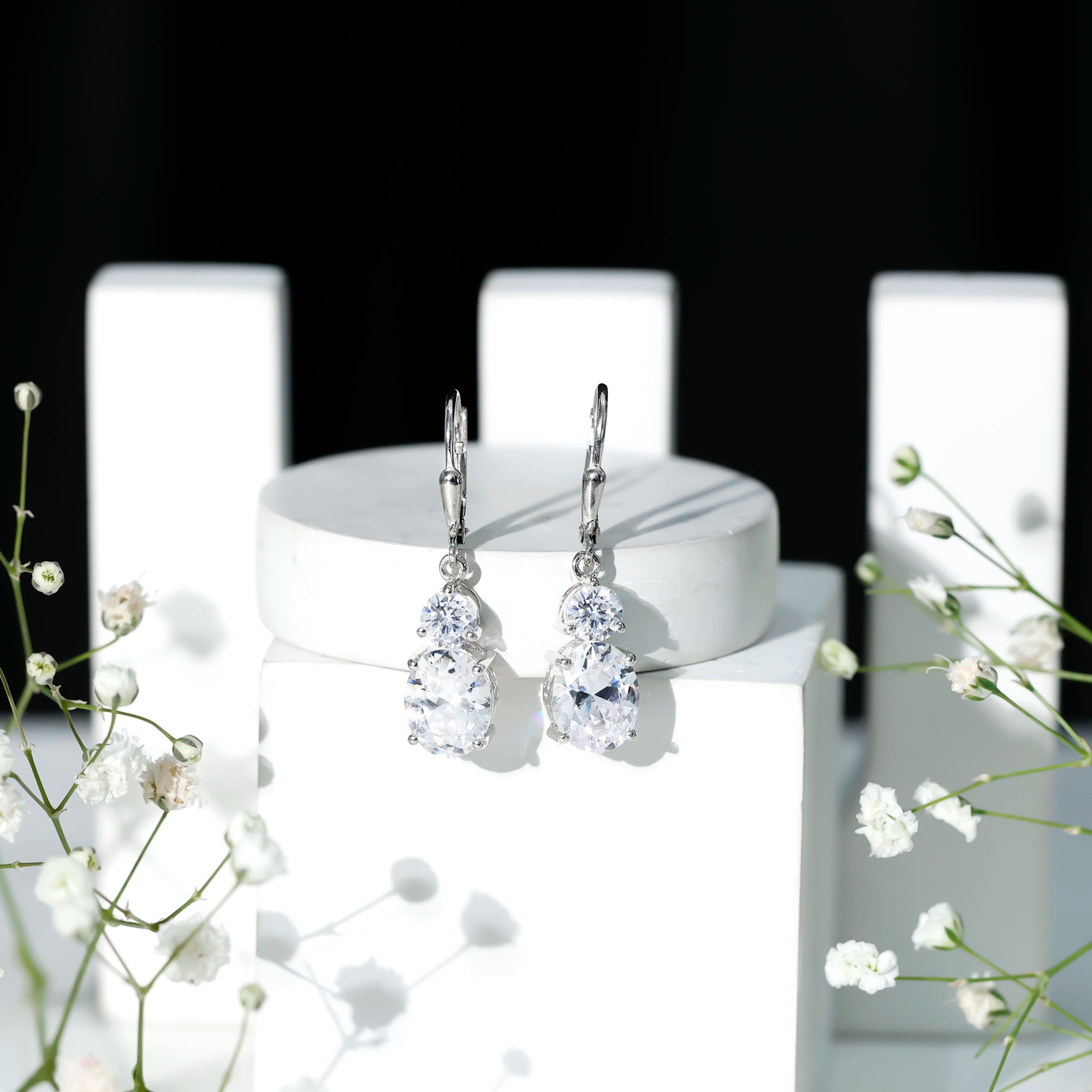 Embrace your ears with these CZ Drop Earrings, which add shimmer and grace to the overall look. The 2 Stone earrings feature an 8X10 MM Oval Shape Zircon of AAAA Quality and are topped with a smaller round shape stone. These Silver Dangle Earrings will complement the outfit as a wedding guest or can be styled for cocktail parties. The unmatchable shine of Cubic Zirconia not only completes the outfit but also boosts confidence. These Lever Back Earrings can be a perfect gift option for your mother, wife, or sister on their special days. The earrings will be shipped to you in classic packaging, secured in a signature velvet pouch with the certificate of authenticity.