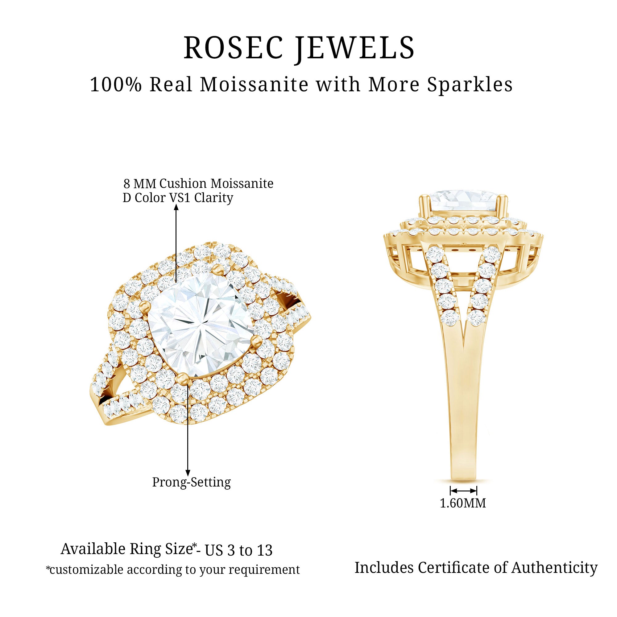 Fall in love with vintage elegance all over again with this stunning Moissanite Engagement Ring. Inspired by old-world charm and timeless beauty, this handcrafted piece is made for classy souls. At its center, an 8 MM cushion cut moissanite sparkles brightly, securely set in prong setting to let its brilliance shine. Surrounding the center stone is a breathtaking double halo of round moissanites, adding extra depth, fire, and shimmer, like a glowing frame around your love story. The split shank design is adorned with delicate round moissanite side stones and intricate detailing that gives this Double Halo Engagement Ring a beautifully antique feel. Perfect for those who appreciate both history and elegance, this 3 Carat Moissanite Ring for Women brings together classic design and modern sparkle. With D color and VS1 clarity moissanite stones, you get all the brilliance and fire you love while choosing a more sustainable and thoughtful alternative to traditional diamonds. Beautifully packaged and available in a variety of metal options and ring sizes, this Vintage Moissanite Ring is ready to become a part of your forever.